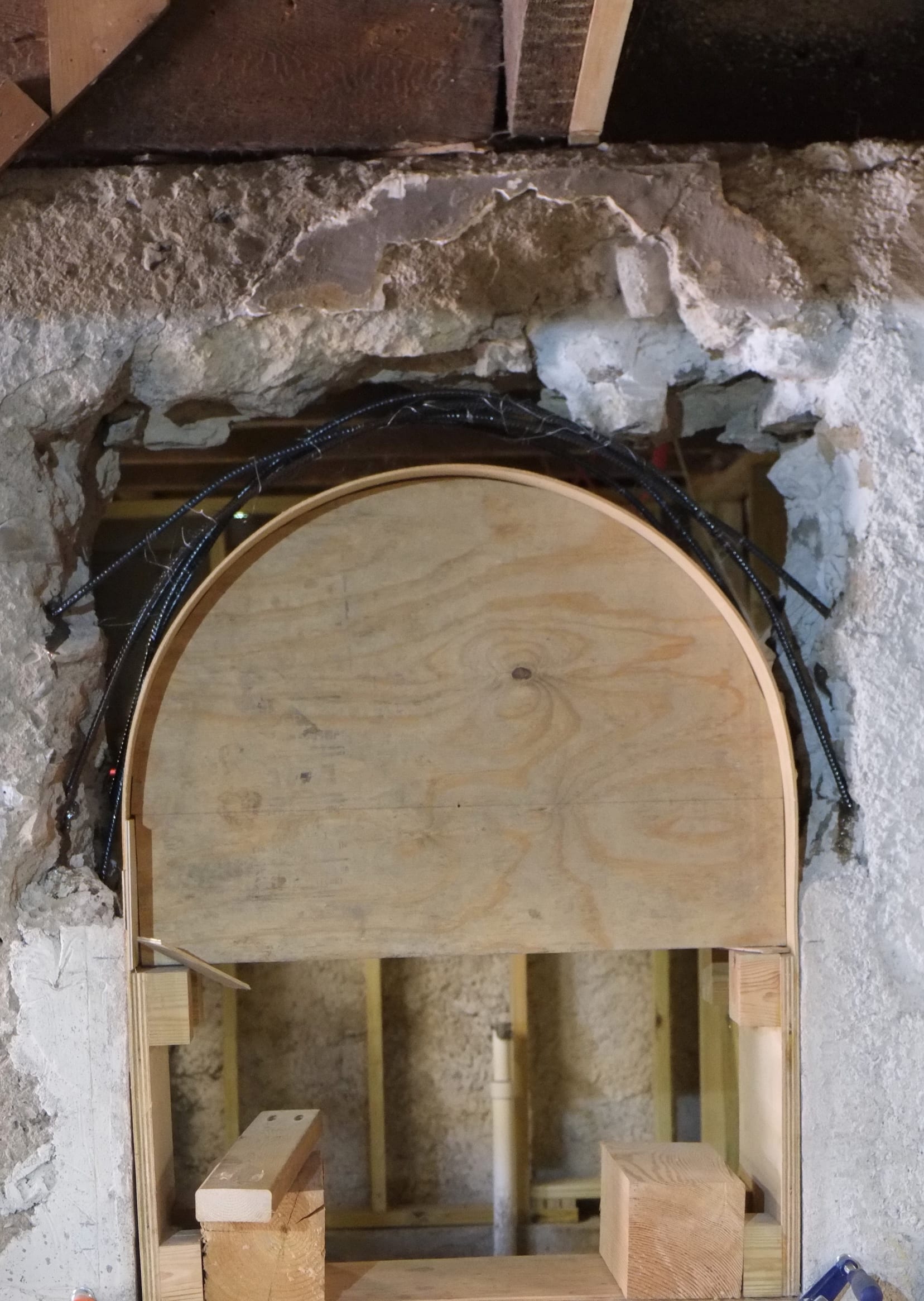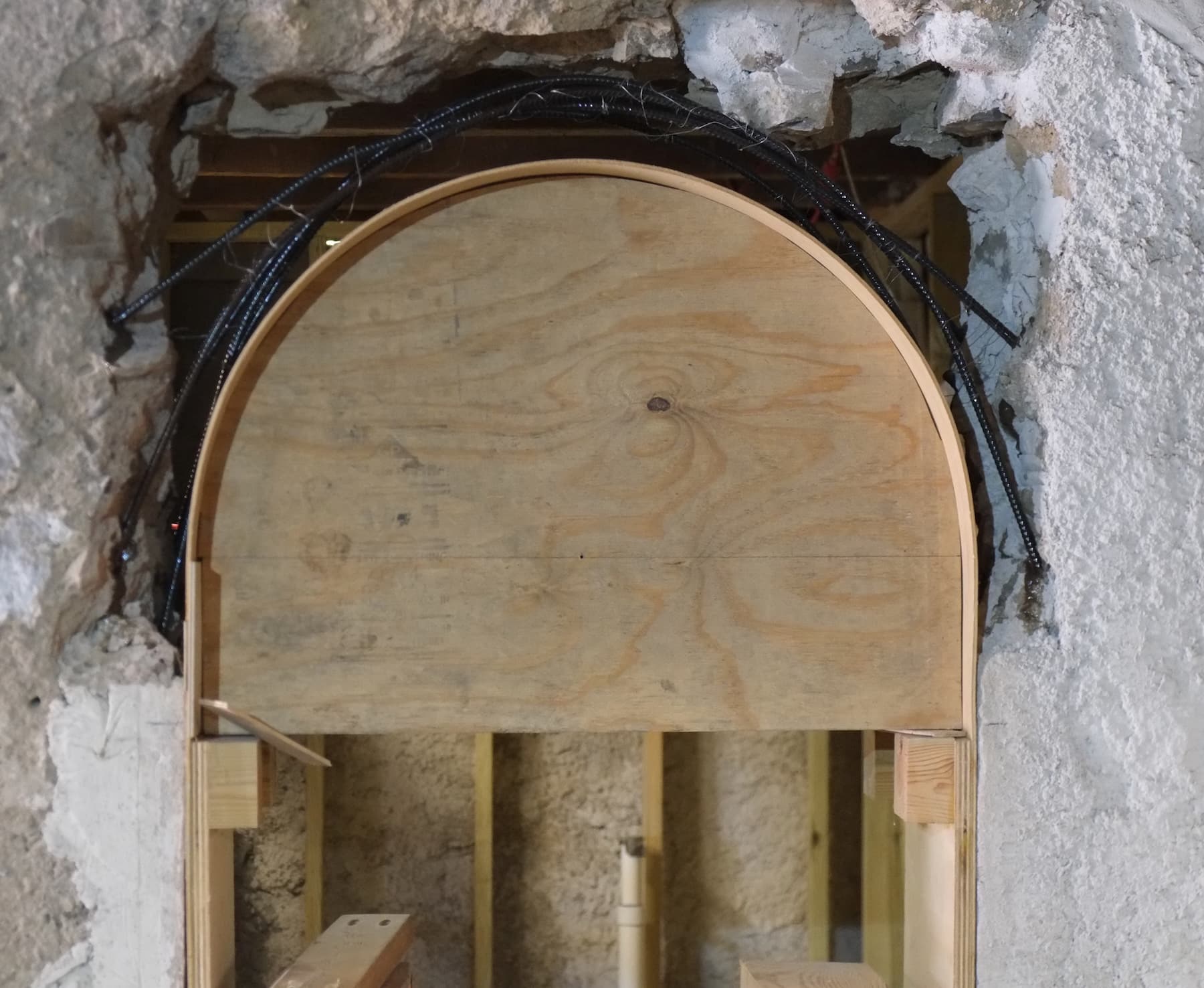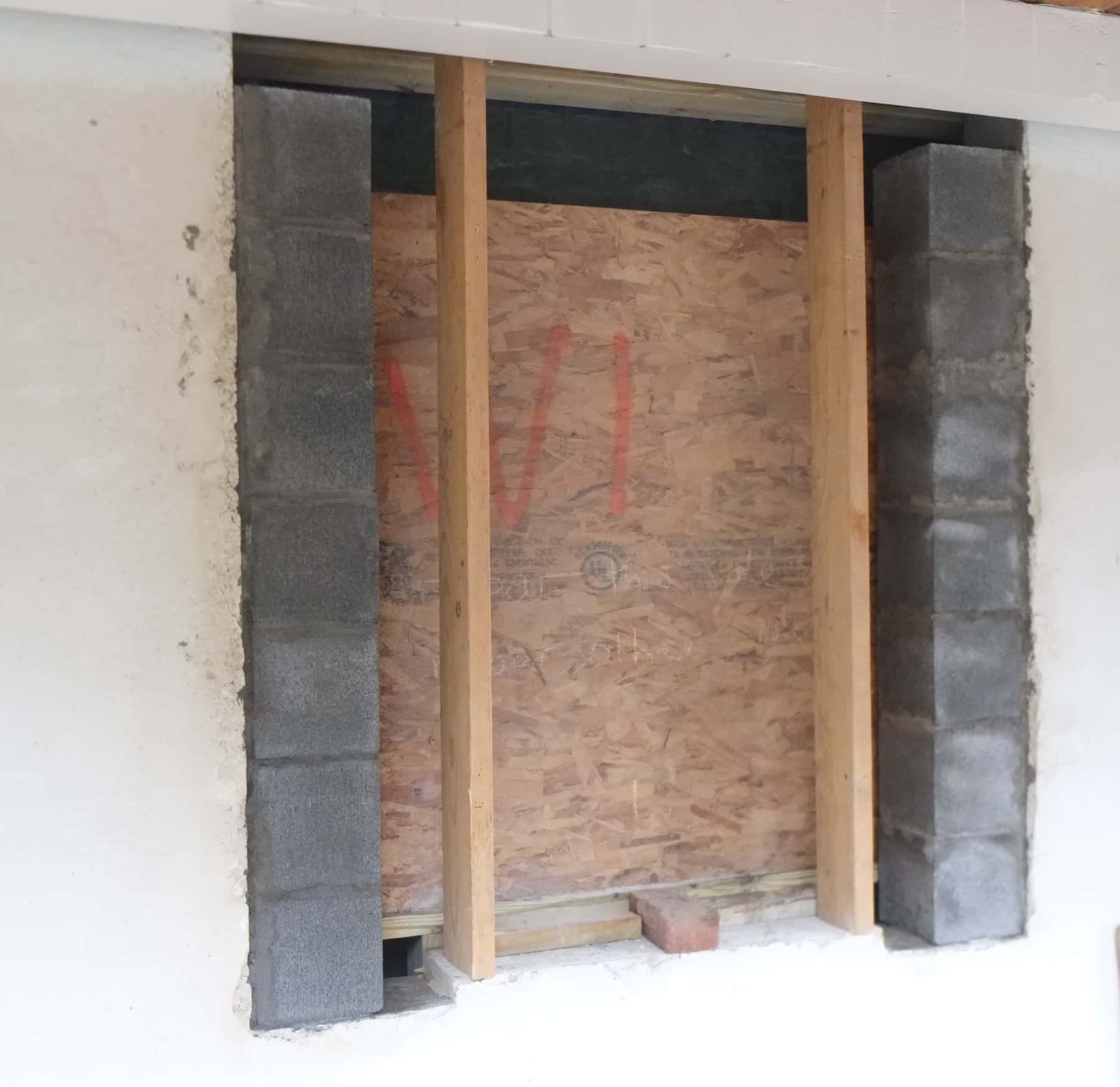 Regarding the lintel, I couldn’t find the right size locally, so I made one myself. To ensure I could lift it, the inner side was pressure-treated wood, and the outer side was concrete, reinforced with rebar. That said, it was still too heavy to install safely from the top of a step-ladder.