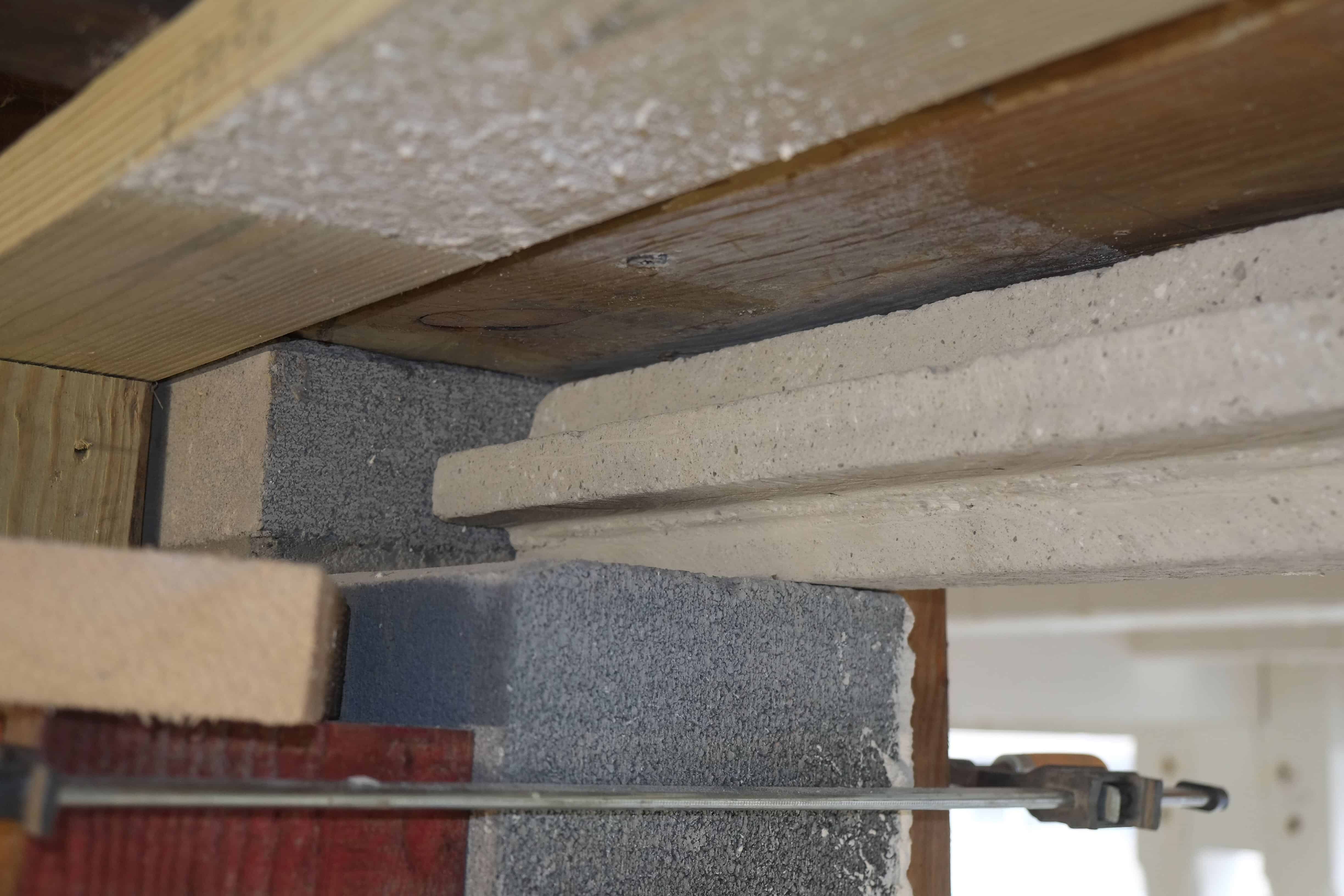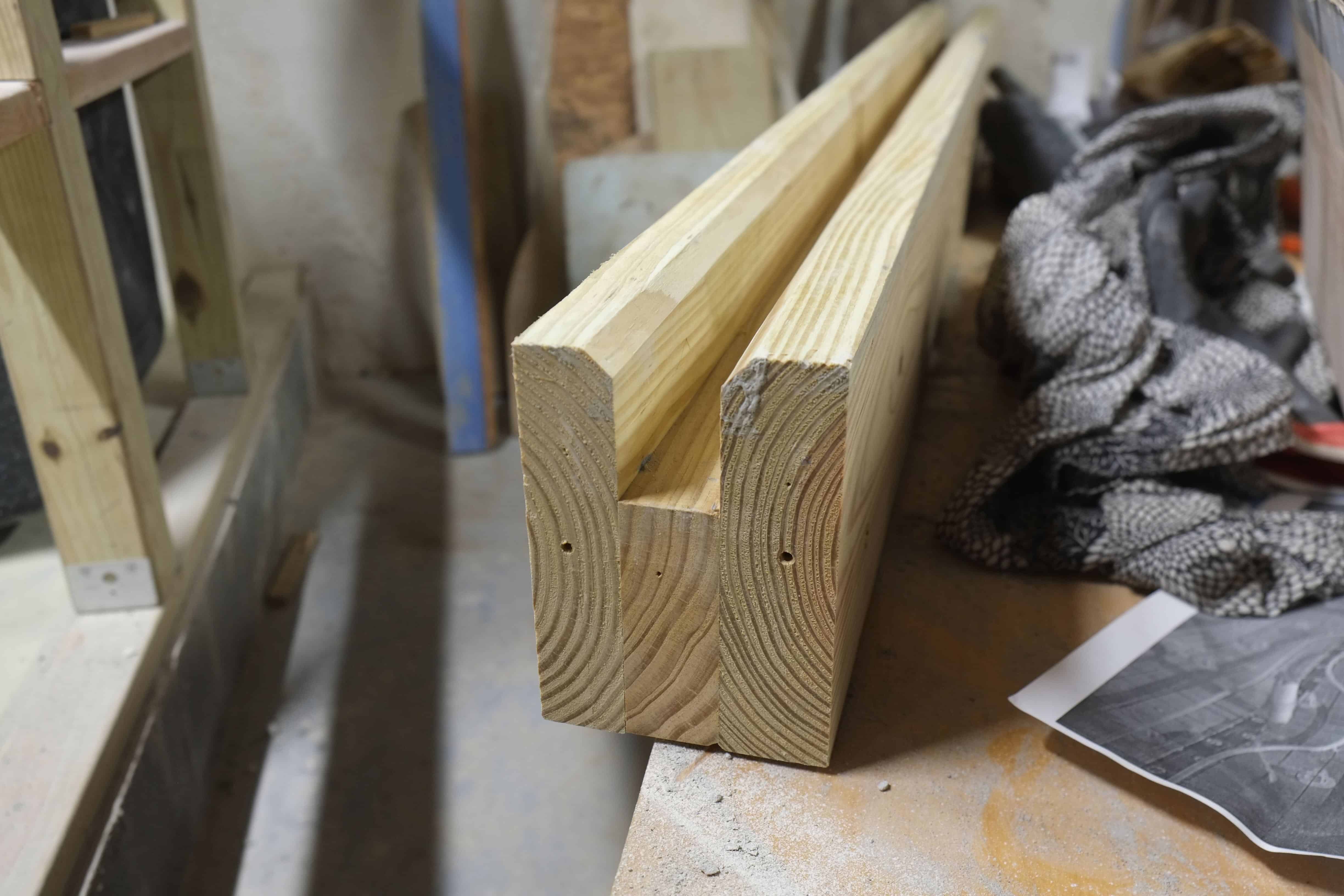 The make the lintel, I first made the wooden section, applied masking tape as a release layer, added shuttering and rebar, and then poured in the concrete. Once the concrete was cured, I prised the two apart so I could lift them separately.