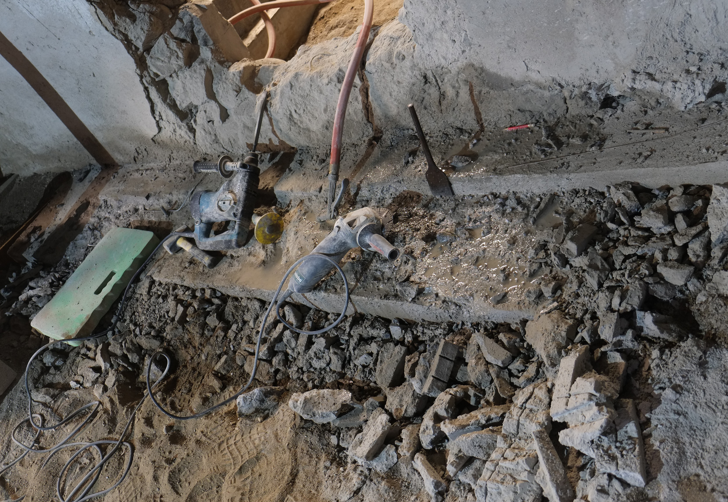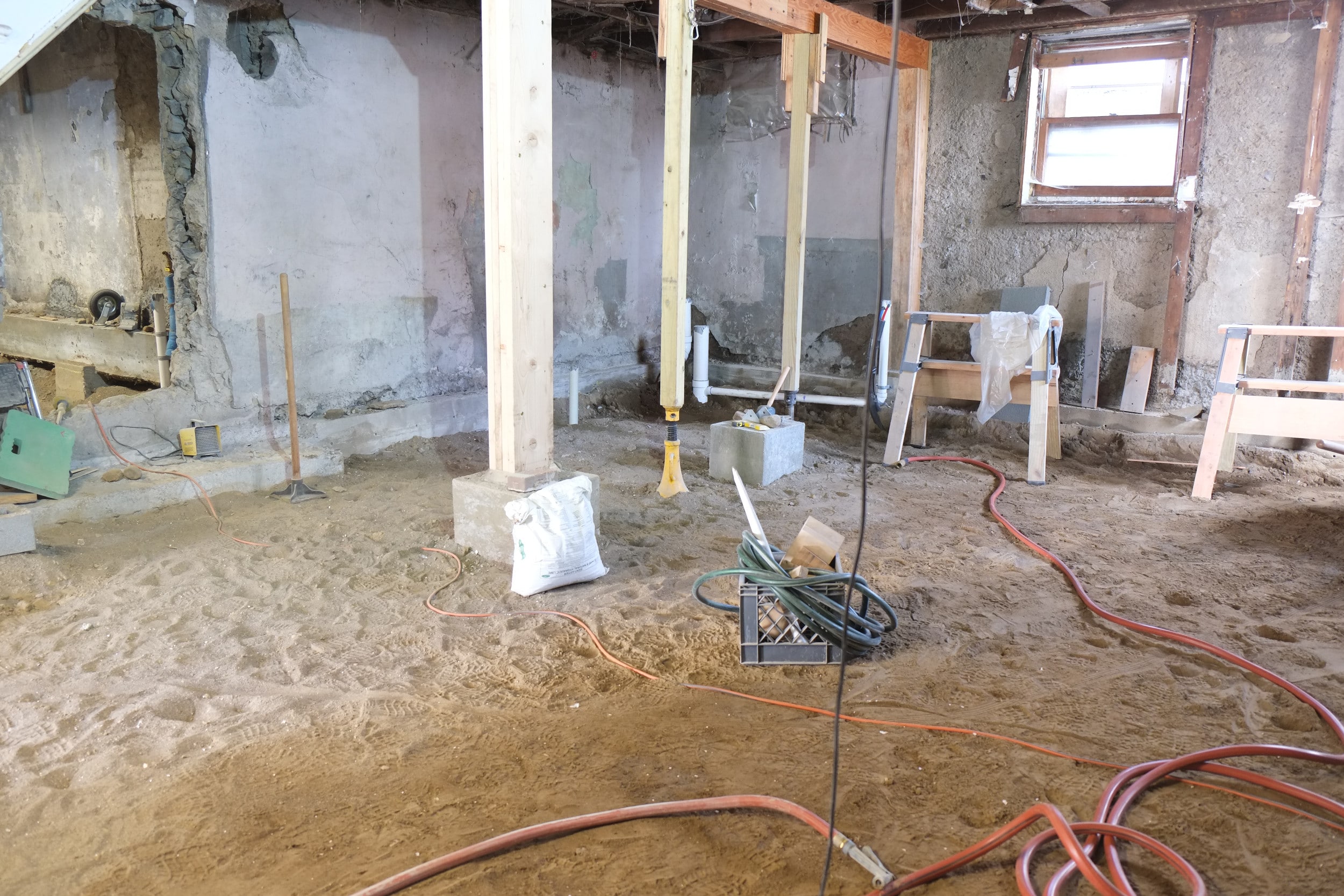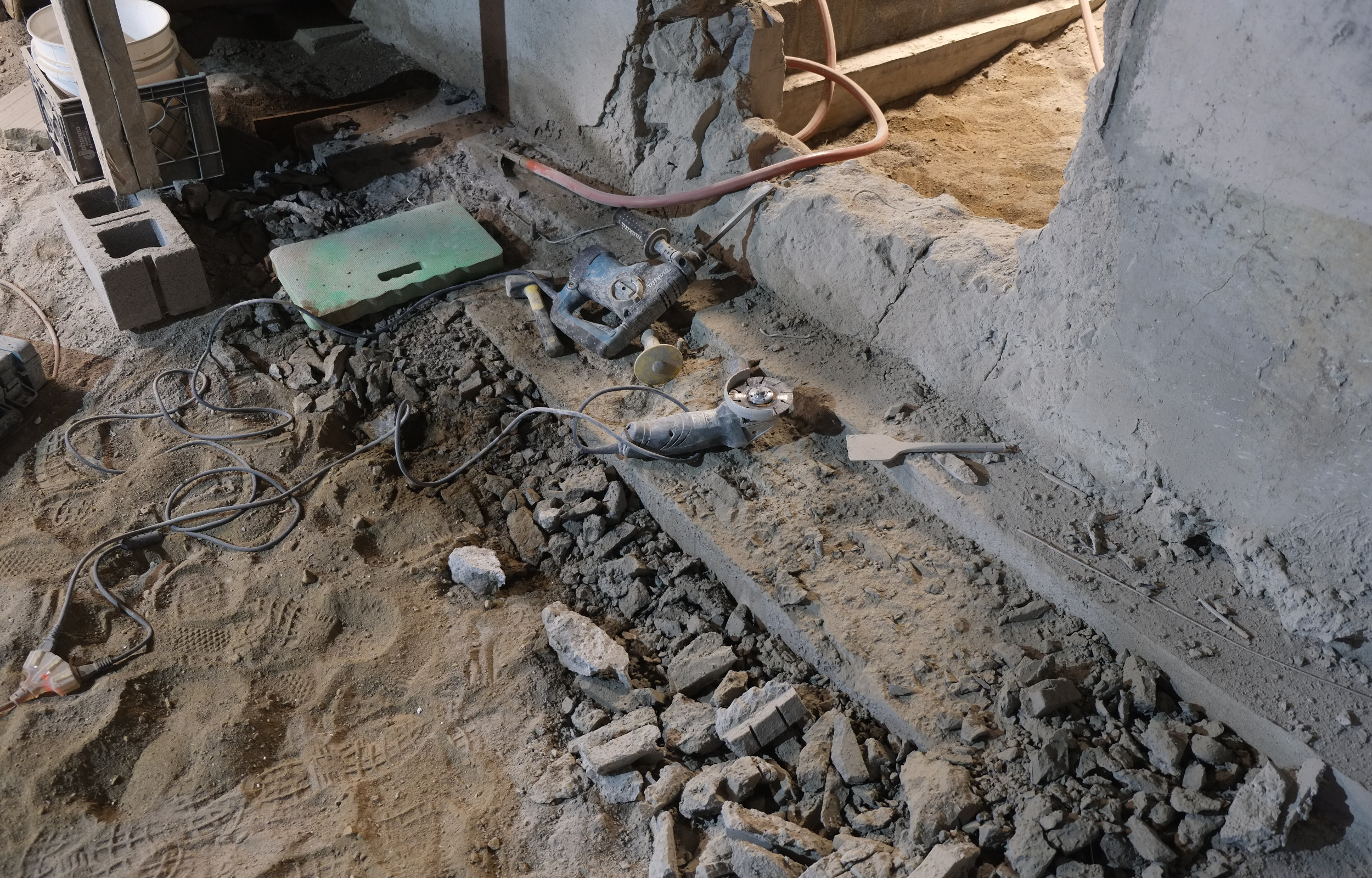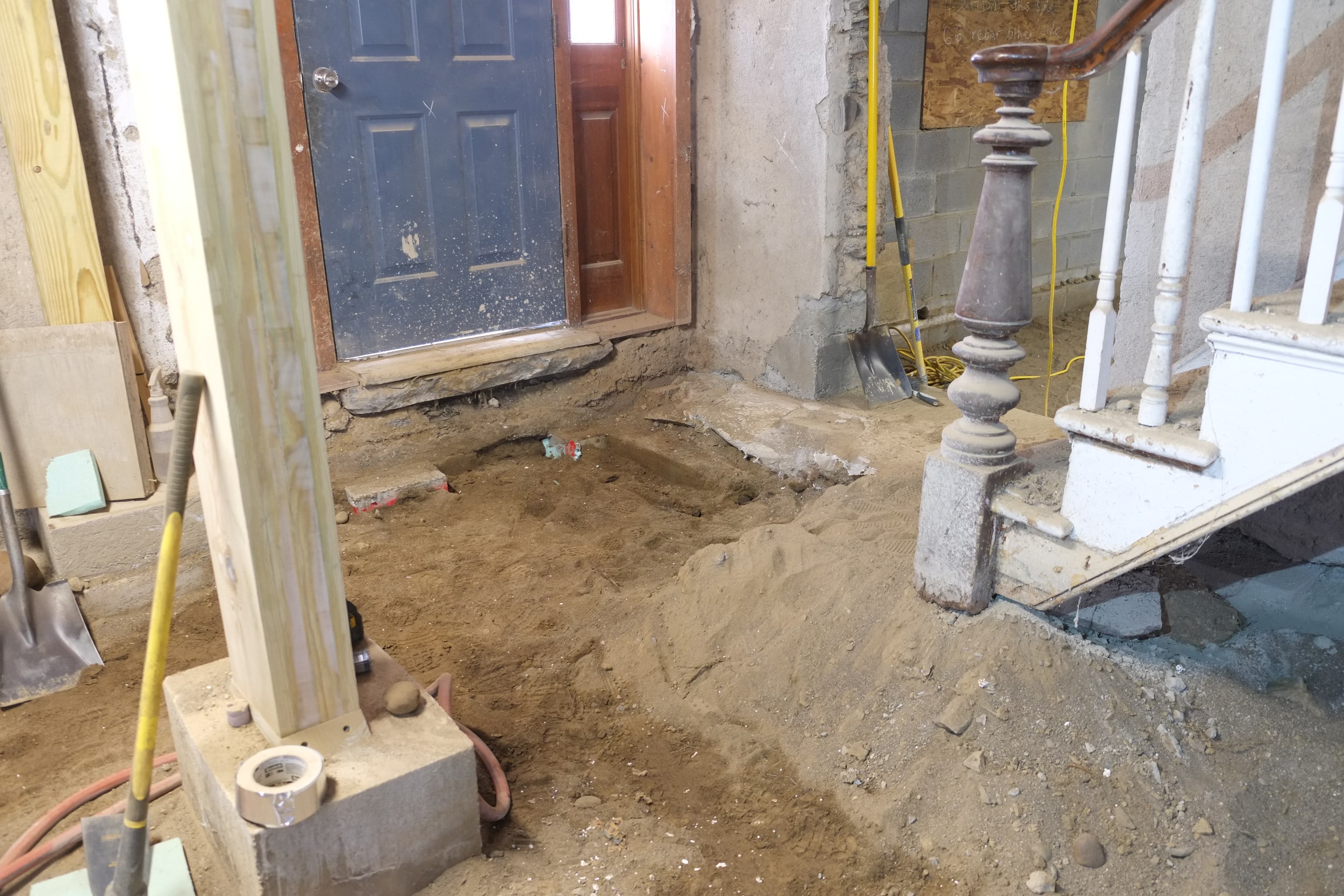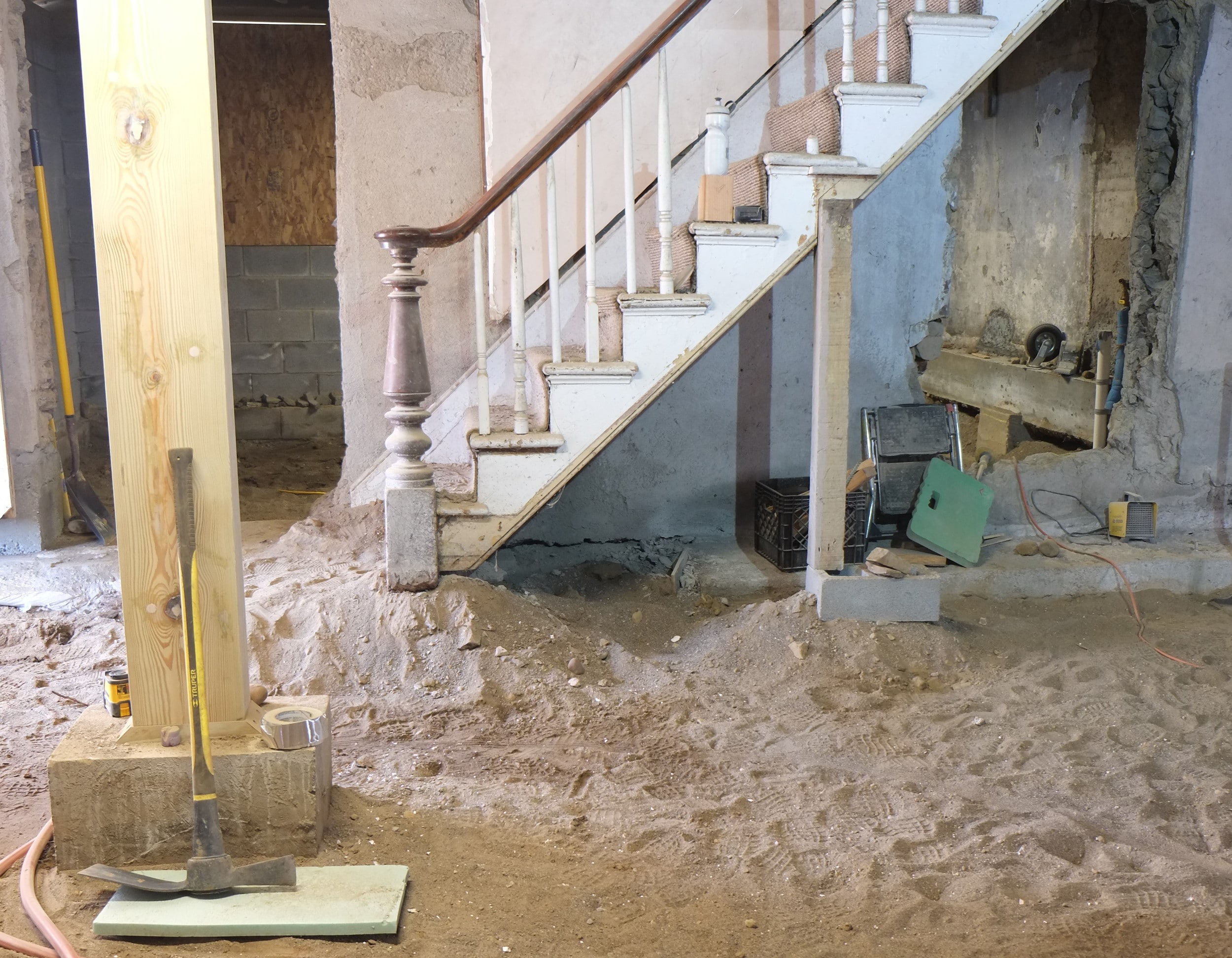 We still have a few little jobs to do before we’ll be ready and these include laying an electrical conduit for the mains cable, drilling holes through the wall into our mechanical room for our radiant heating pipes and lastly we’ll need to remove the staircase. We’ll probably keep just the hand rail and the newal post and bin the rest. Making a new stair case shouldn’t be too hard and should be a fun project 🙂