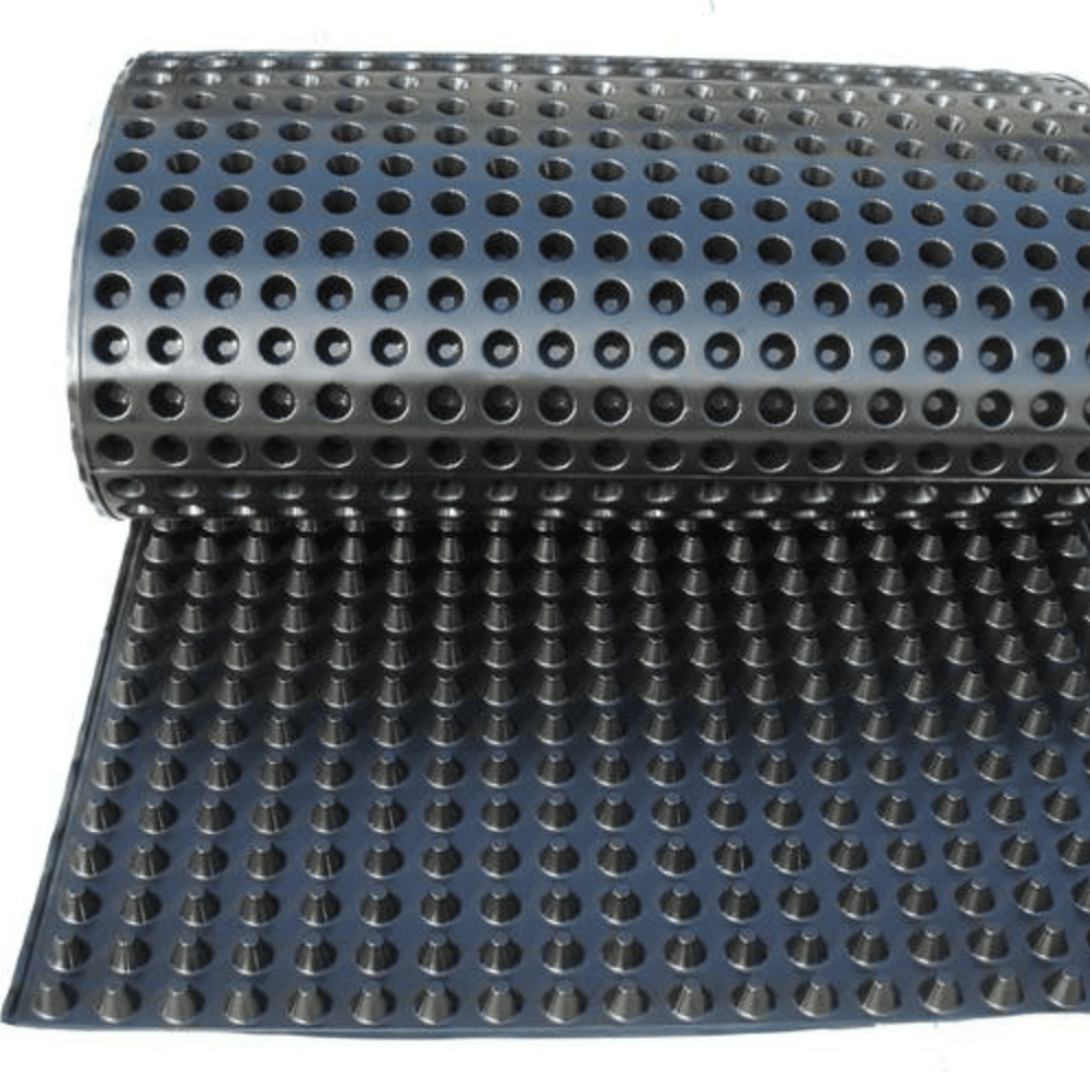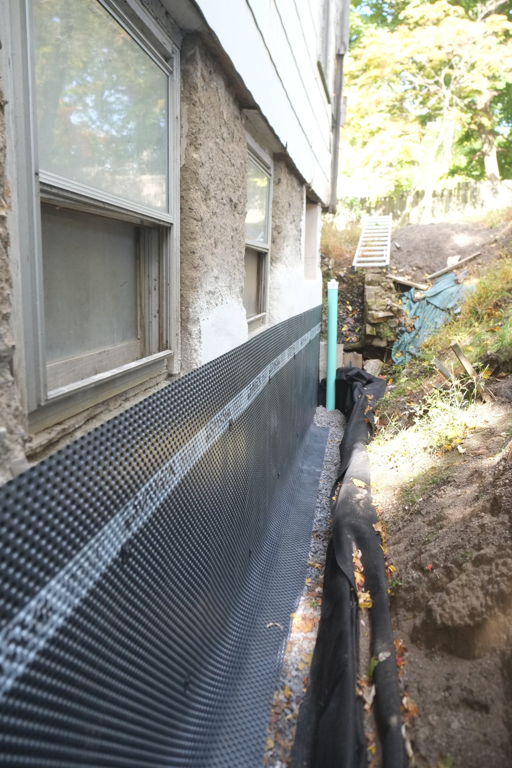 The dimple board being plastic protects the wall from moisture in the ground and its 5/16″ dimples, which face towards the wall, allow the wall to breathe (important for our lime mortar walls) and moisture to condensate outwards so it falls by gravity to our foundation drain.
