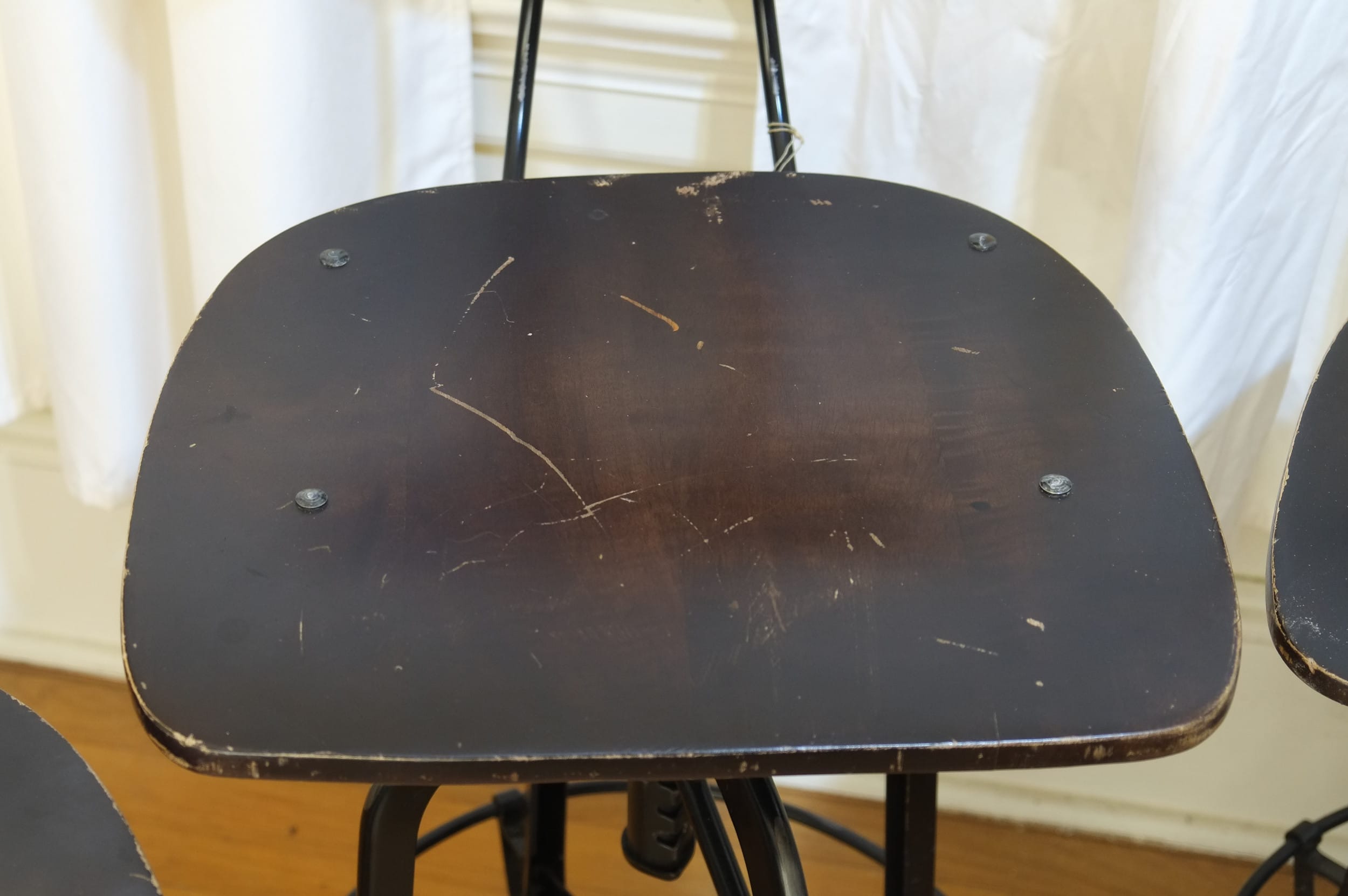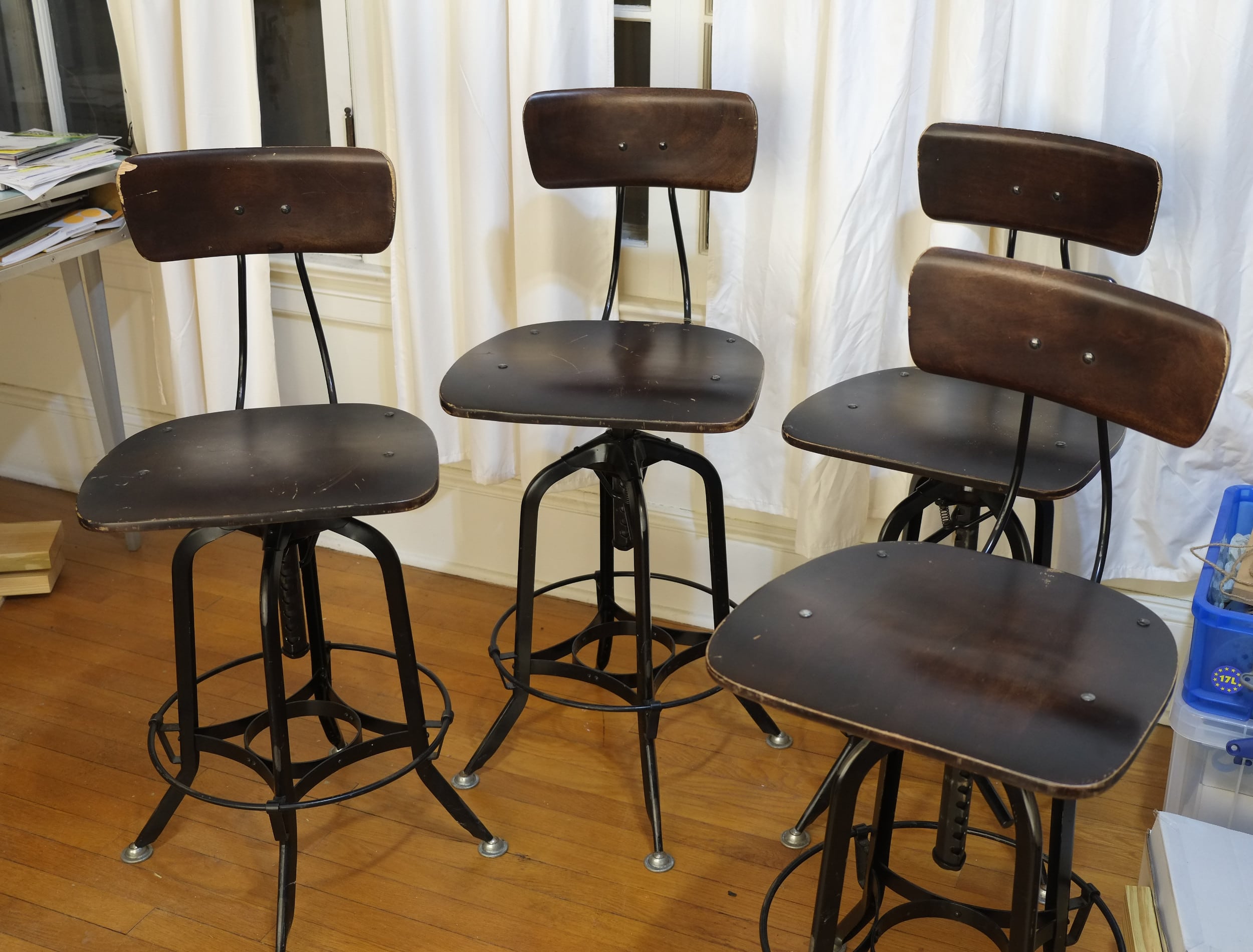 Recently we’ve been thinking that it might be nice to sit down whilst doing some work at DM. Our work bench is higher than most tables so chairs don’t cut it. What we need are some workshop chairs or stools. I did have a few workshop swivel stools with back rests but we sold them when we left Oakland, sigh. By the way we’re looking for something that fits the aesthetics of DM, so no chrome or thick vinyl clad foam seat .