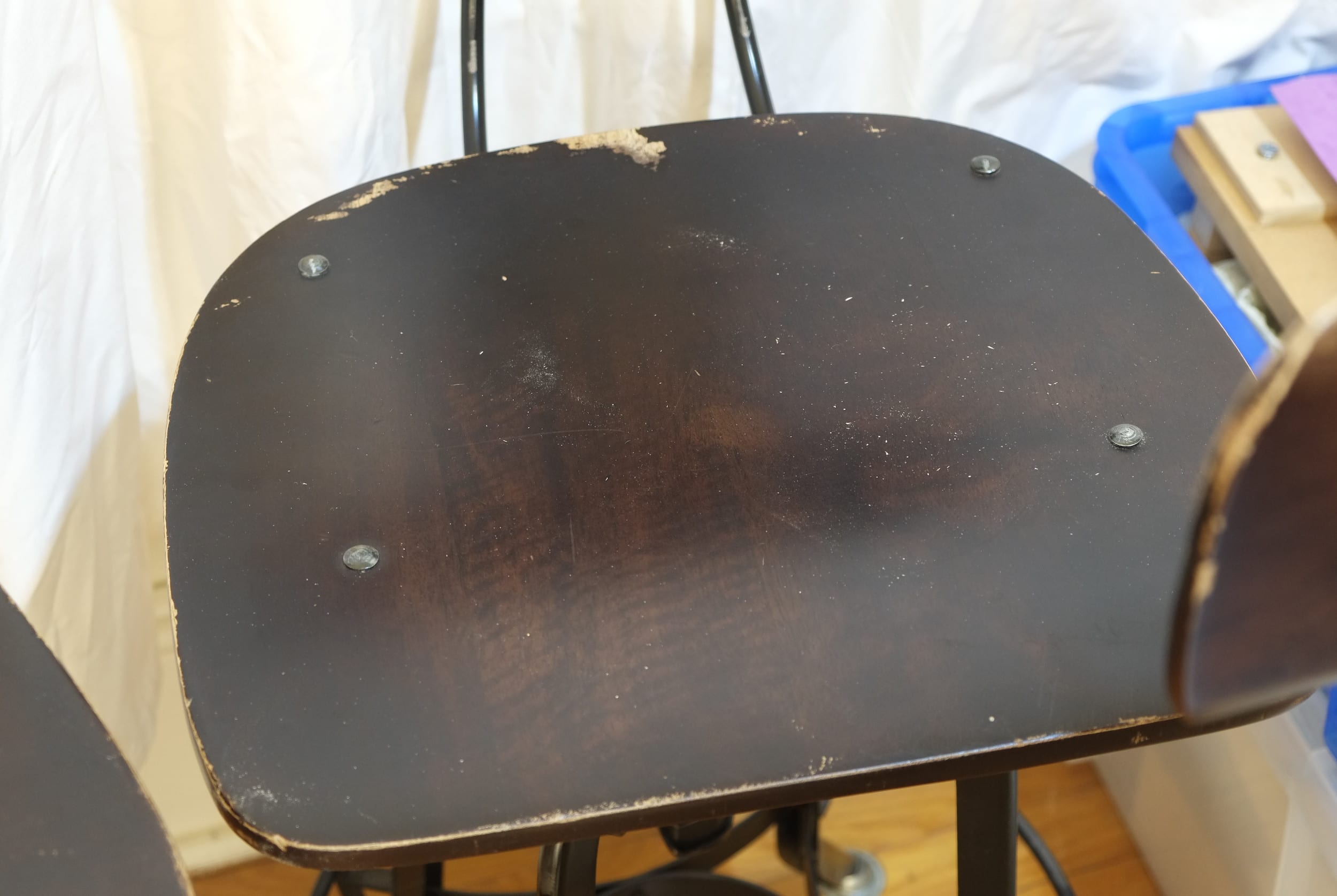 I was toying with the idea of making some but adding a swivel seat put me off the idea. For some time I was looking on craigslist and ebay for stools but nothing ever decent came up, but then I came across something called a “Toledo” drafting chair which looked exactly what we wanted, seat was at a good height with foot and backrests and it also swiveled. My mistake was that I had been searching for workshop stool when I should have been searching for drafting stool. Since I discovered the Toledo I’ve spoken to a few friends about it and for most this chair was already on their wish list. Aimee and I had never heard of it.