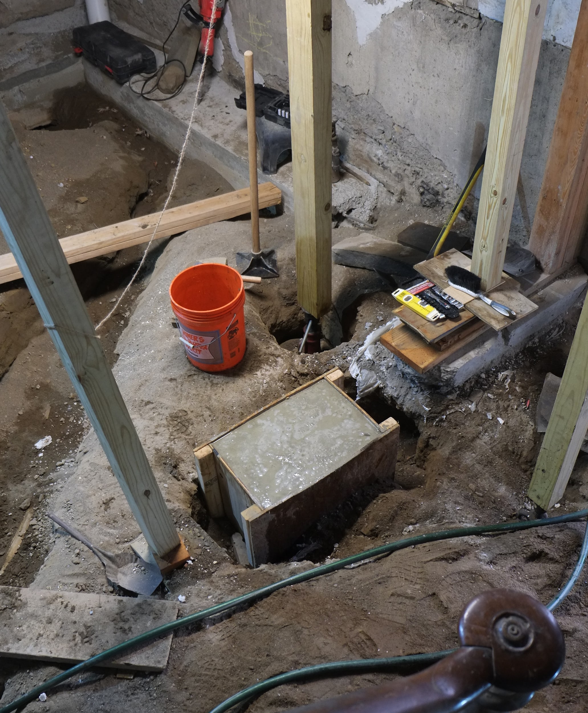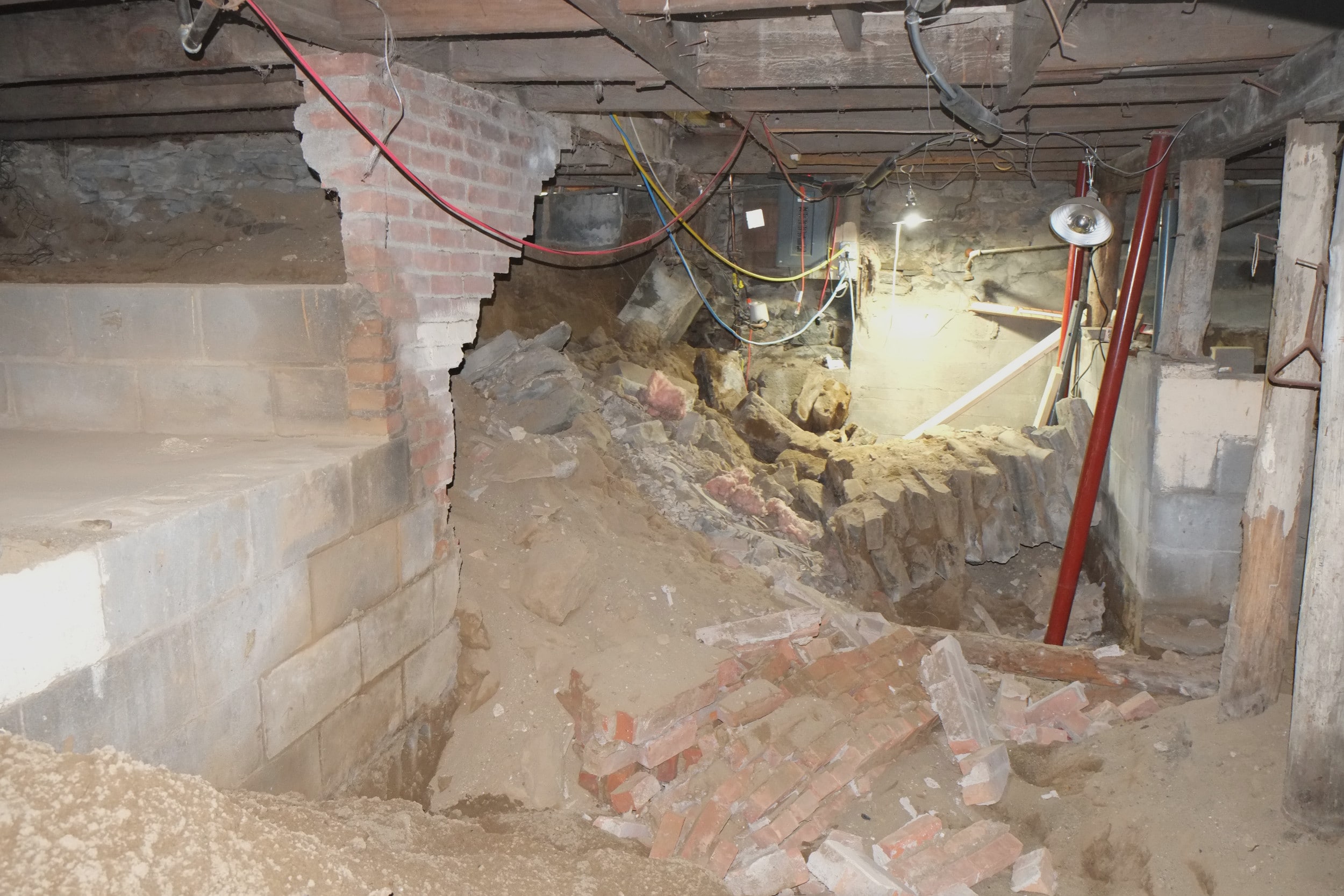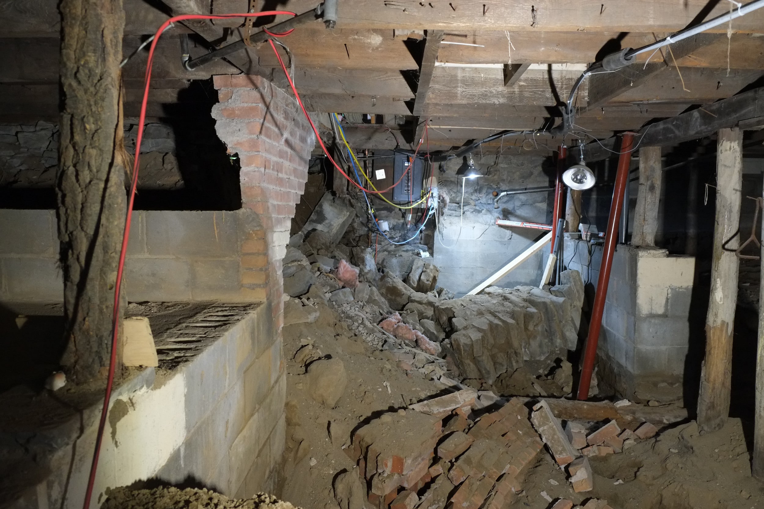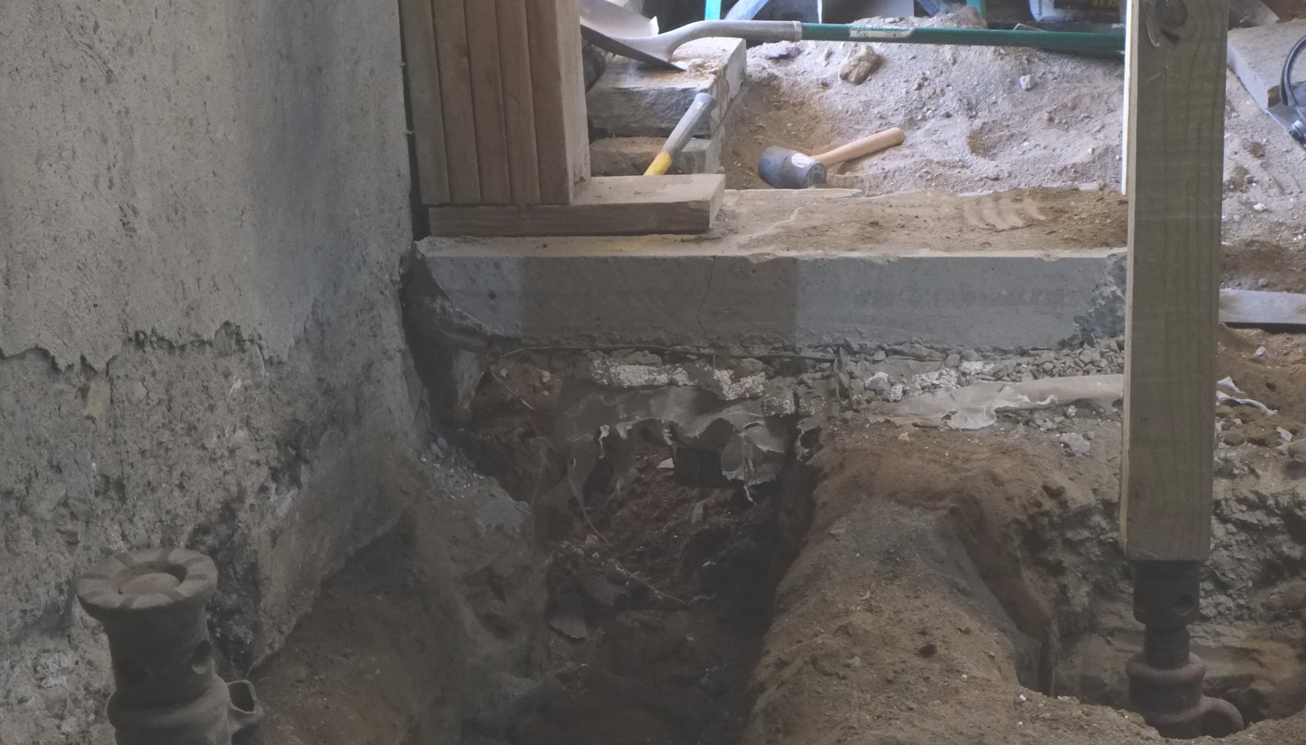 Today while excavating their basement they had an internal wall collapse. Luckily they knew the tell tale signs of a wall collapsing and got out of the way quickly. Like one of our walls that collapsed, before the structure finally went, they heard a sound very much like rain drops, which must be the stone or mortar bonds breaking. Unlike us their wall came crashing down sideways, ours merely dropped but stood vertical. Glad to say that everyone got out of the way, a little shocked but safe – the house is still standing.