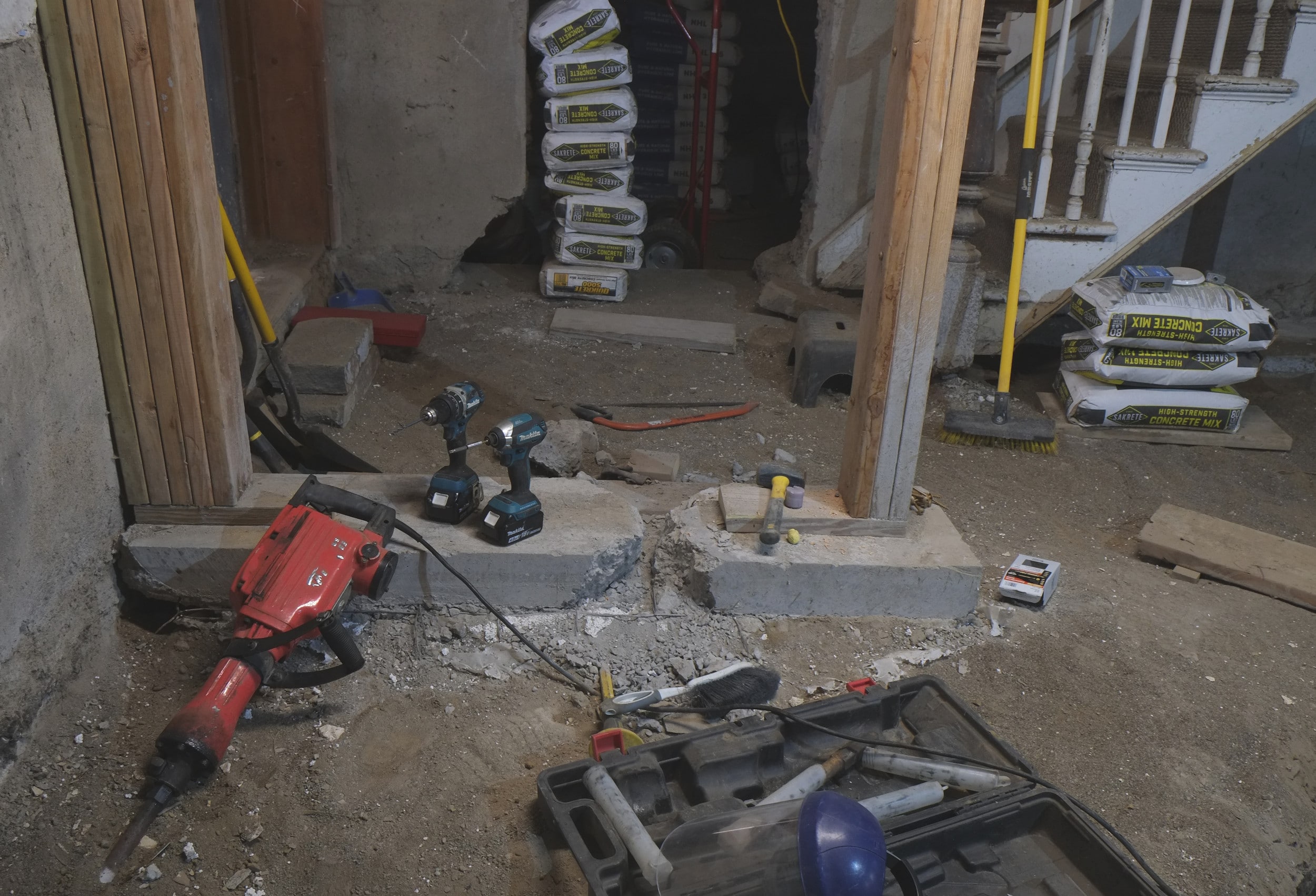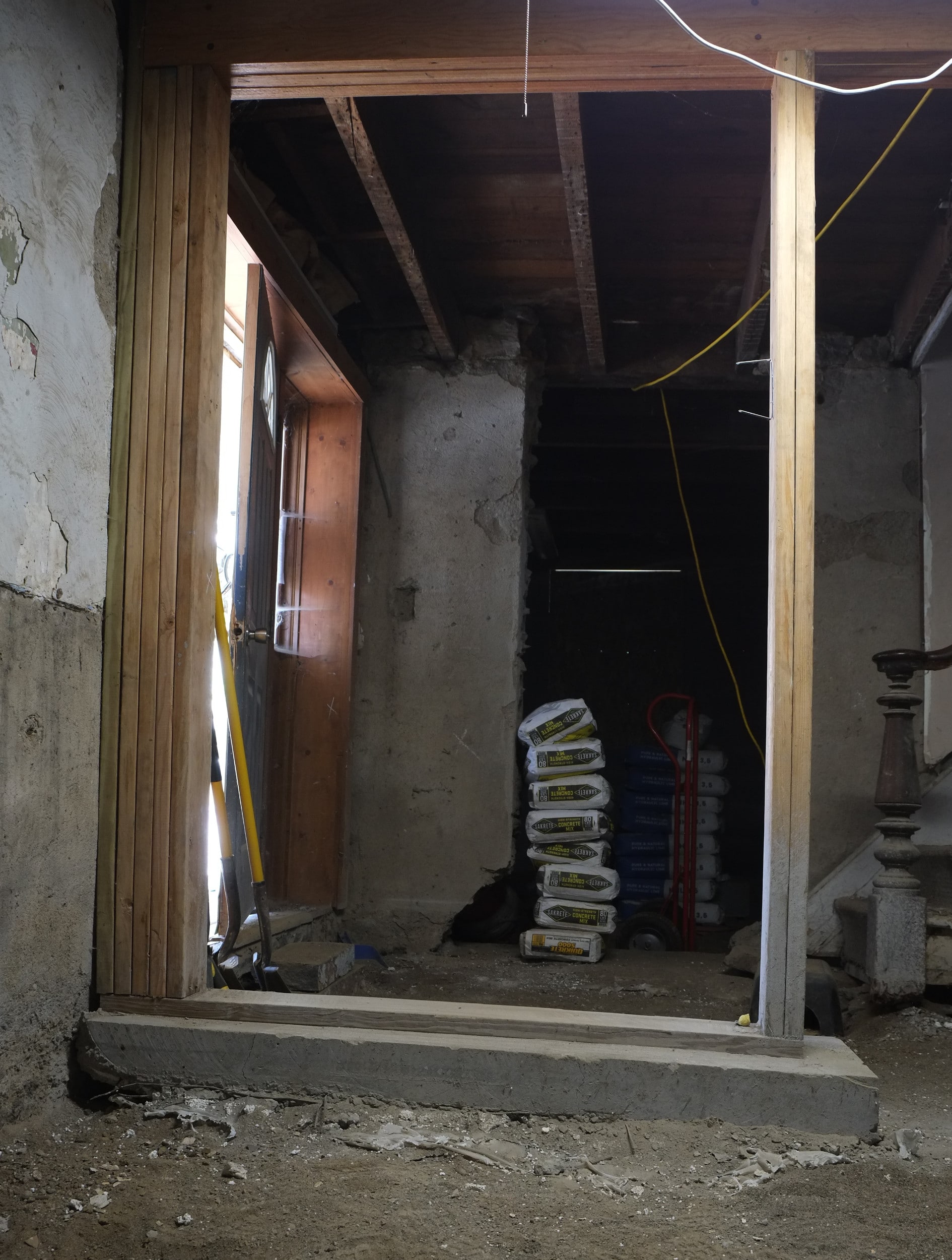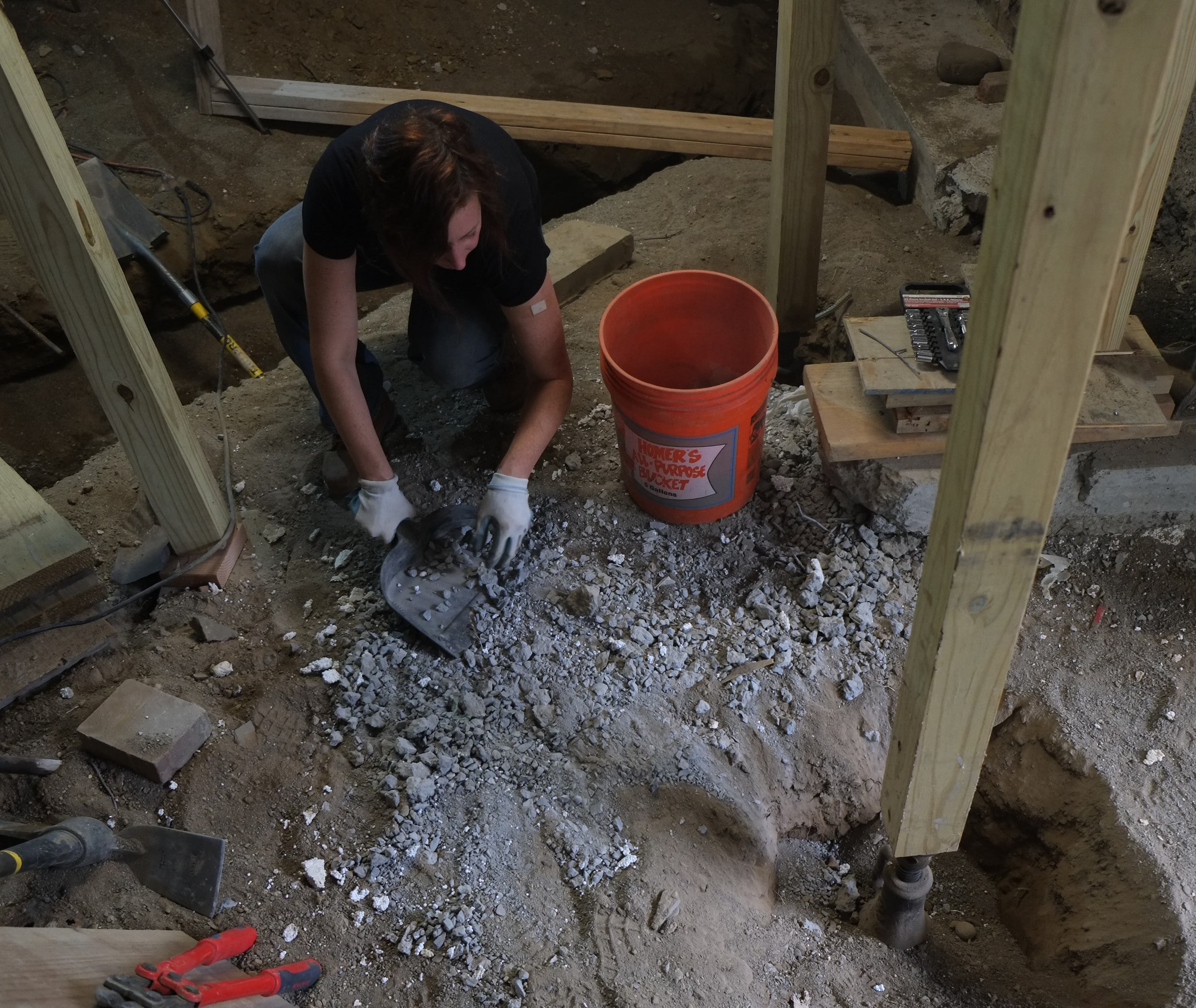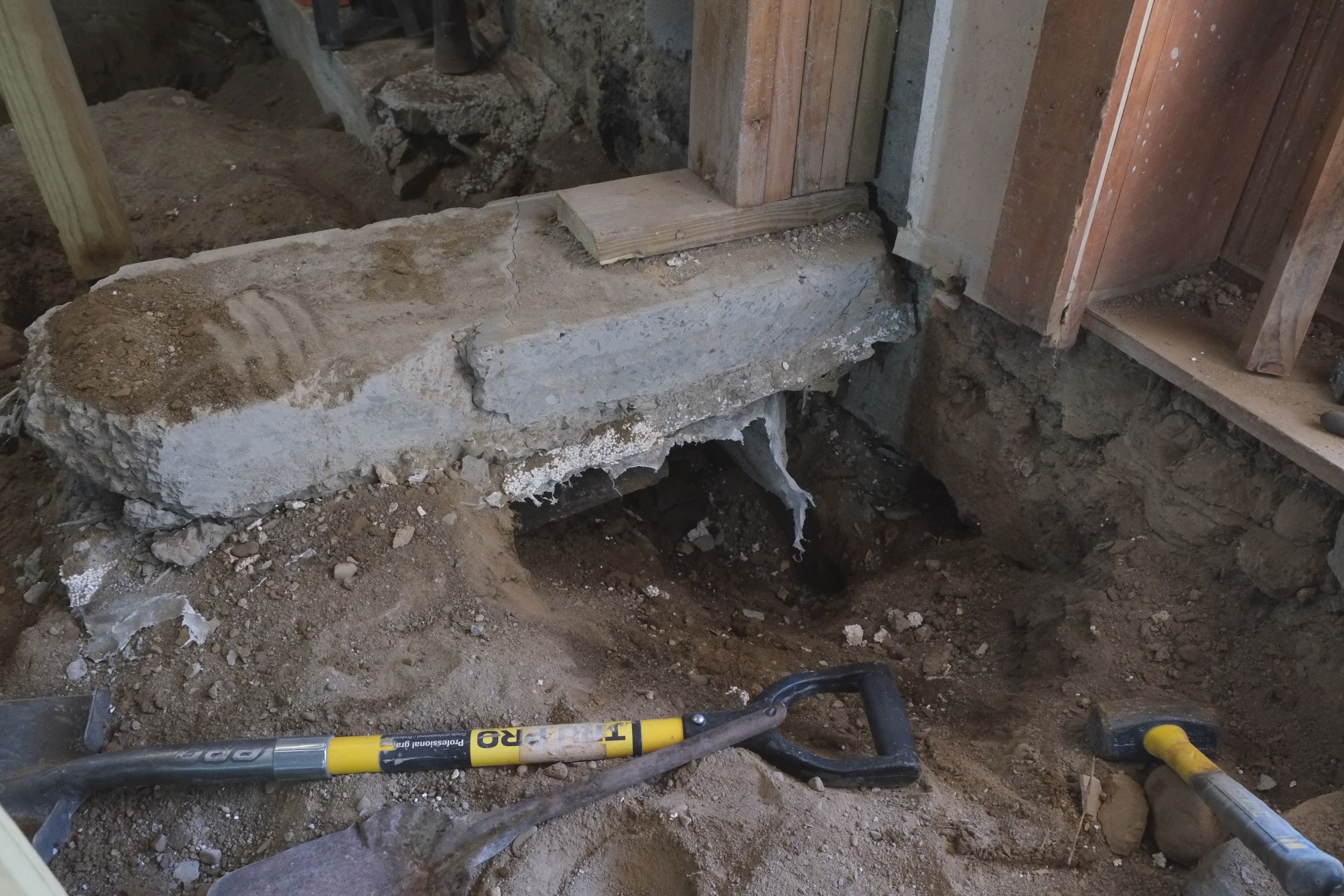 Today while excavating their basement they had an internal wall collapse. Luckily they knew the tell tale signs of a wall collapsing and got out of the way quickly. Like one of our walls that collapsed, before the structure finally went, they heard a sound very much like rain drops, which must be the stone or mortar bonds breaking. Unlike us their wall came crashing down sideways, ours merely dropped but stood vertical. Glad to say that everyone got out of the way, a little shocked but safe – the house is still standing.