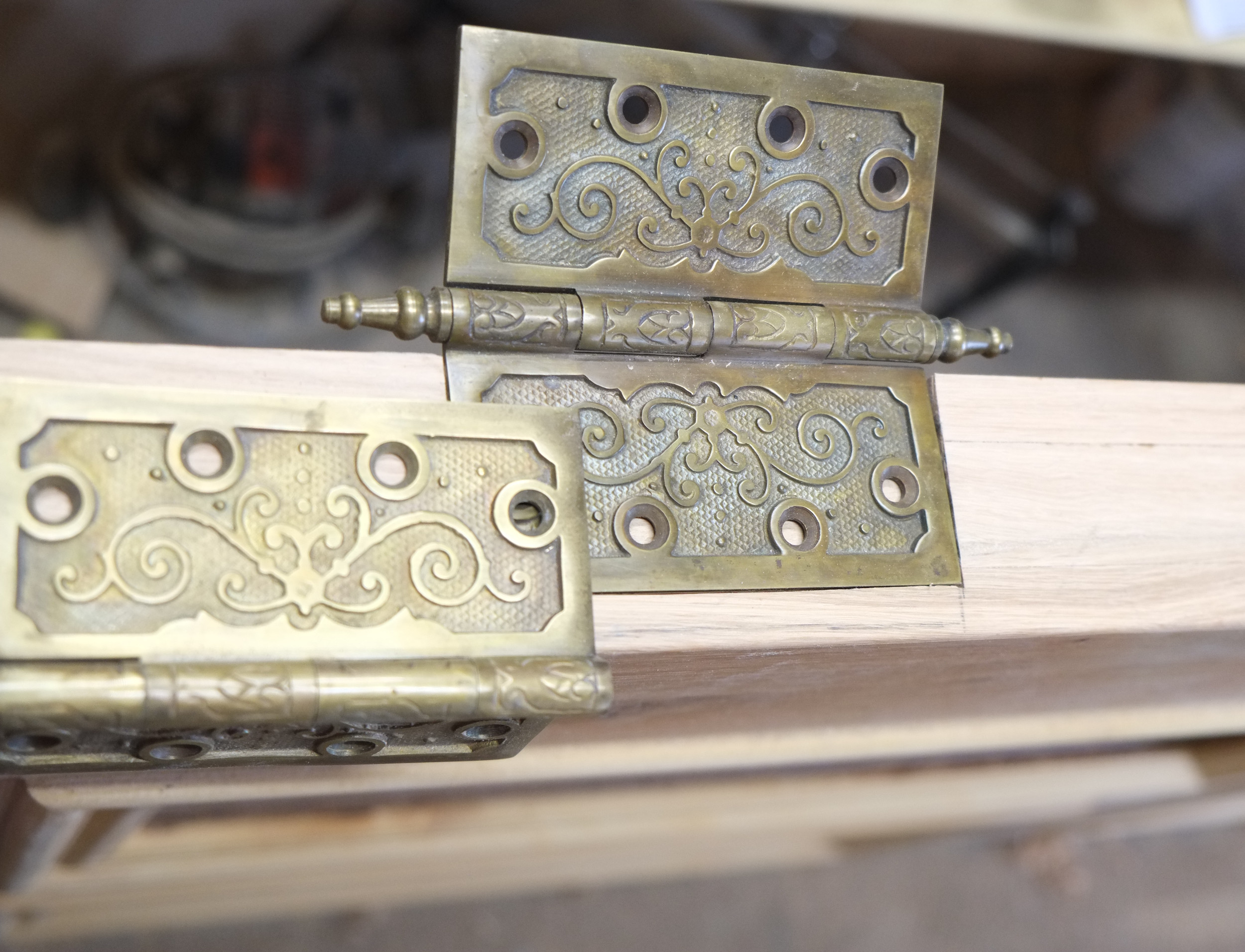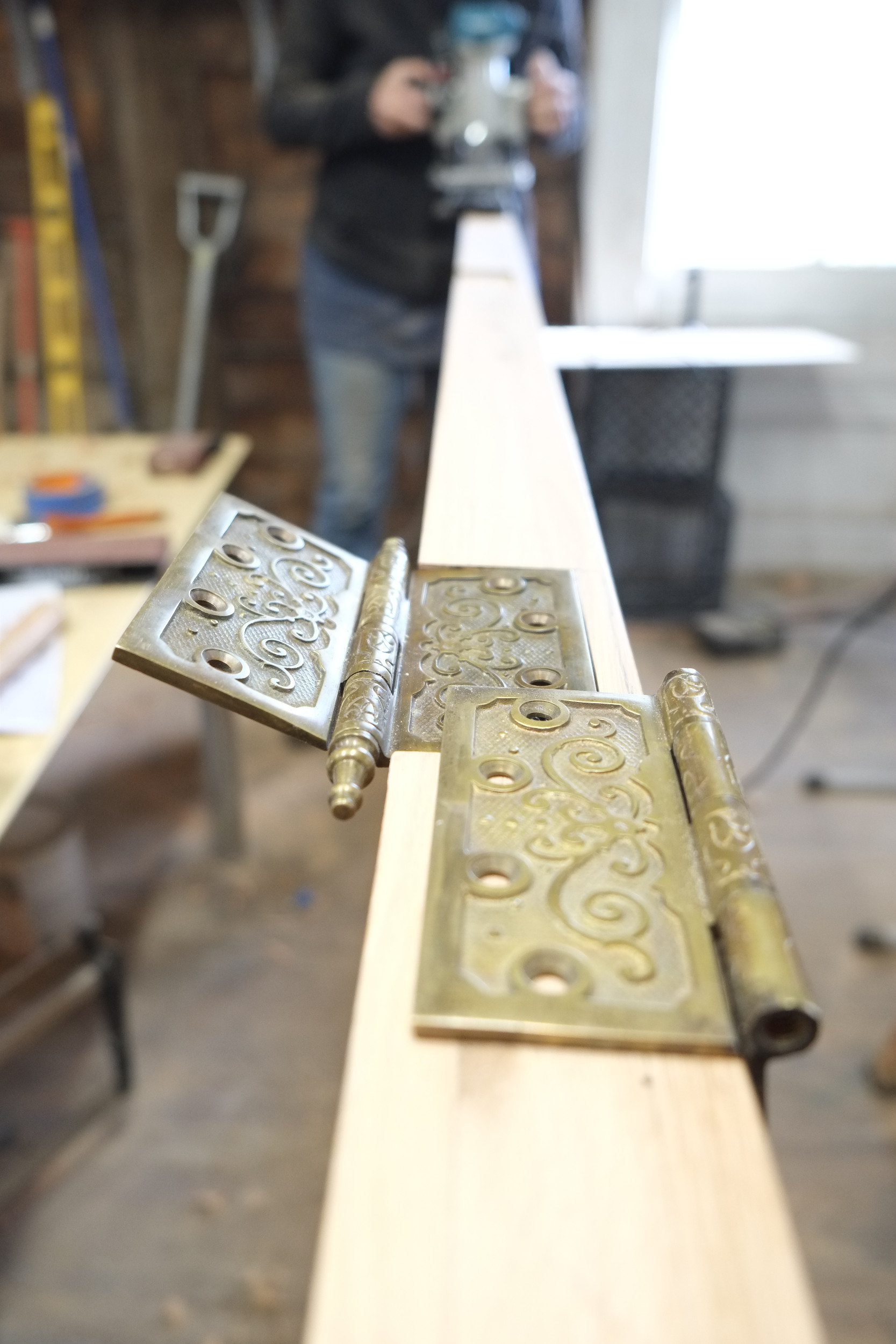 We’re using three hinges for this brute, not vintage but brass re-creations. I did acid-etch them to get rid of some fake antique coating and they look better. To cut the recesses we used a Porter Cable door hinge template kit combined with a compact Makita router, both of which do a fine job. I did the first hinge and then Aimee took over and did the remaining two. Placement of the hinges was 7″ from the bottom, 11″ from the top and one between the other two. We trimmed out the corners of the recesses with hand chisels.
