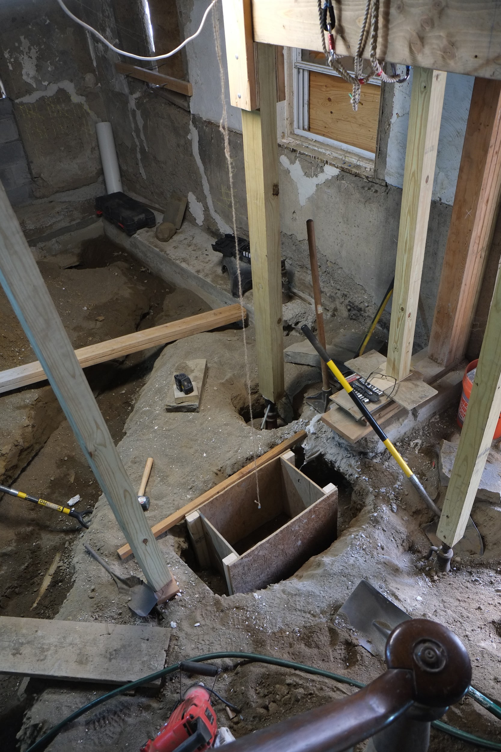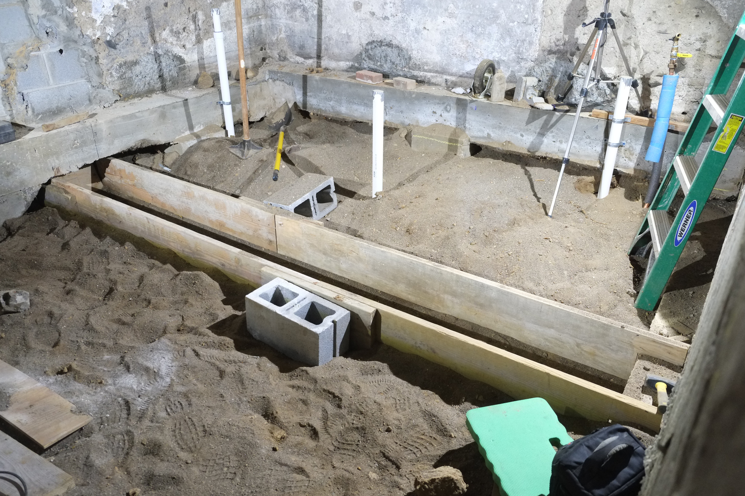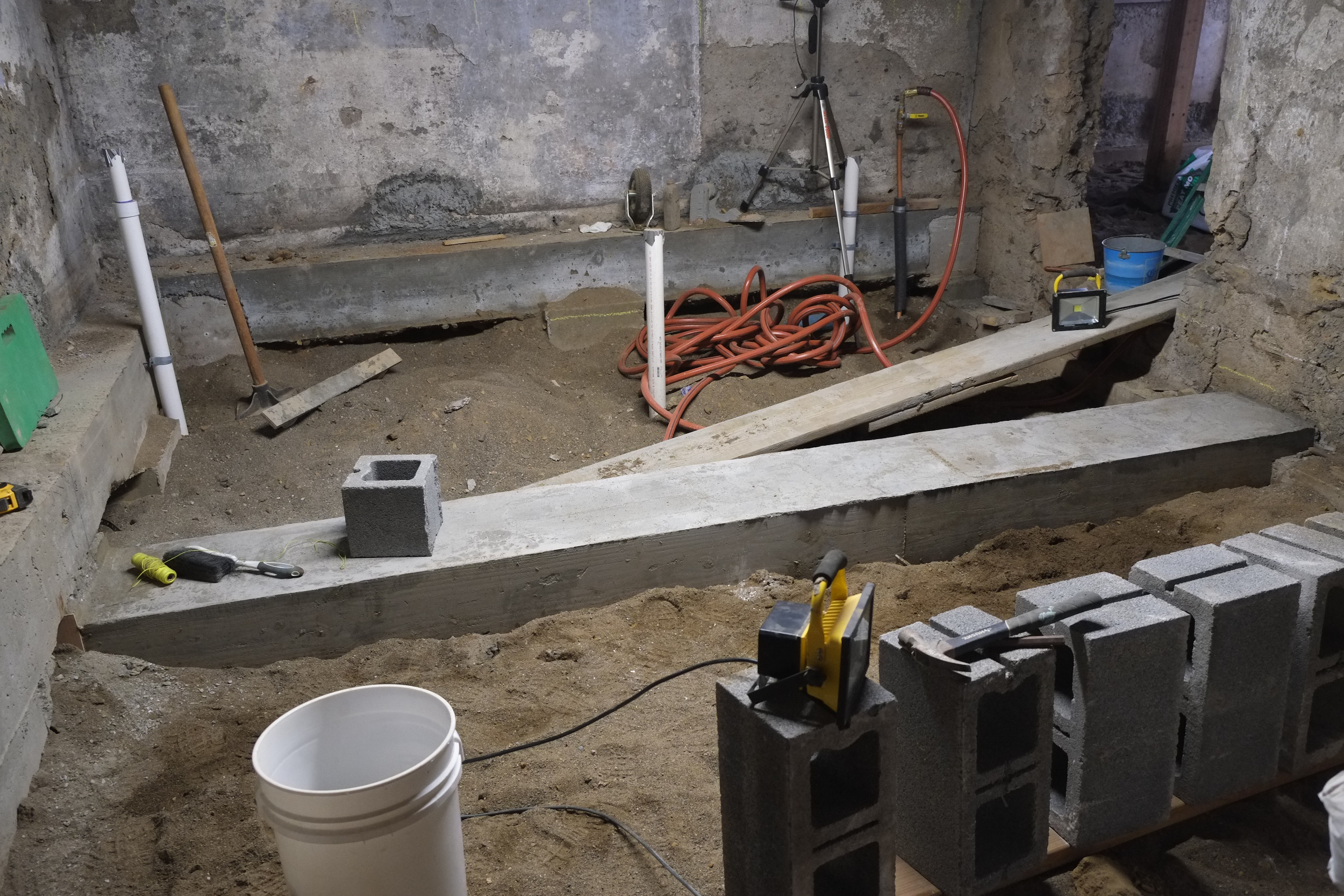 I’m not sure sure what this room was ever used for, it had a small slit of a window and a soil floor. In our redesign we’ve dropped the floor a bit to match the rest of the ground floor and added a couple of windows. This room also needs to be split into two, a small bedroom and a mechanical/boiler room with room for a washer, dryer and slop sink.