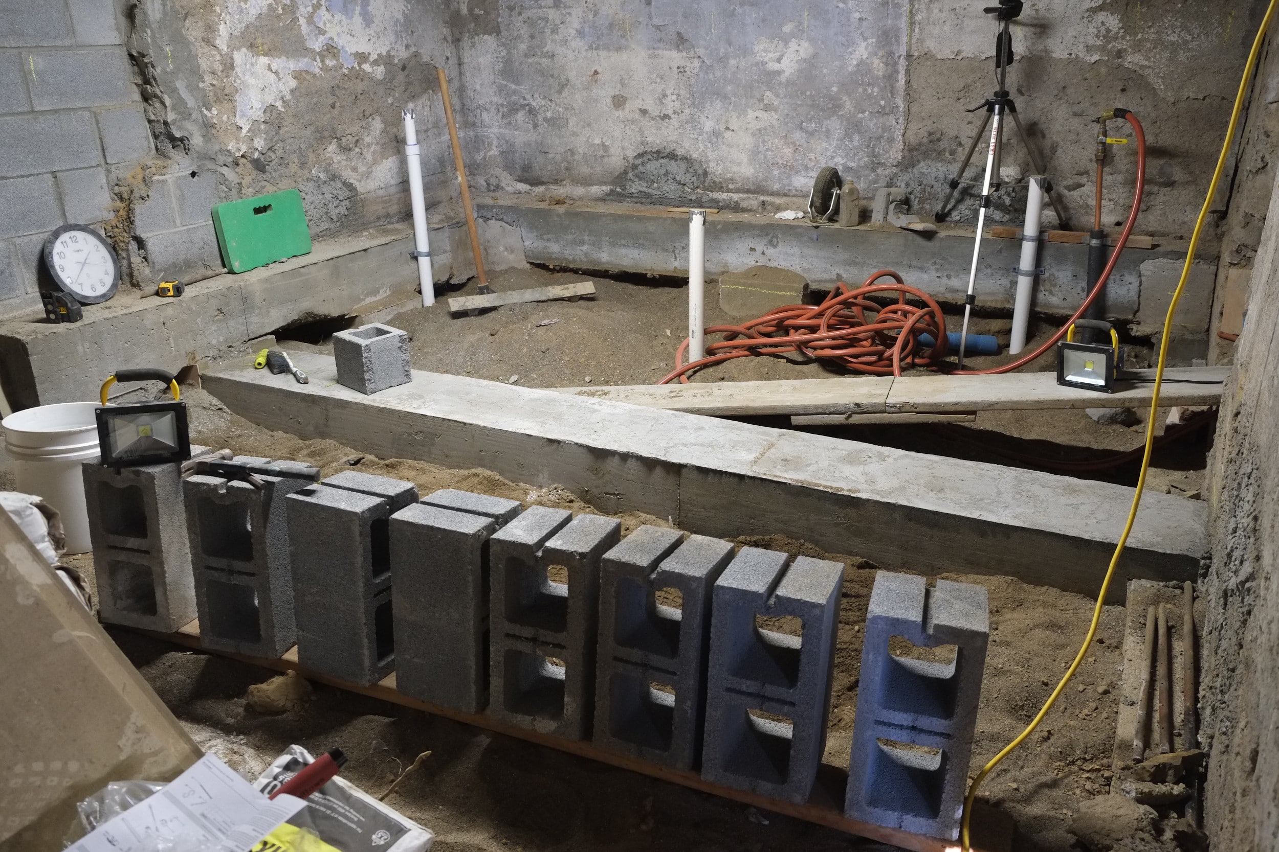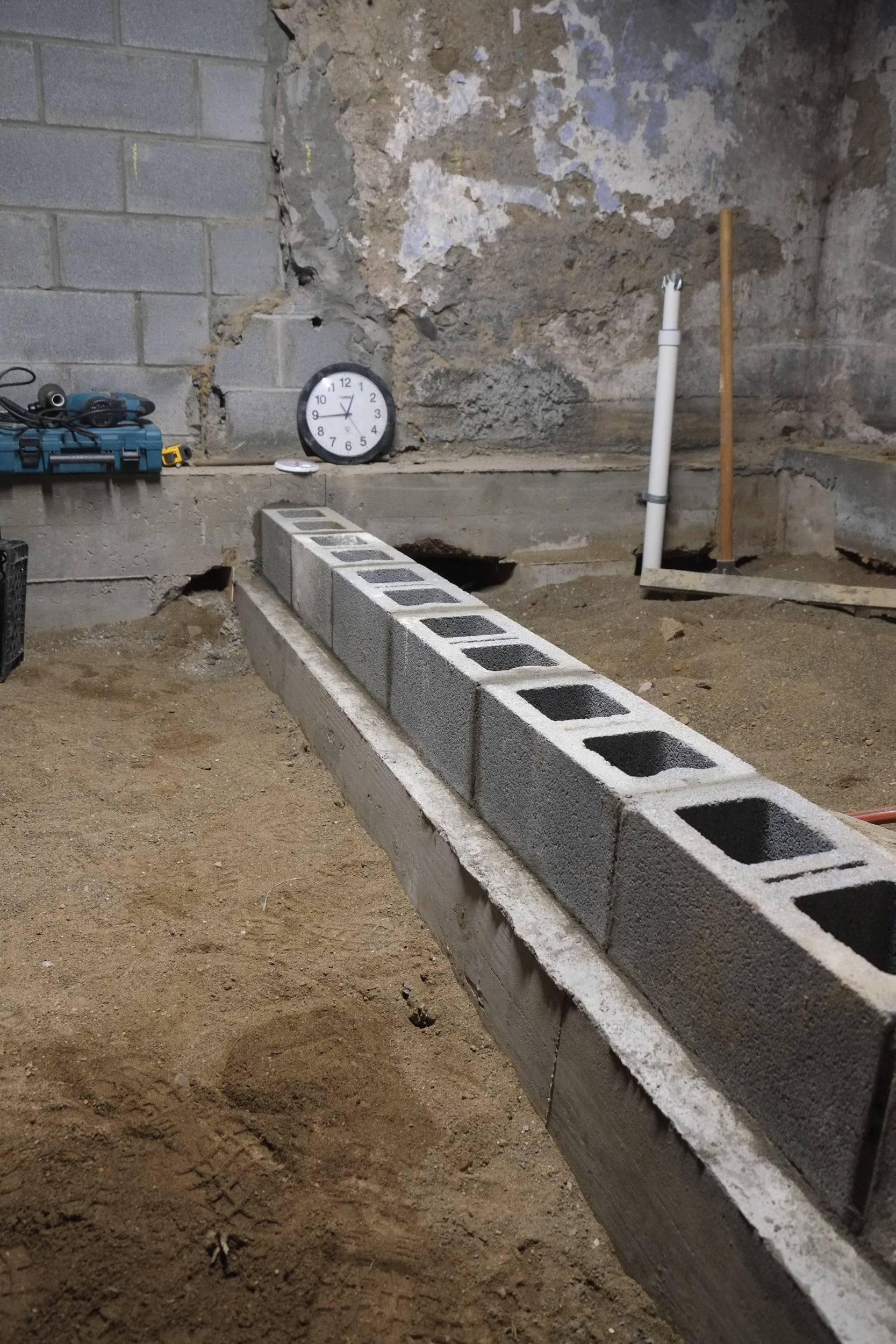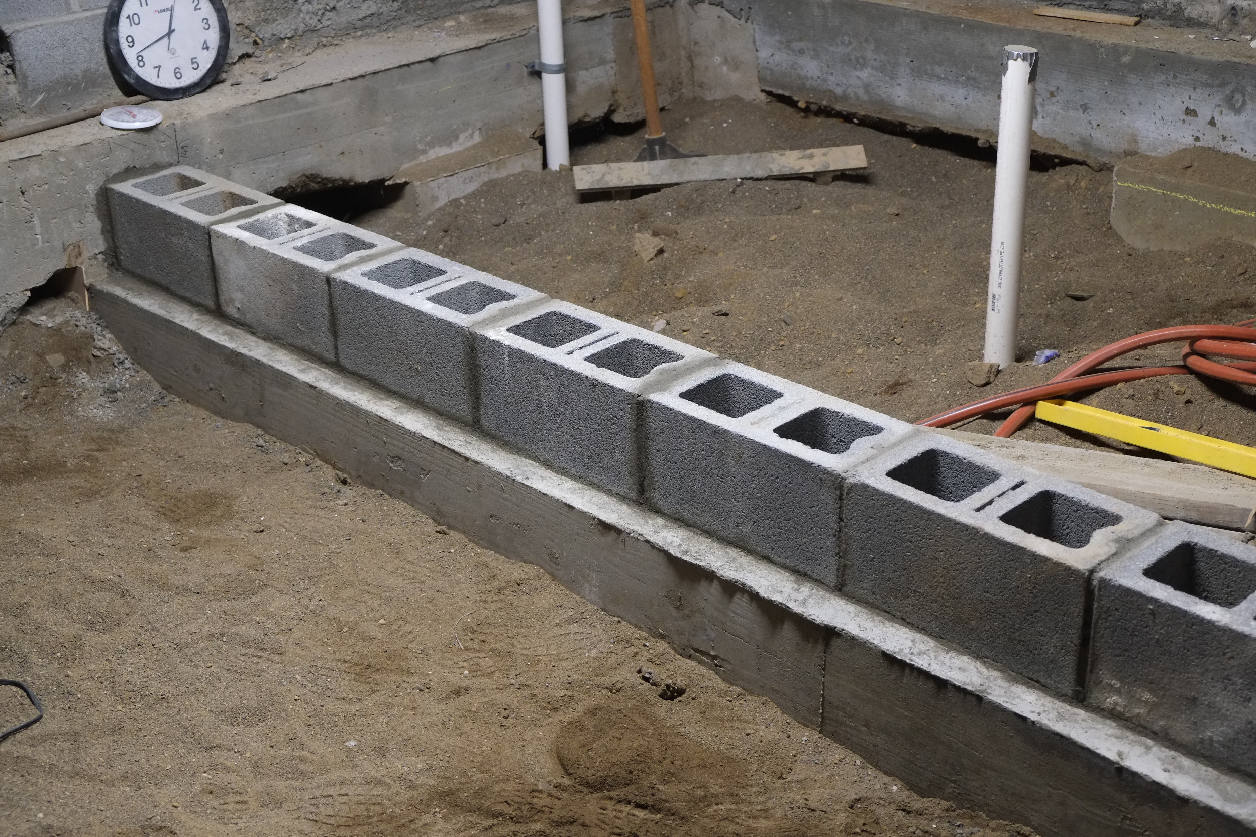 Once we have these new blocks in place we’ll only need a bit more plumbing and some electrical lines put down before we can fill in all the trenches and start to prep for a concrete pour in the spring.