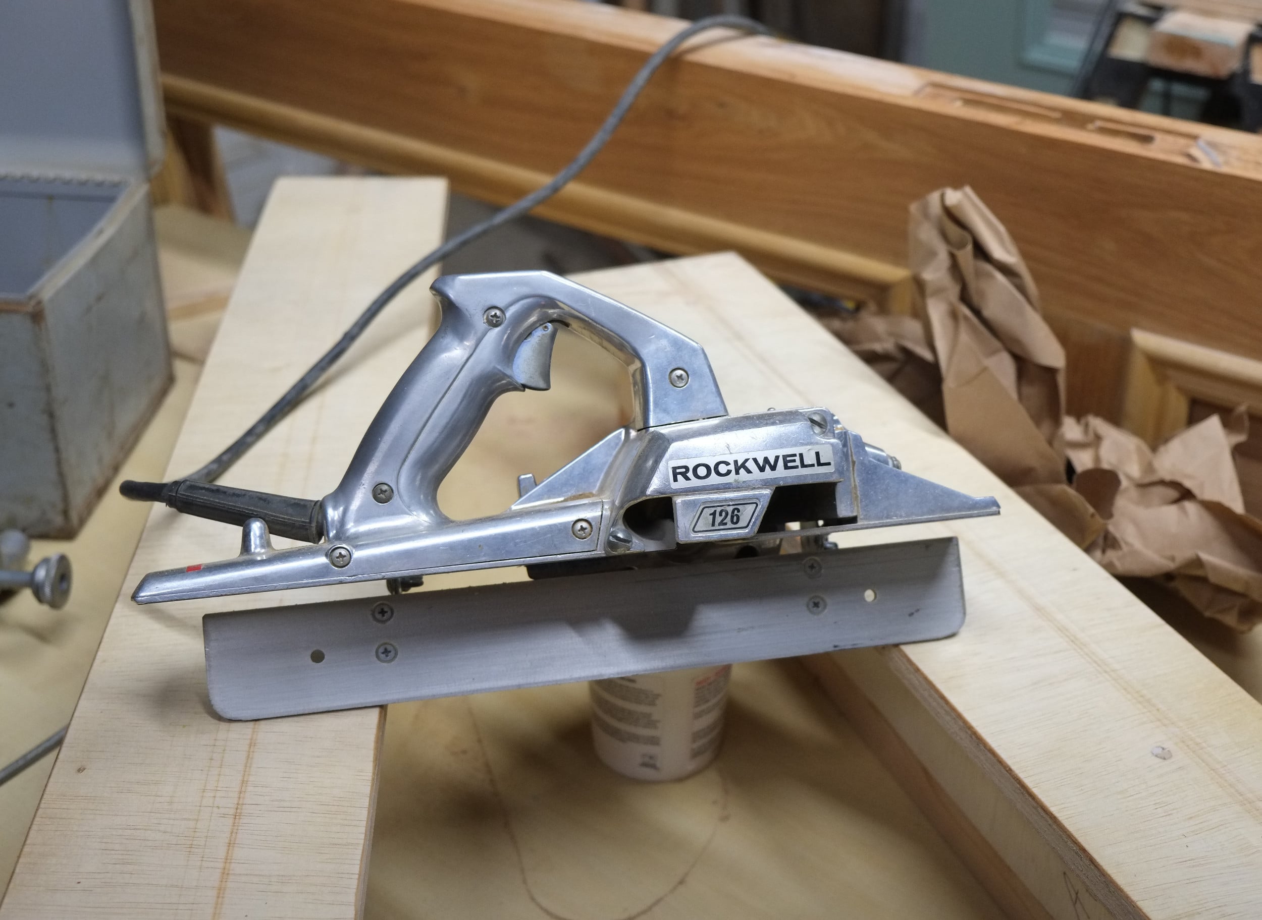 Searching, I found out about a tool, sadly no longer made, which was made for door beveling, the Porta Planer 126, made by Porter Cable. As an aside I always thought that Porter(a) Cable meant PORTAble electric tool on a CABLE but if you follow the above link the company was created by Mrs Porter and Mrs Cable. I started looking for a 126, which seems to be an appreciating classic, but all the ones on ebay were a few hundred dollars and then I came across one being sold locally by the Kingston Boat Building School, for $80.
