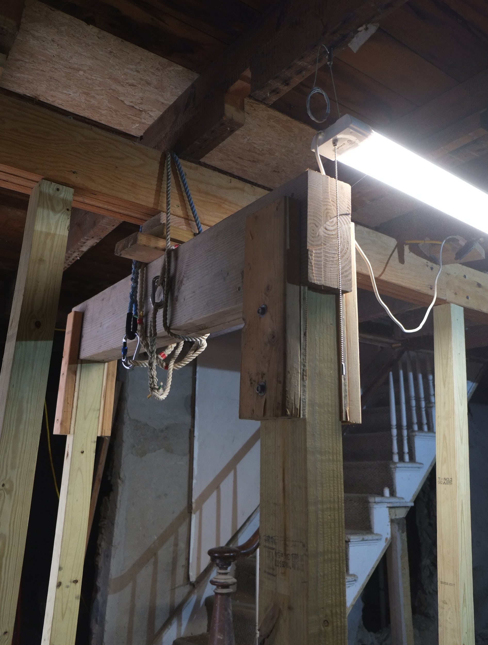 When we replace a pillar support we first have to remove the existing pillar which is always a little nerve racking as these pillars are holding up a decent portion of the house. To prevent any damage to the house we add temporary bracing which as this is second time around, we’re a bit more comfortable doing it. It’s a bit of a struggle to get the temporary bracing in place and often involves some good choice words.