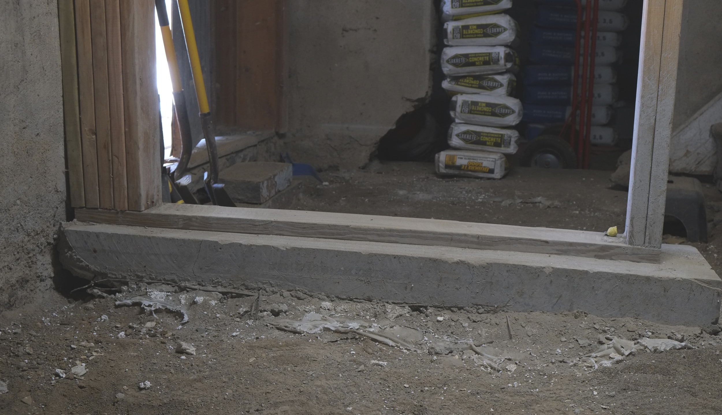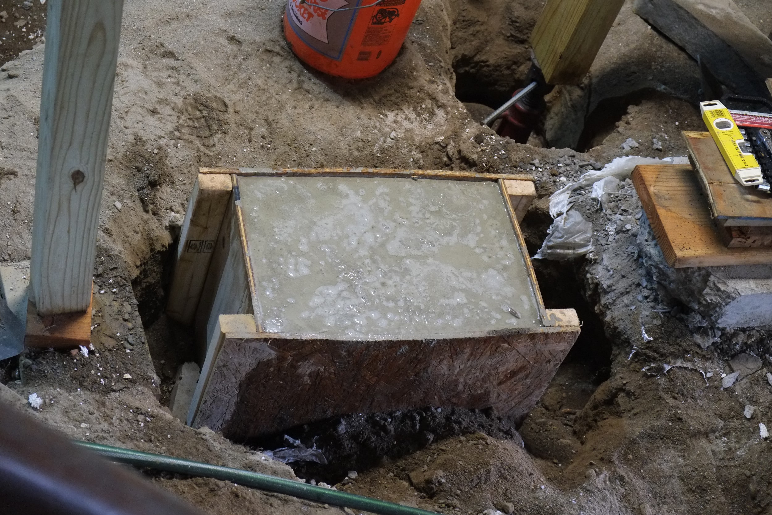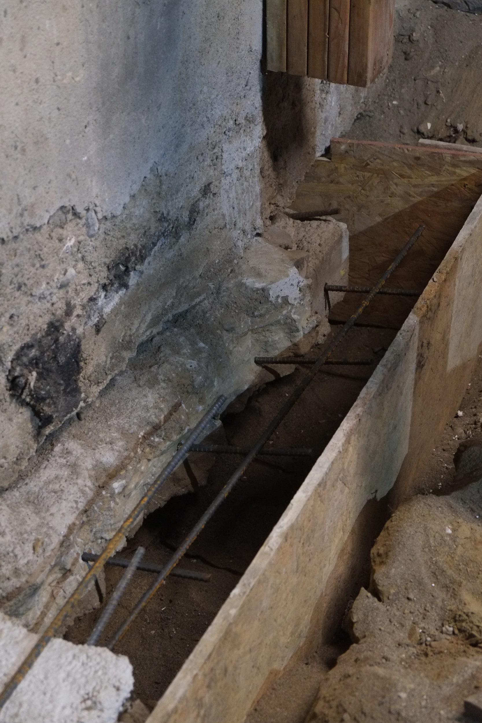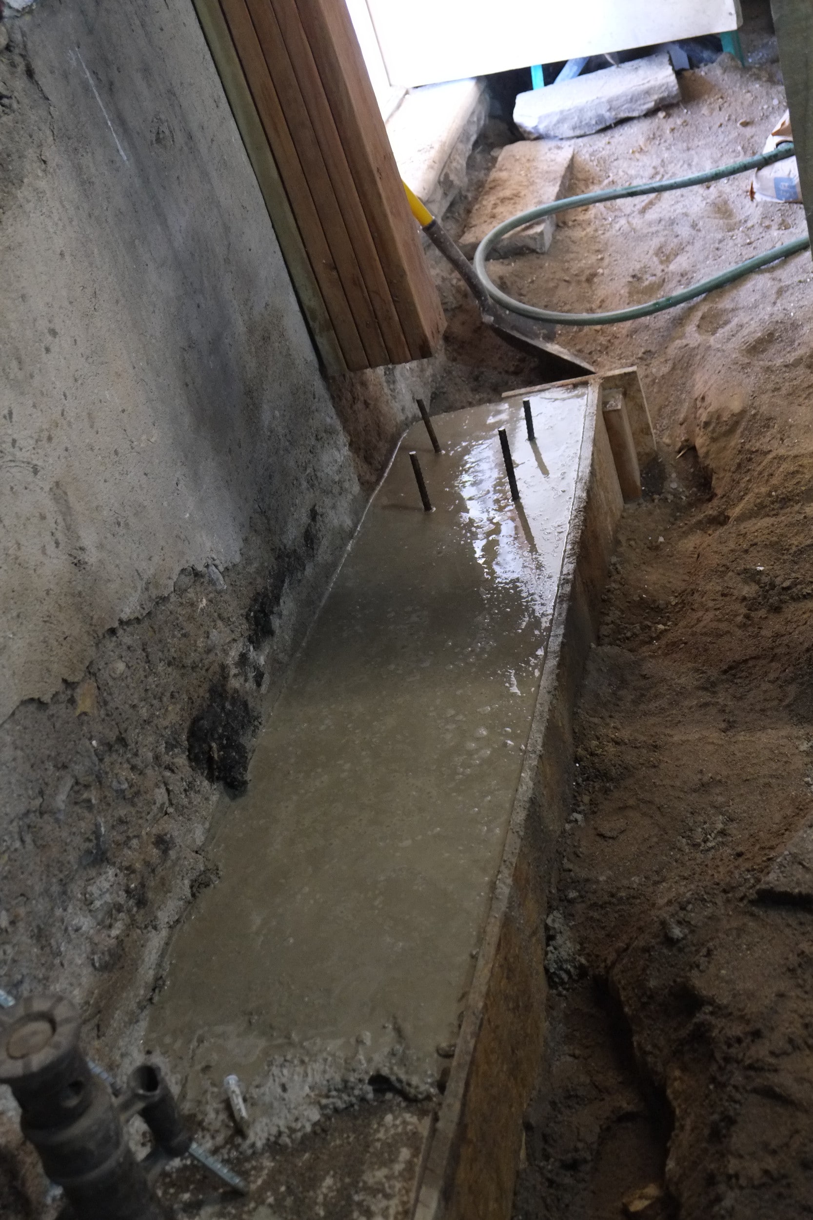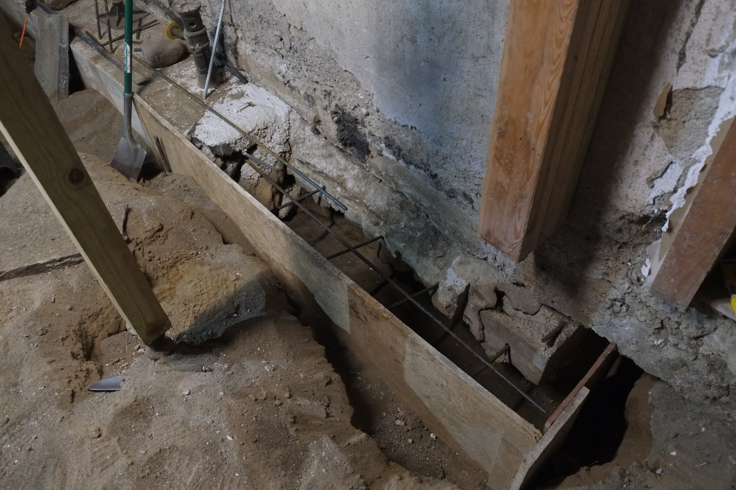 Our friend and advisor Derrick suggested that this partition wall could also be load bearing to help support the long ceiling span above, which makes total sense and is why we put this decent footing down, complete with rebar. Derrick is the best.