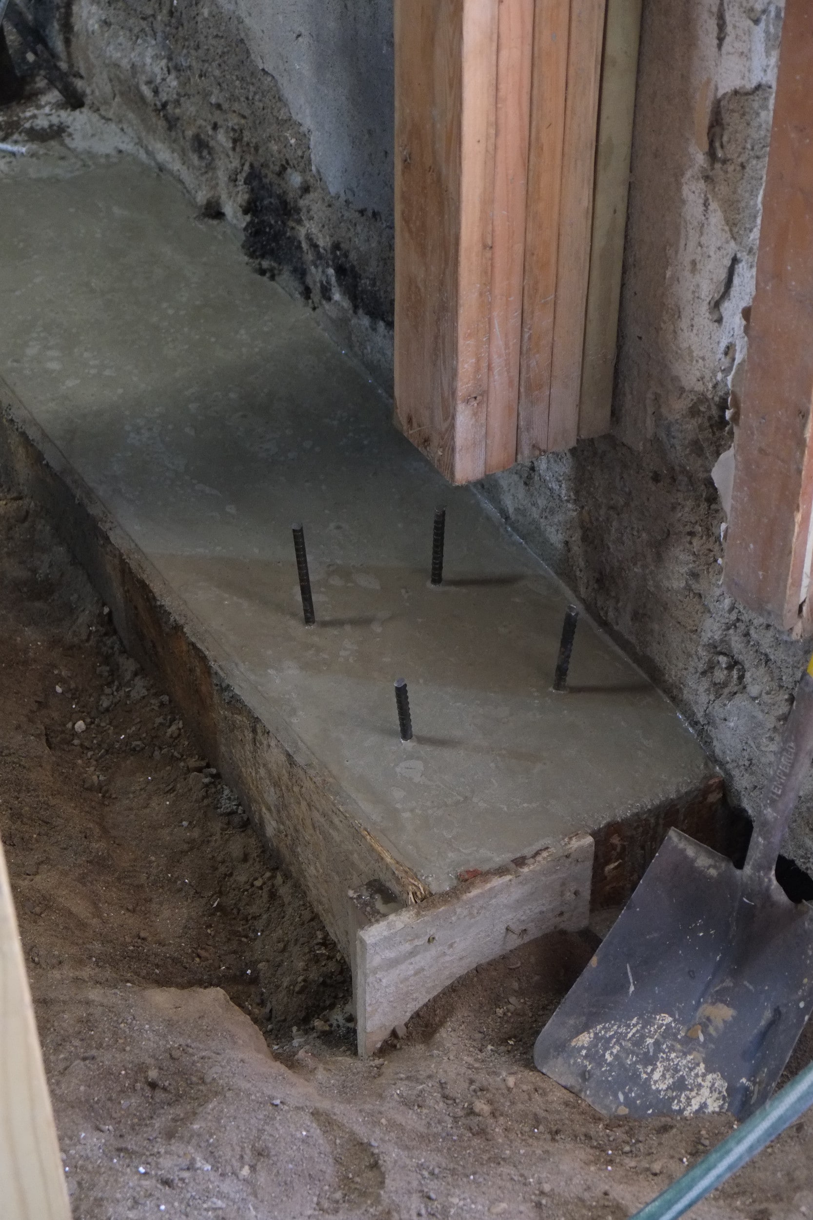 For the third block we also had the chance to continue our efforts at beefing up the existing footings. In places you could put your hand maybe 8″ under the walls so it was nice to get all this sorted out. We tied this new pour into the existing footings with epoxied rebar.
