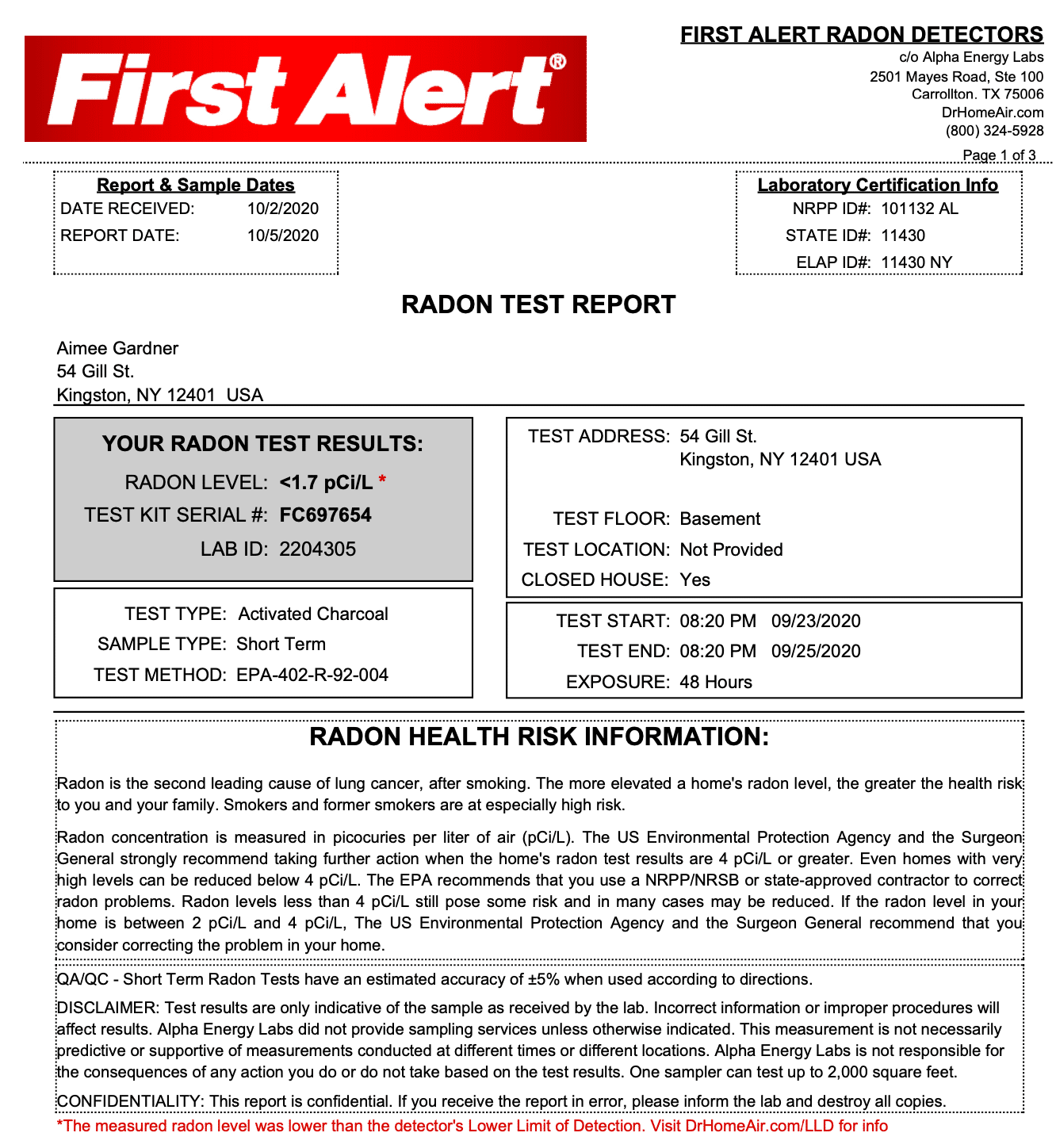 Radon came onto our radar as our architect had included pipes within our basement floor for Radon mitigation (removal for us common folk) which would be something our plumber would do. We did some research and the first step seemed be testing for Radon. We picked up some DIY tests which are $10 a pop and are small packs of charcoal which you leave in your basement for 48 hours and then post them off for testing. We bought two and put one in side of the basement. We posted them off pretty much together. Aimee just got the results for her kit but according to Fedex mine is still a week away from being delivered.