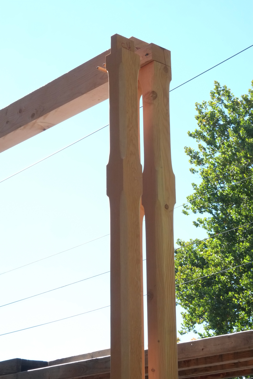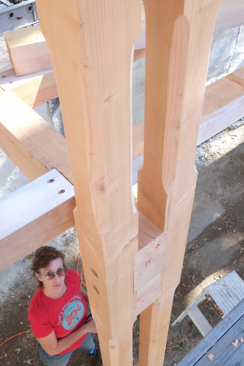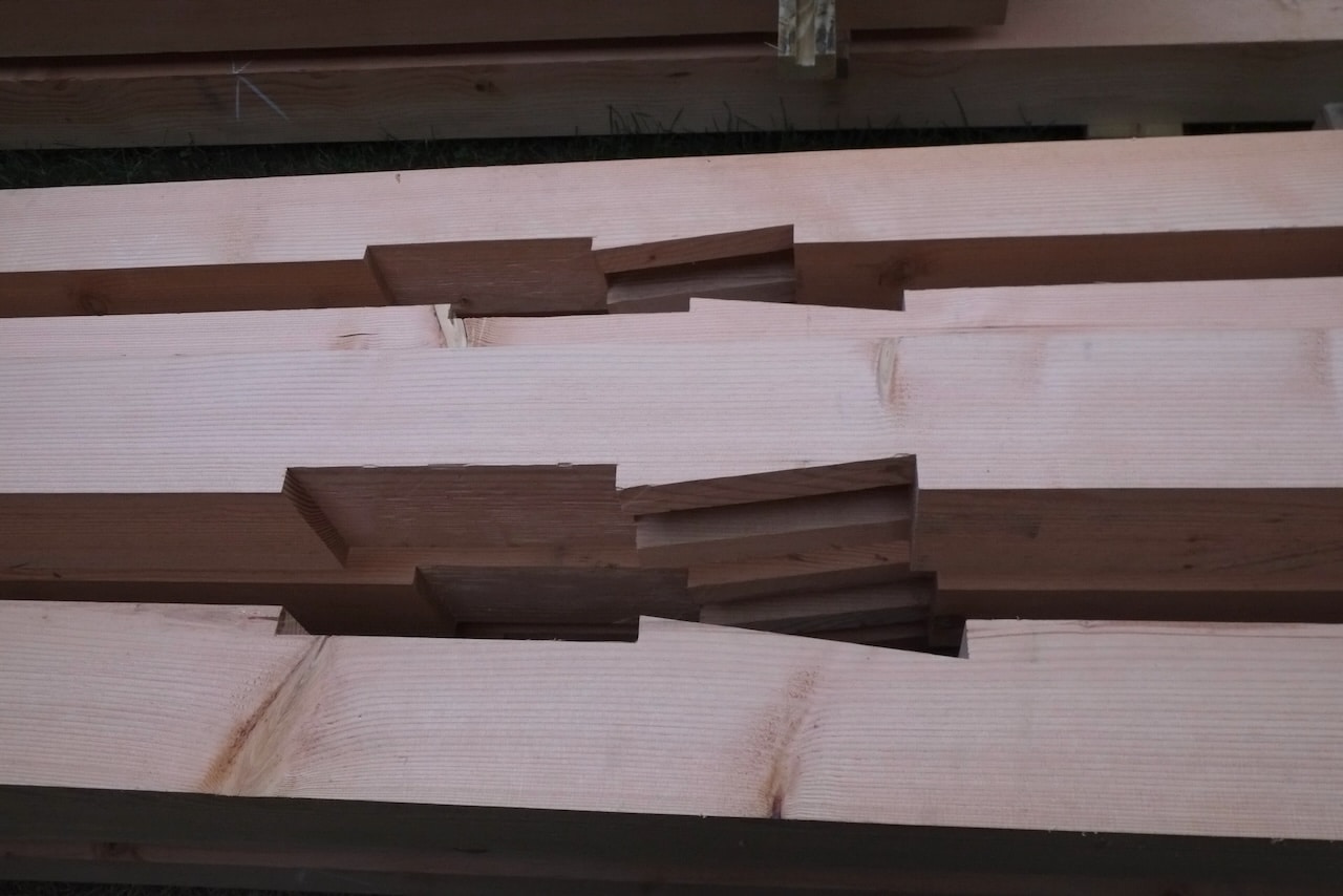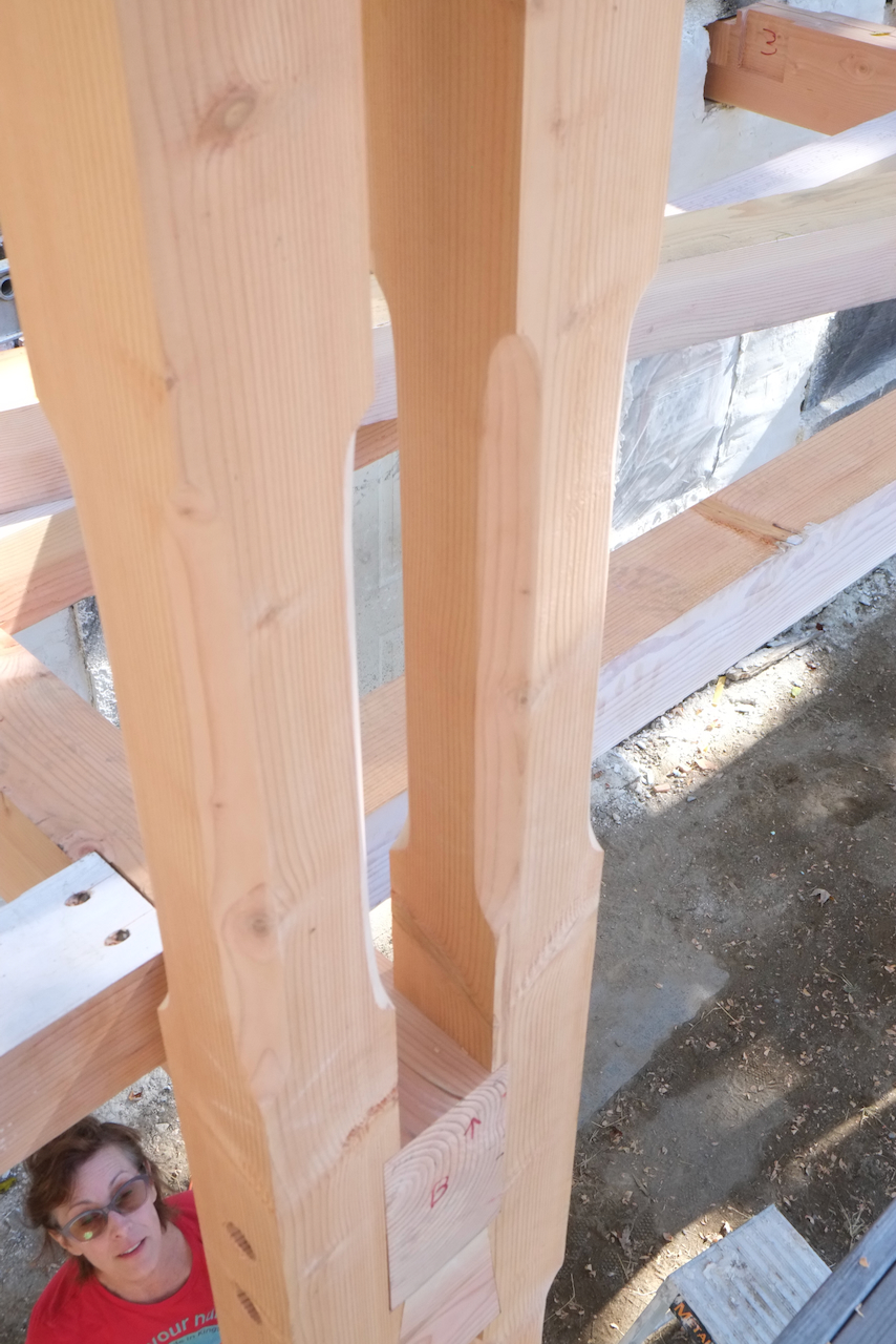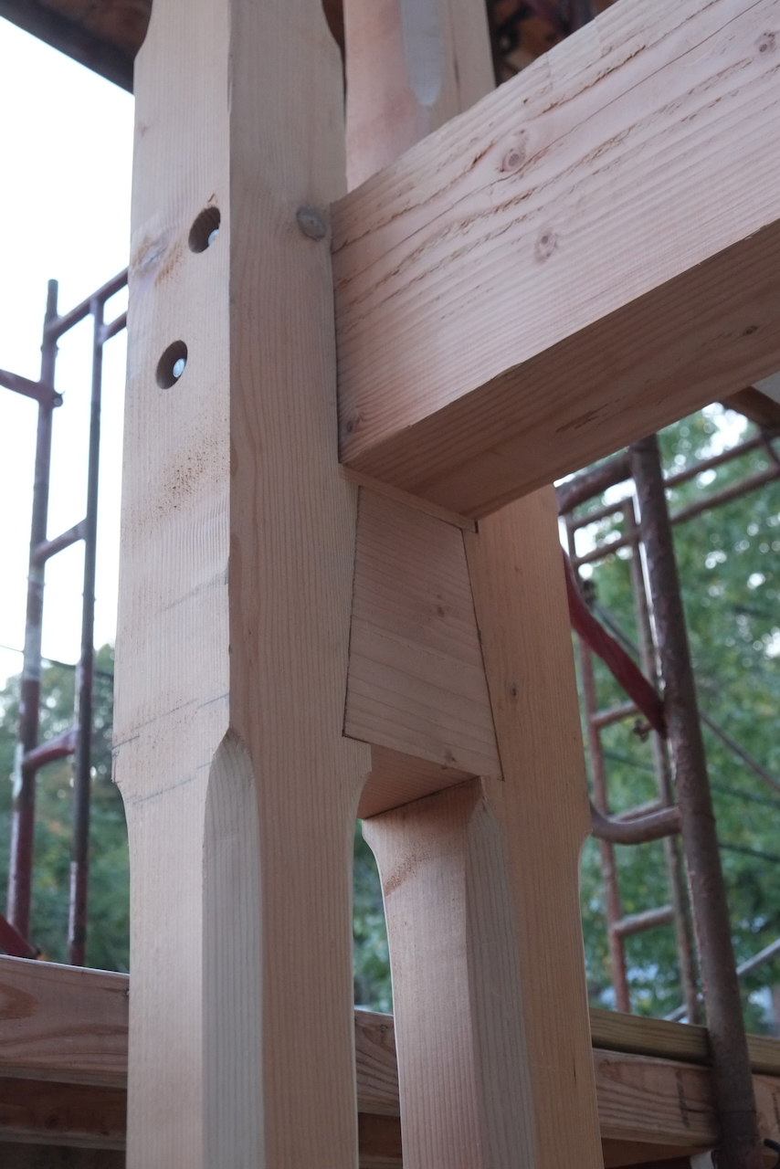 The construction techniques used were similar to the original porch, with some lovely pocket tenons, pinned in place with hardwood dowels. There are a few heavy-duty galvanised bolts here and there but they will be hidden by wooden plugs. It is a delight to look at.
