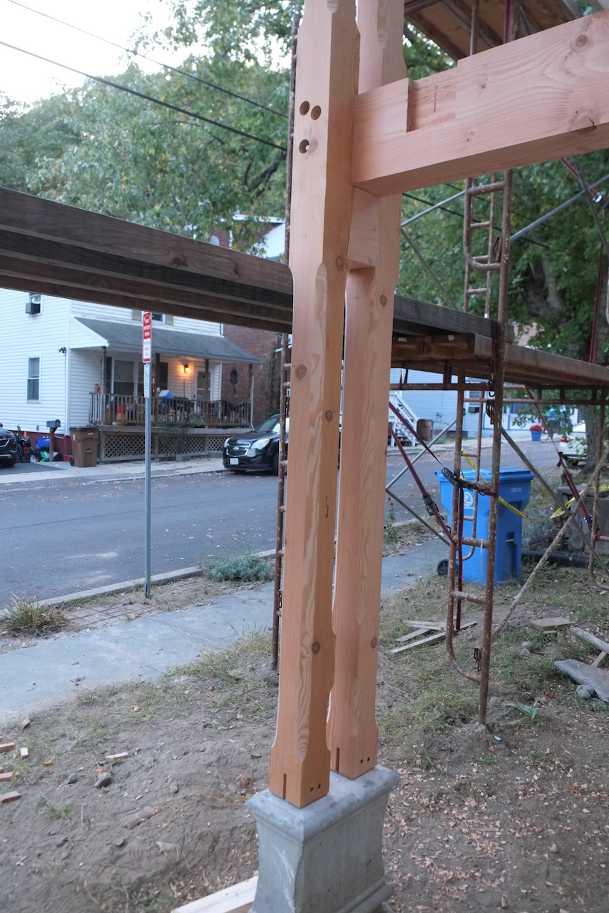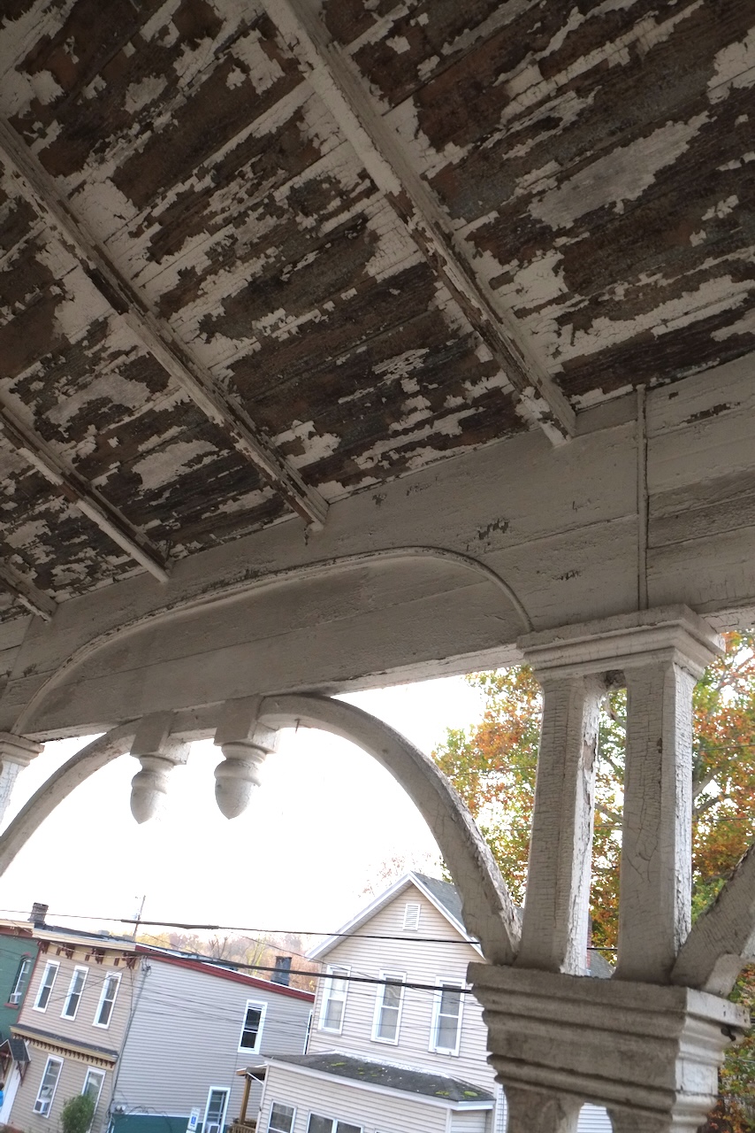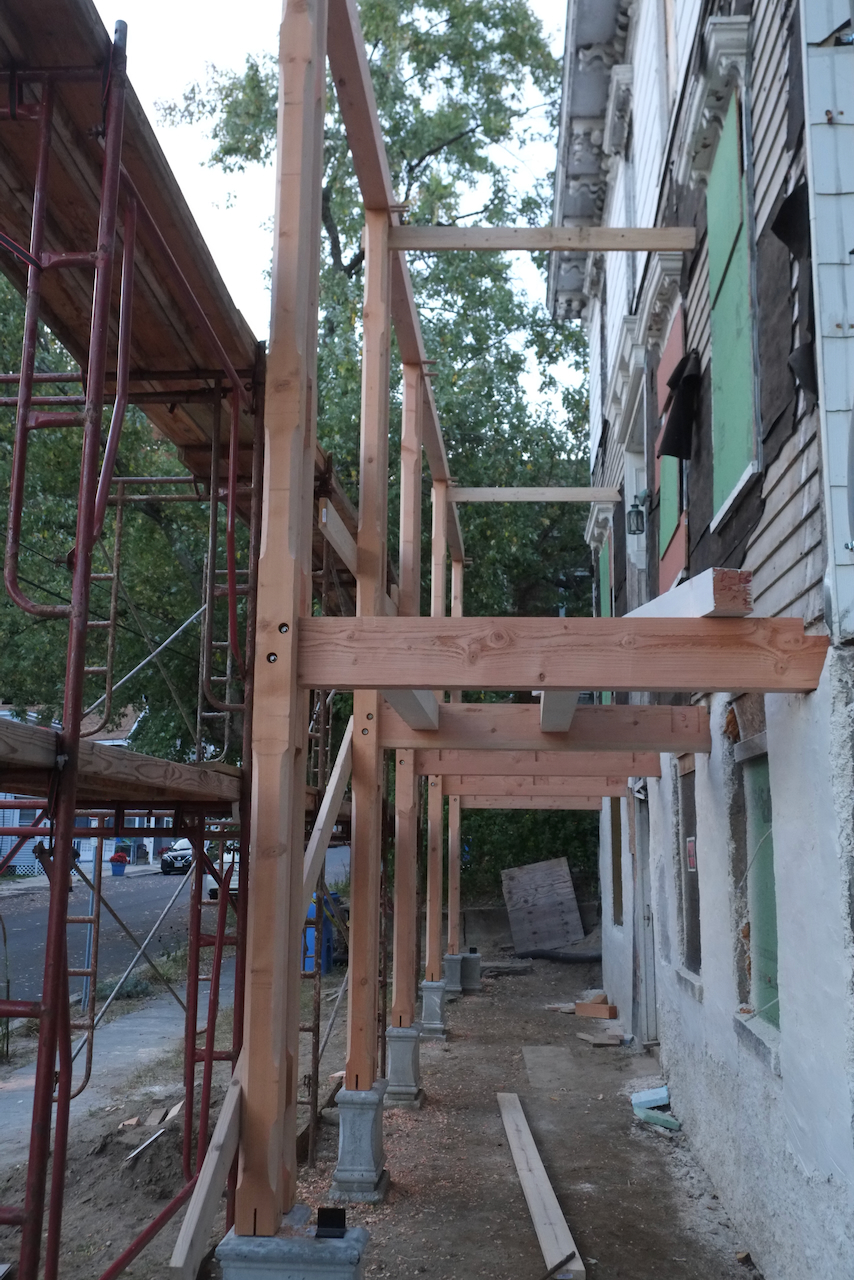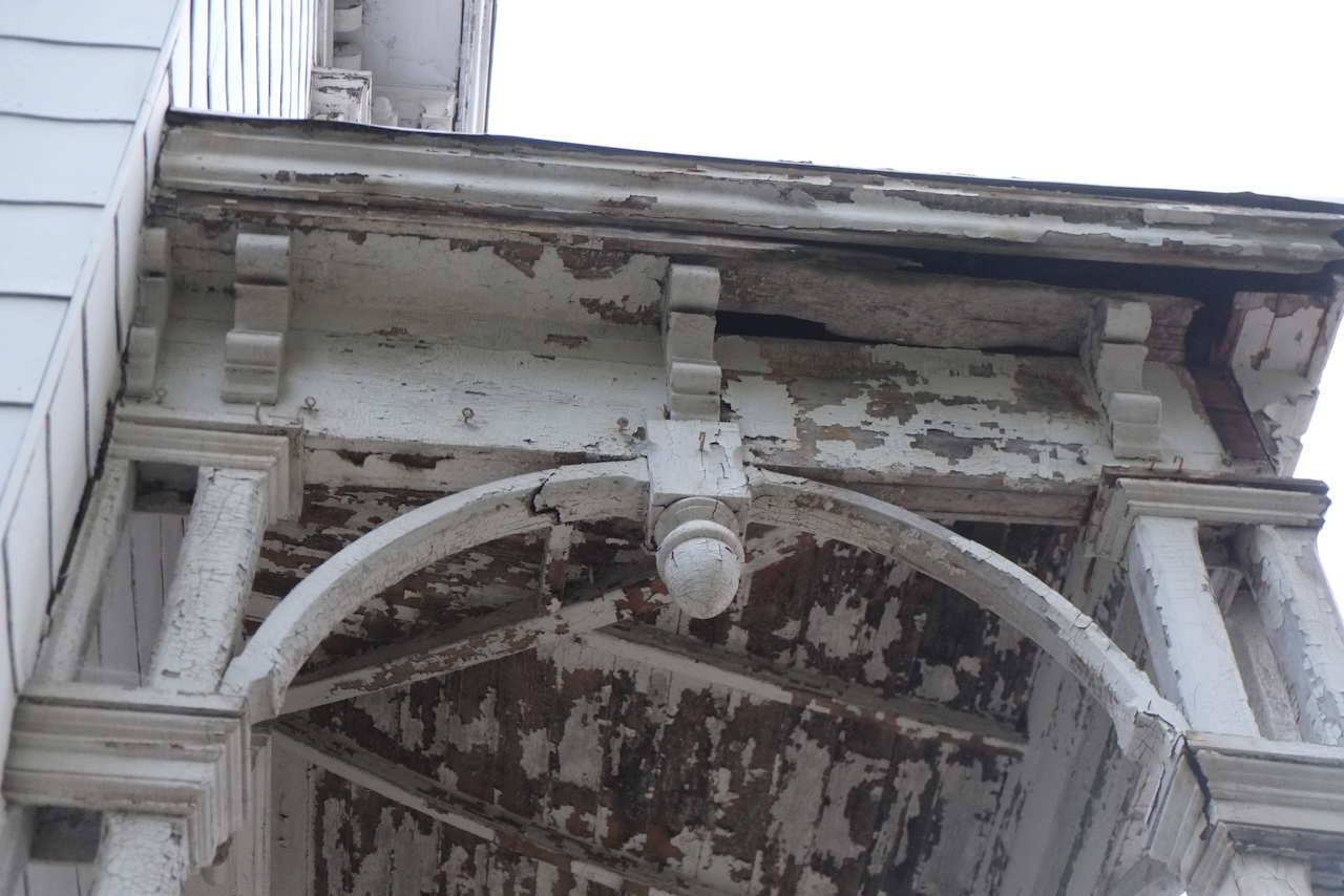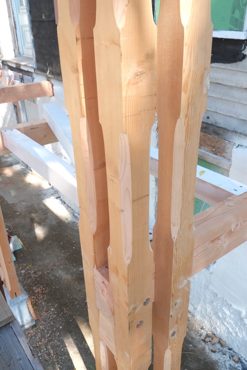 The porch is far from finished as the original had a lot of detail which you can see in the following. We’ve kept most of the original pieces, some we’ll restore and some we’ll remake. I’m glad that we’ve finally replaced the single ground-floor post (last photo) with double posts. I’m sure the porch originally had double columns on the bottom but they probably rotted away to be replaced with the single columns.