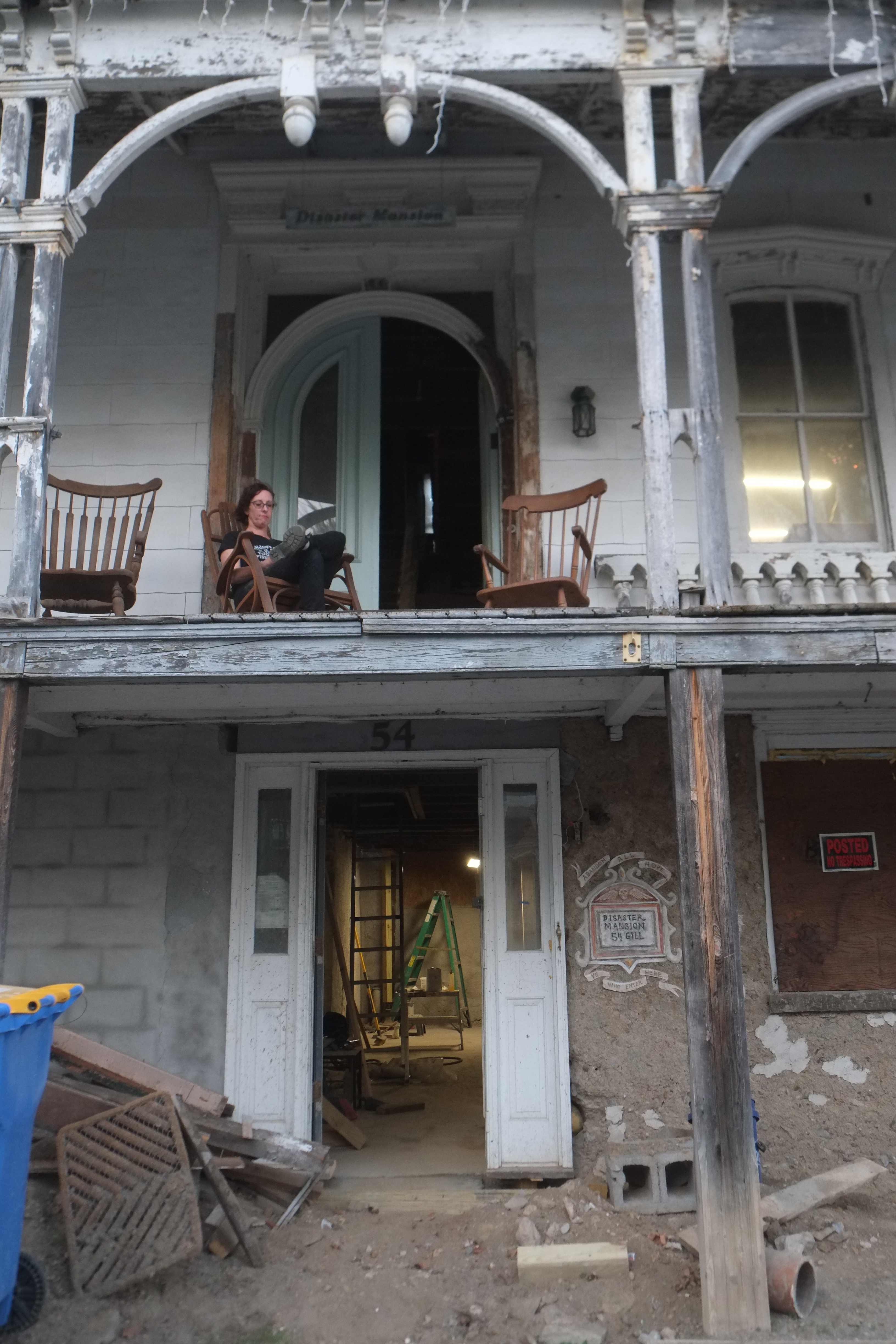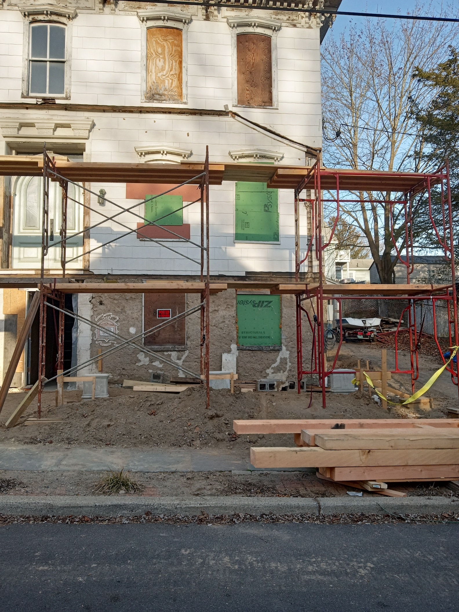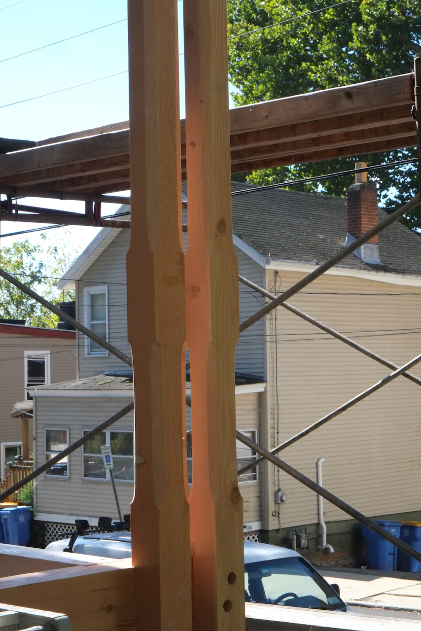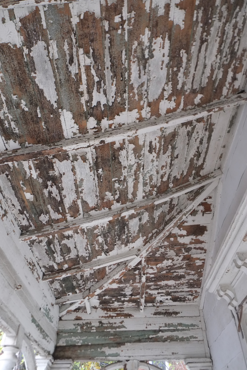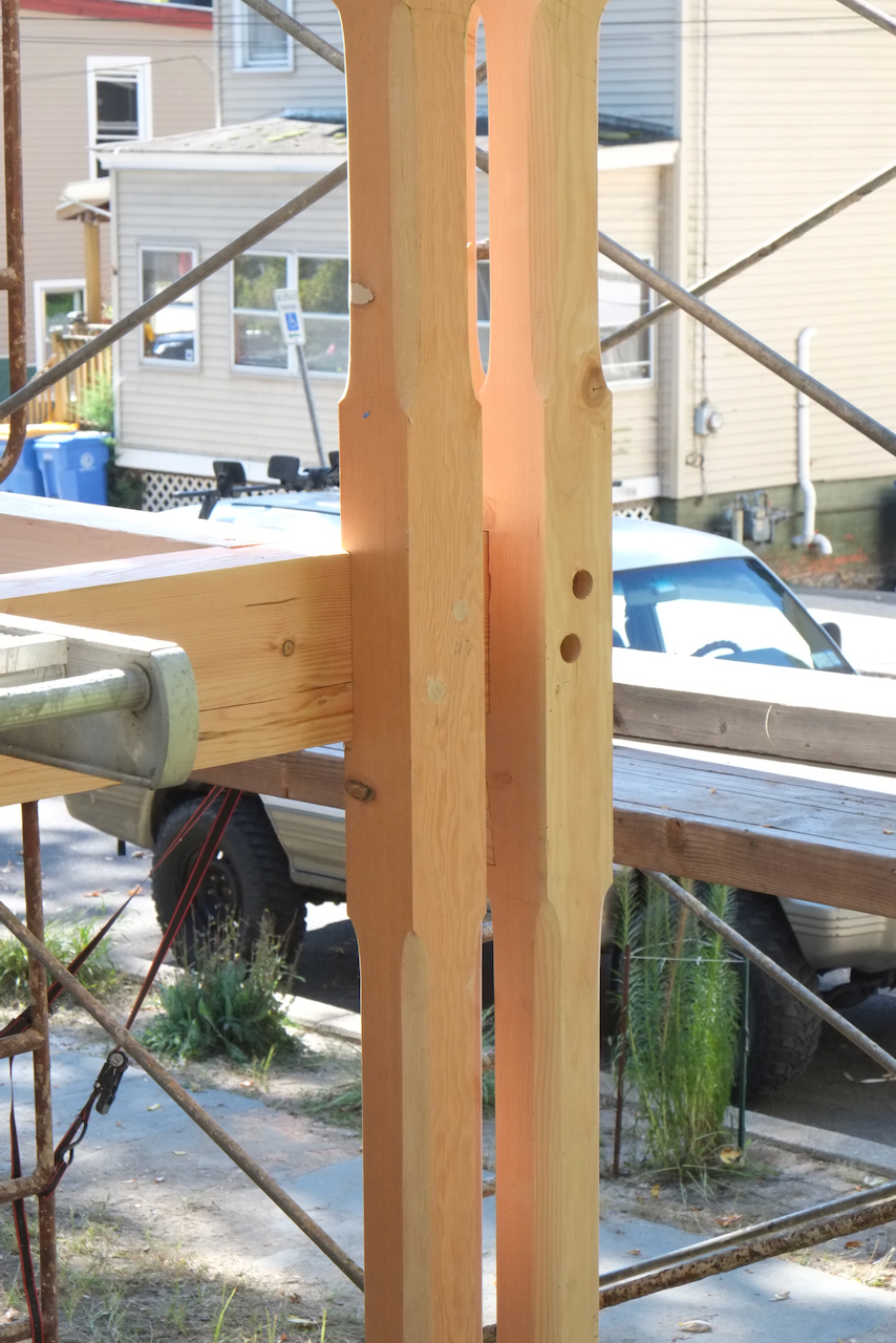 The porch is far from finished as the original had a lot of detail which you can see in the following. We’ve kept most of the original pieces, some we’ll restore and some we’ll remake. I’m glad that we’ve finally replaced the single ground-floor post (last photo) with double posts. I’m sure the porch originally had double columns on the bottom but they probably rotted away to be replaced with the single columns.