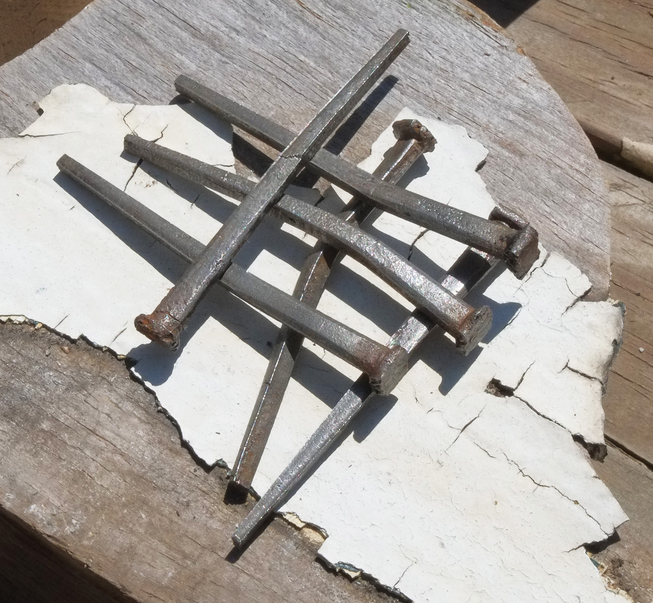 Our nails, which are rectangular, look like the Type B cut nails, Circa 1810 – 1900 which fits in with when the house was made. I believe these were made by cutting a thin tapered slice from a steel plate. I presume they had a machine that could hammer the end of the nail to make the head.