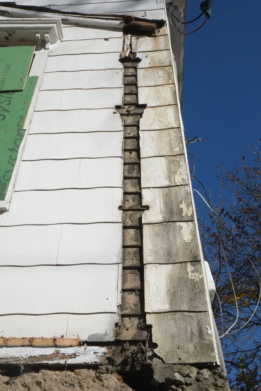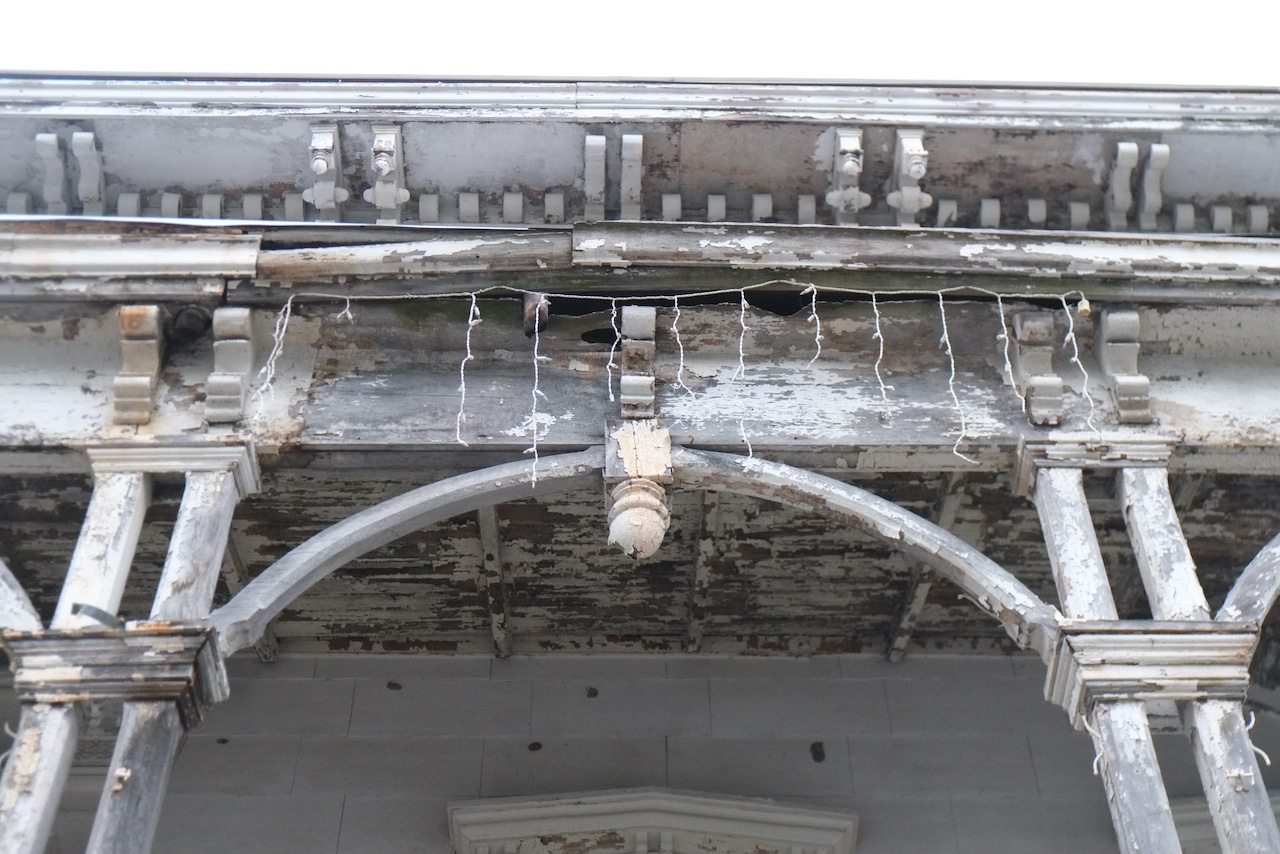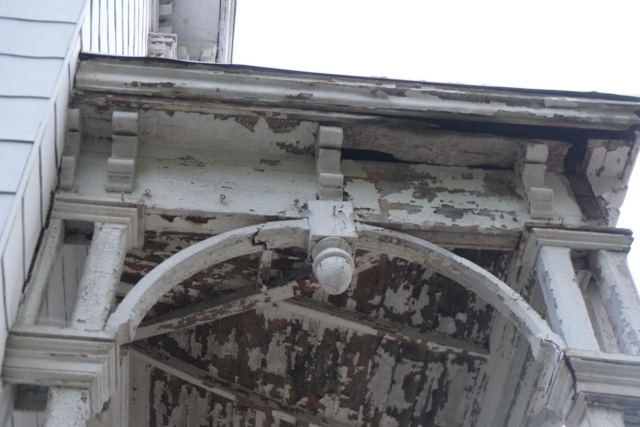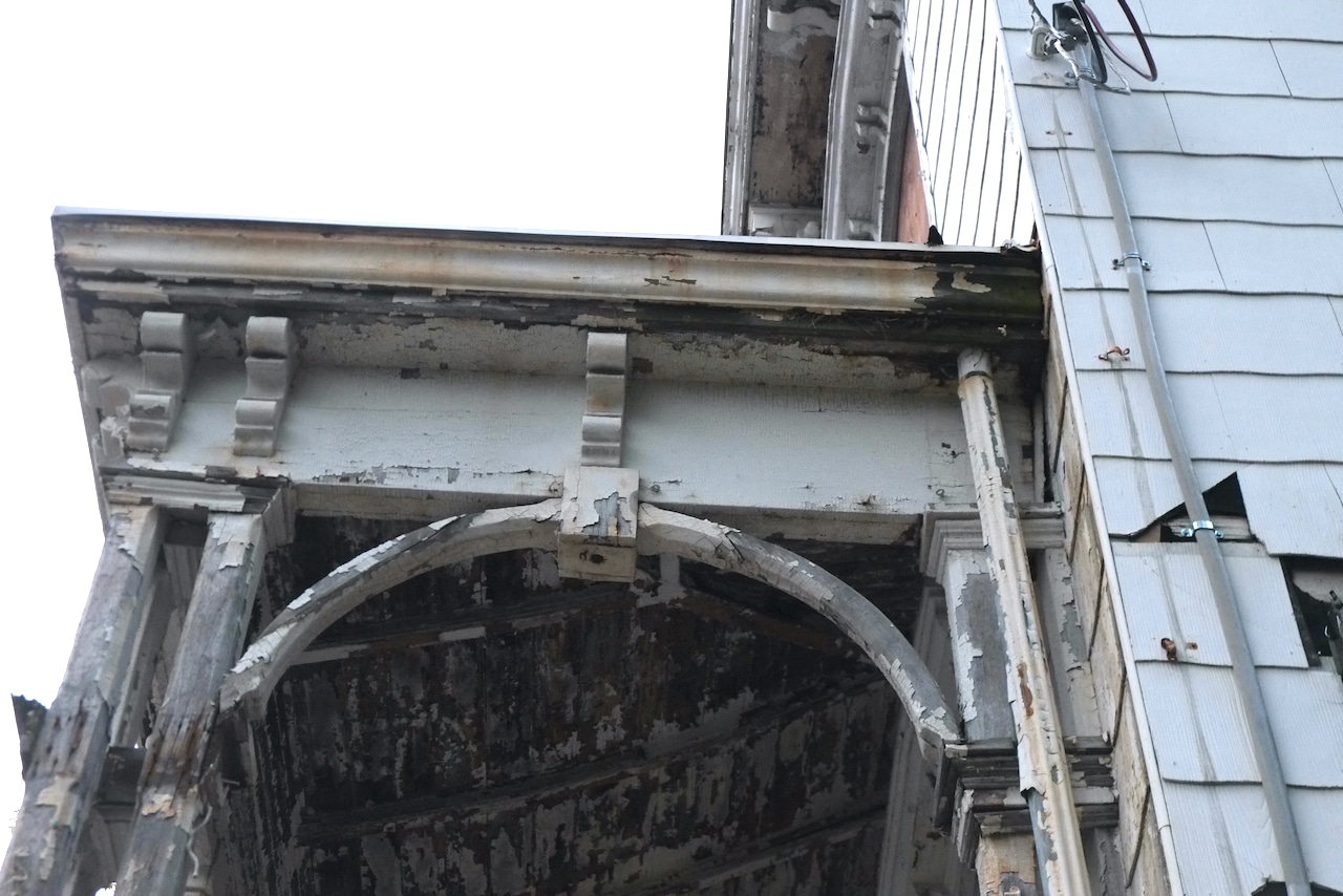 Once the scaffolding went up and a more thorough inspection was carried out it was deemed that the whole porch was in danger of collapse with the ends of the roof rafters rotten and pulling away from the house and the second floor vertical columns bowing out with barely any solid wood connecting them to the roof, so the decision was made to remove all of the porch as part of phase one. Historical society and building department were informed of this decision. I didn’t expect it to come down so quickly, but if it’s unsafe, why wait. Andre did save a lot of the wood so we could recreate the new roof exactly and you can see that the rot is major.