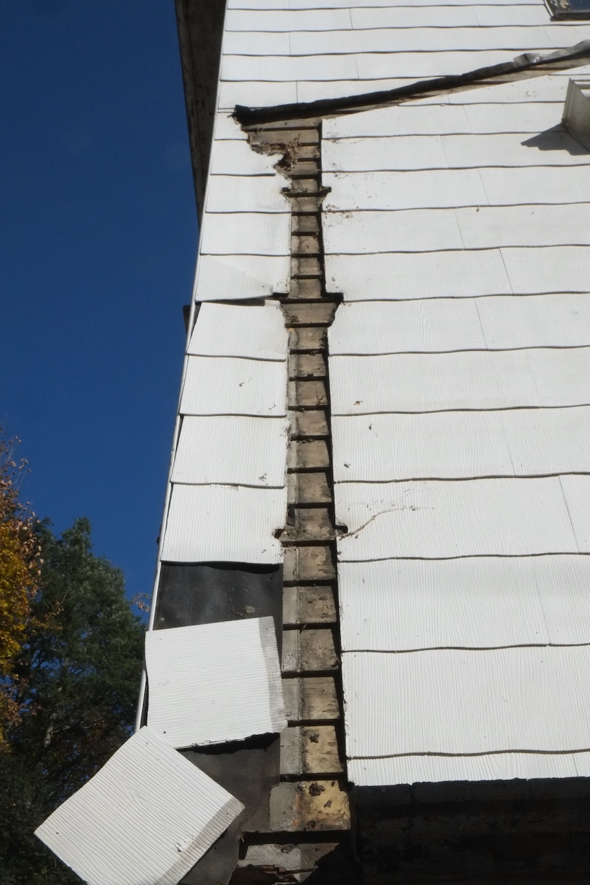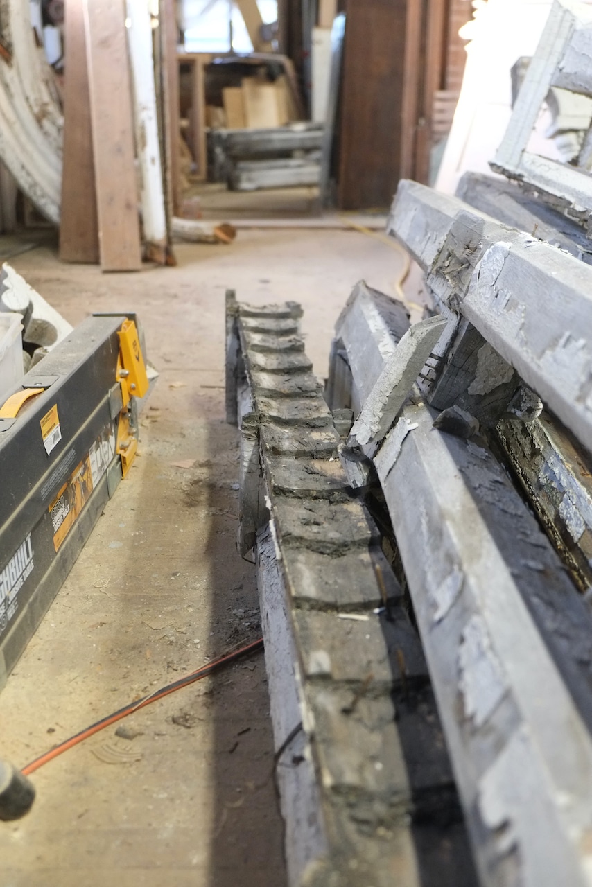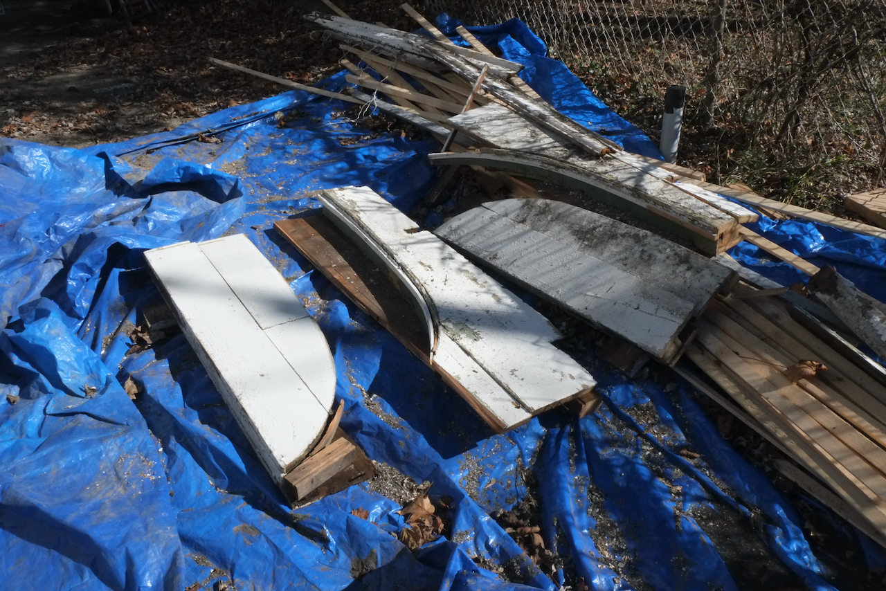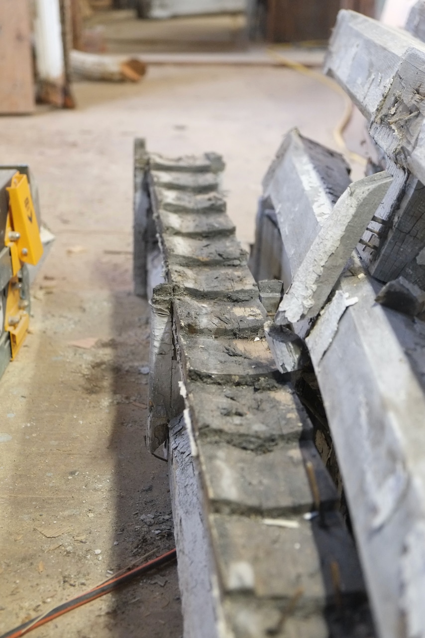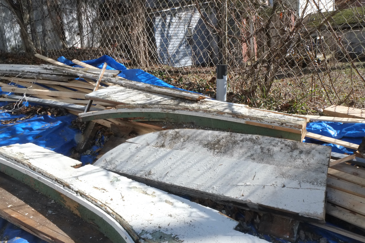 Once the scaffolding went up and a more thorough inspection was carried out it was deemed that the whole porch was in danger of collapse with the ends of the roof rafters rotten and pulling away from the house and the second floor vertical columns bowing out with barely any solid wood connecting them to the roof, so the decision was made to remove all of the porch as part of phase one. Historical society and building department were informed of this decision. I didn’t expect it to come down so quickly, but if it’s unsafe, why wait. Andre did save a lot of the wood so we could recreate the new roof exactly and you can see that the rot is major.