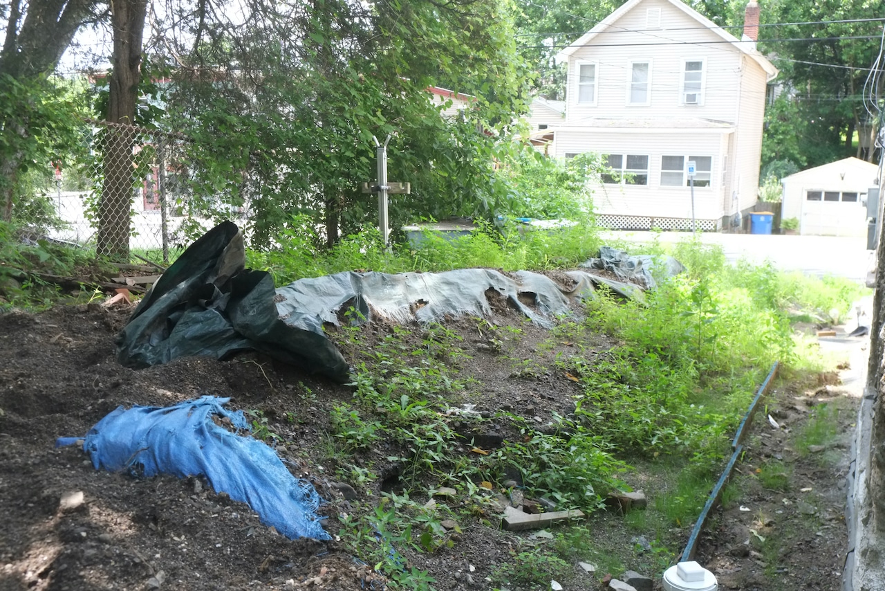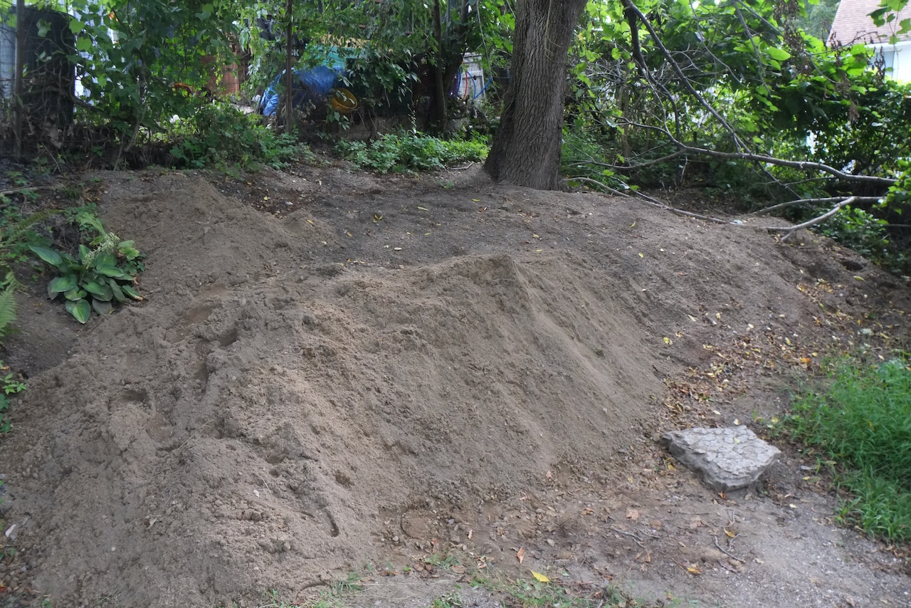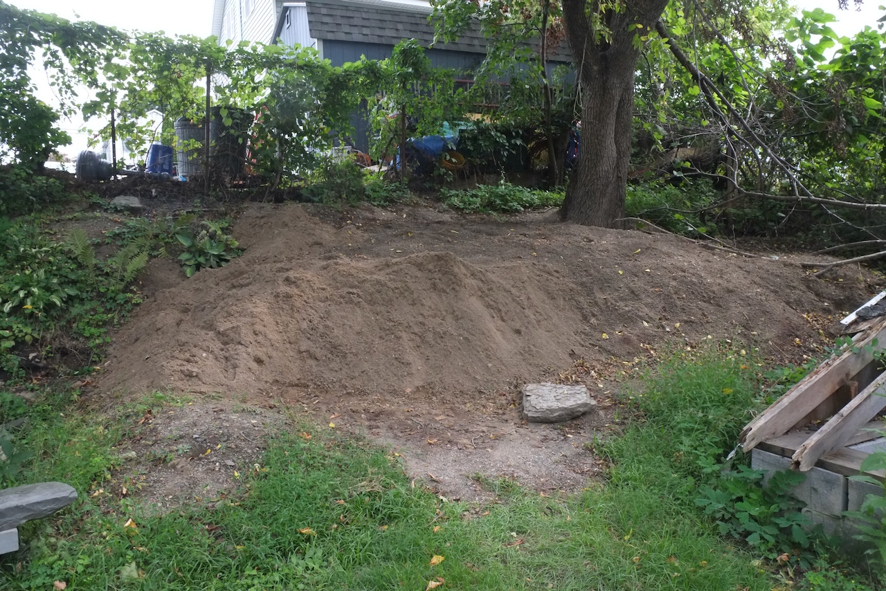 During the excavation of our basement floor and foundation drain we accumulated a large quantity of sandy soil. We’ve been pondering about what to do with the dirt for last year or two. We thought of getting a skip (dumpster), finding someone who wanted dirt (people do) and then we realised that we had the perfect spot for it at the back of our garden – don’t know why we didn’t think of this earlier.