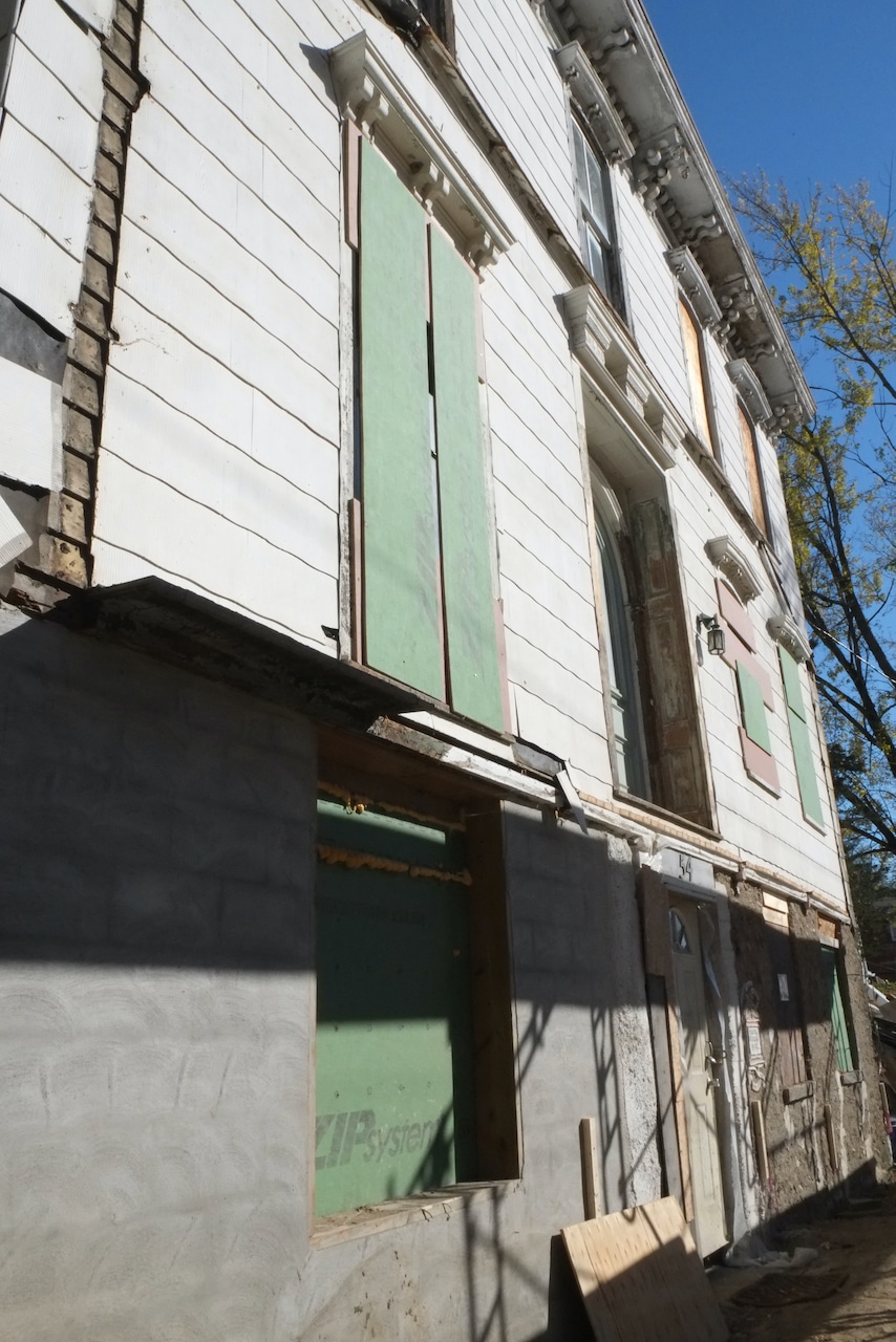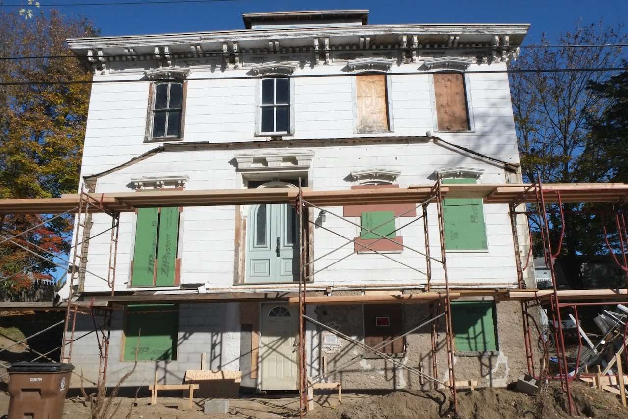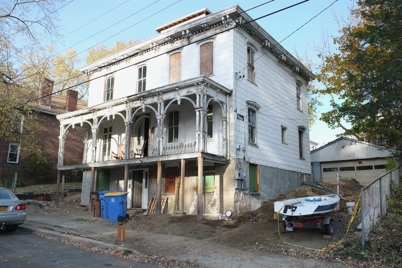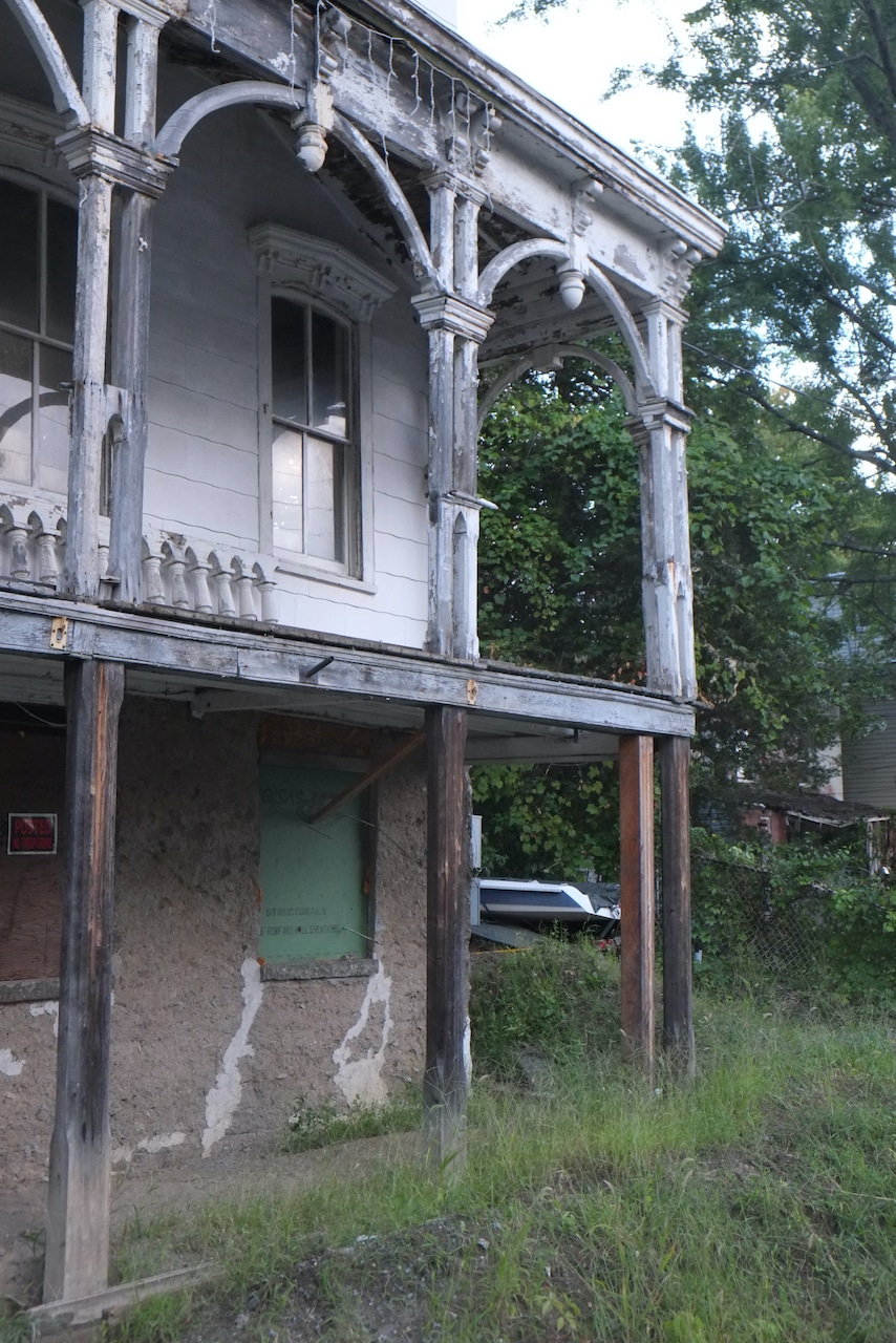 Potential candidates for a historic district include 1 Ponckhockie Street (c. 1870), which the survey calls “the finest and largest brick example of an Italianate house” in Ponckhockie; 9 Grove Street (c. 1880), one of the few high-style Queen Anne houses in the neighborhood and one of two executed in brick; and 54 Gill Street (c. 1869), the former home of David Gill Sr., for whom the street is named and possibly the largest wooden Italianate house in Ponckhockie. Rhoads wrote in his Kingston architectural guide that the owner of 54 Gill accomplished “a virtuoso performance with Italianate paired brackets supporting the projecting eaves ….” Its rehabilitation is being documented online at the Disaster Mansion website.