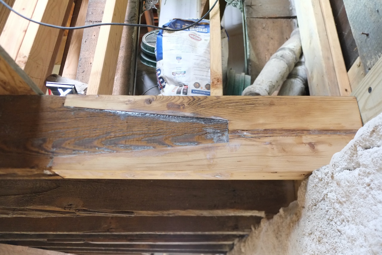 Like most projects on the house I wanted to do a respectful job so instead of butt jointing in a new piece and sistering on a 2×8″ (adding extra wood to strengthen a damaged beam), I thought I’d do some joint work. I’ll still add a 2×8″ but only on one side as my joint will be stronger than a butt joint. I’m not sure this joint has a name, it’s slightly similar to a scarf joint.