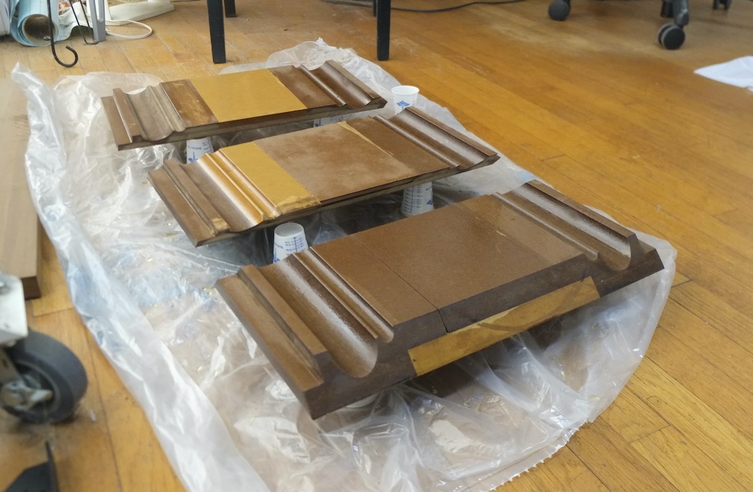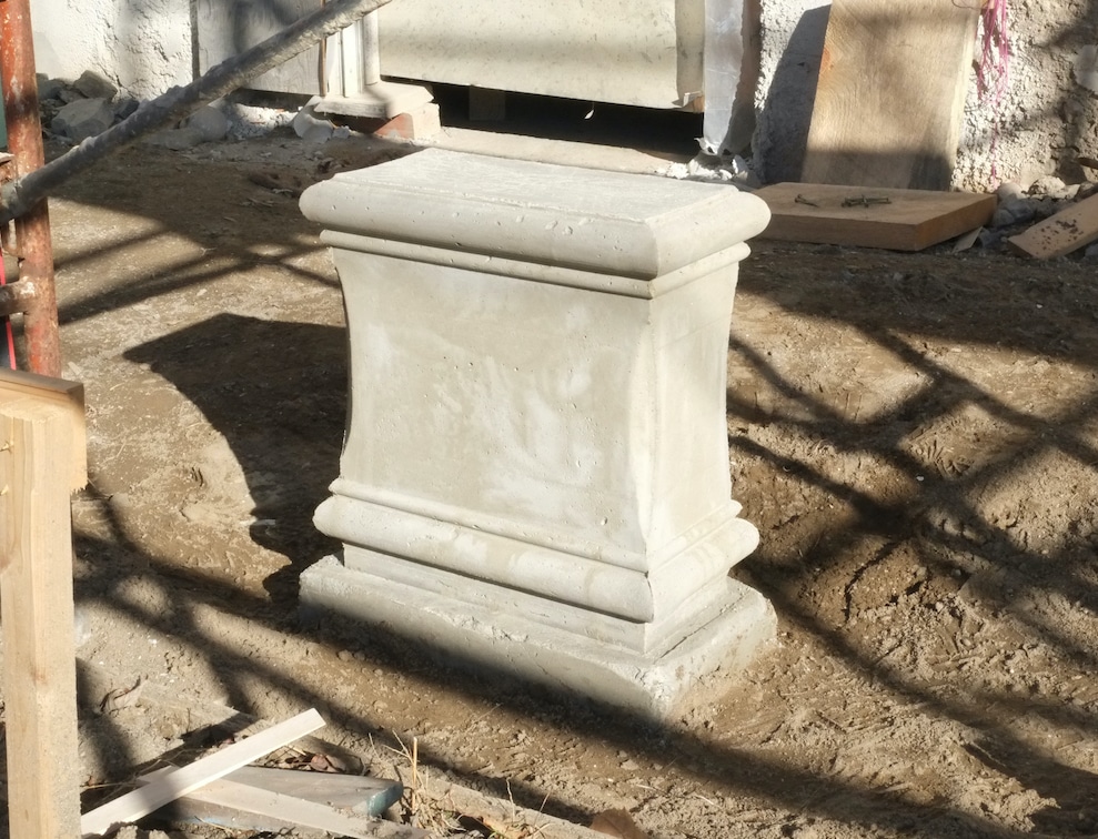 I coated the finished pieces with a penetrating epoxy and once set I applied a liberal coating of furniture wax. The last release coat will be cooking oil which Andre will apply on the day. I’ve only made two moulds one for the double column and one for the triple column so they need to be reused.