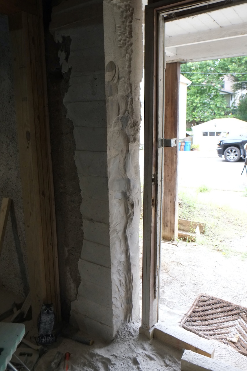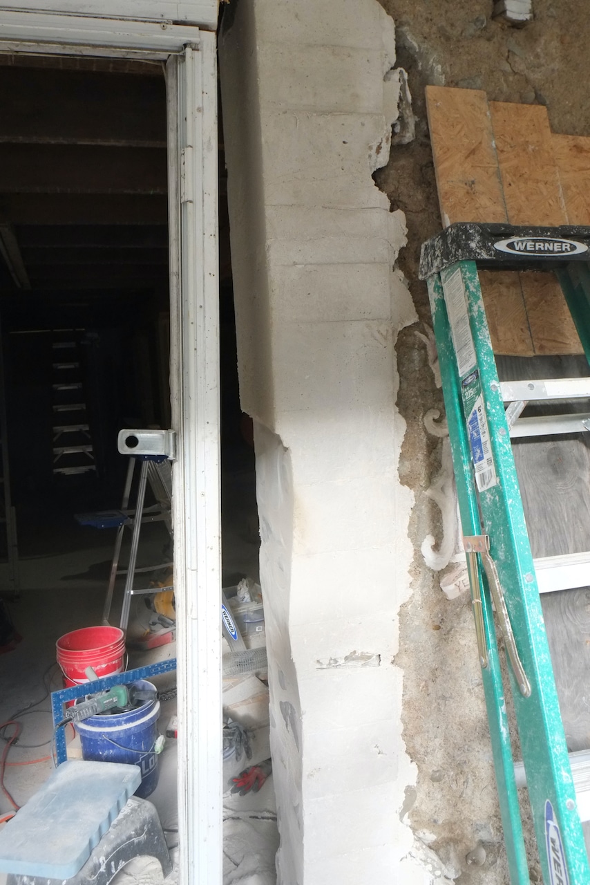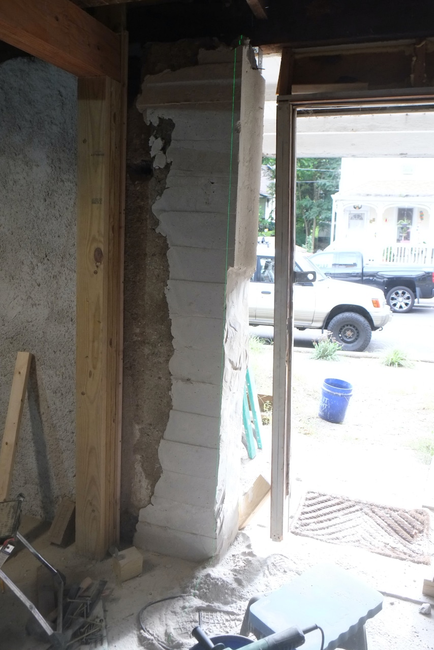 Back again to the front door. We’re trying to get the opening correct for the door we restored a few years ago. The current door (circa 70s, 80s) doesn’t align vertically with the door above it, so our aim is to shift the door a bit to the left so it does – we believe the original door was centered. The new door is 3″ wider than the current door but we will still hope to have side windows to let in a bit more light.