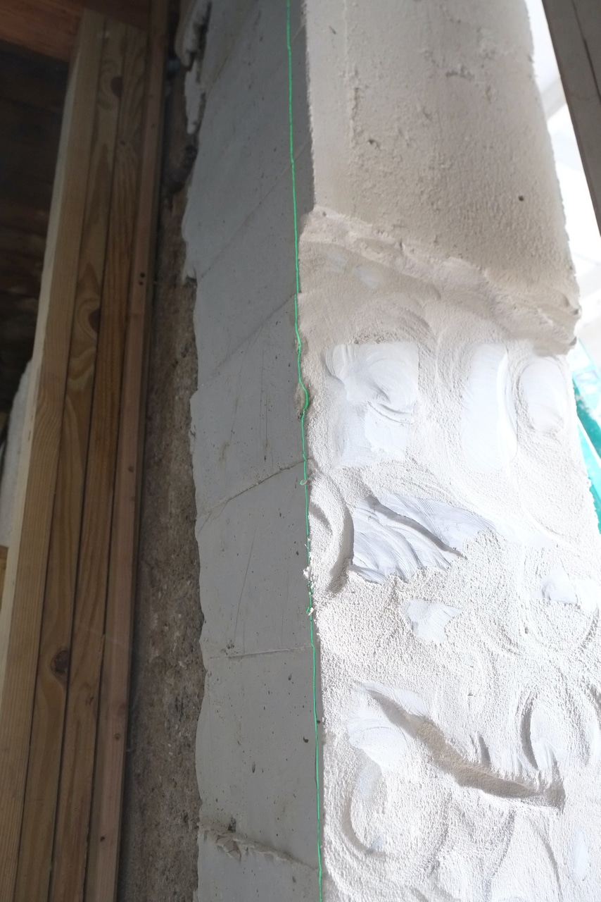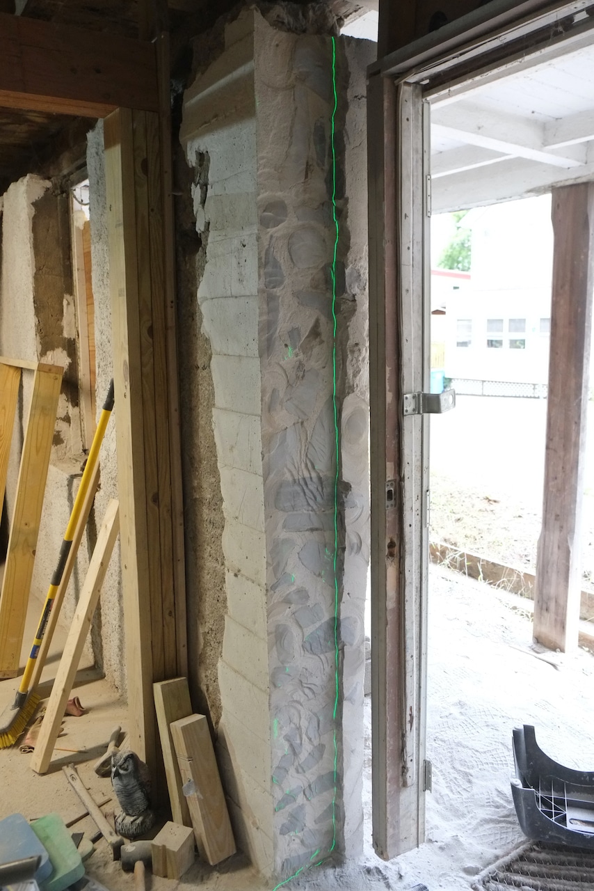 First pass of the grinding removed 1″ – 2″ of the new wall and then I decided to remove another 1″ – 2″ but this time, not extending to the outside so the pressure treated wooden door jams aren’t visible from the outside. You can see the the laser line I’m trying to keep to in the photos below.