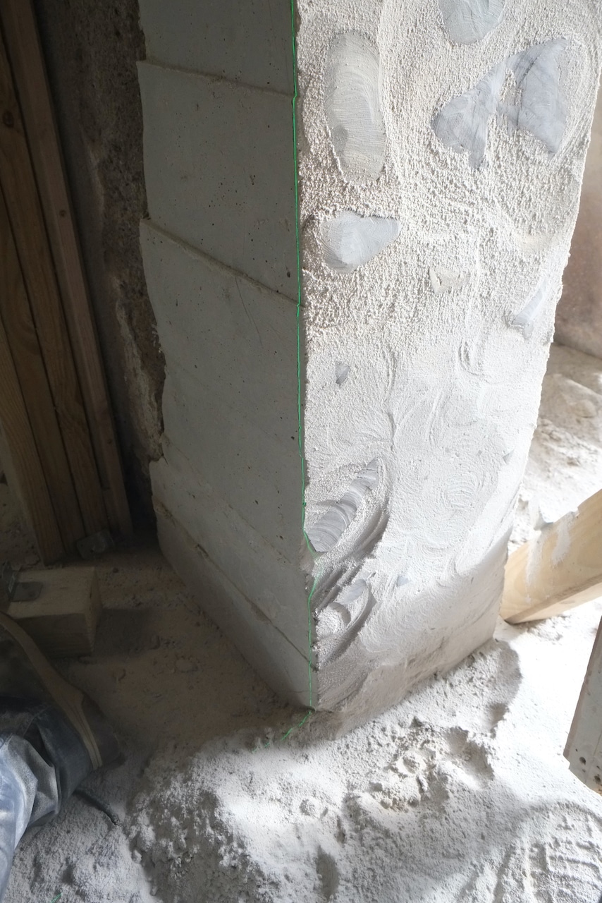 Because the ground walls aren’t perfect, we sprayed them with lime mortar and then I plan to grind the surface flat so the door jams fits snugly. Lime mortar is fast to grind away, just very messy. While we’re spraying mortar we also started to spray the few remaining untreated walls in the house. There was a bit of prep as we had to remove all the lose stuff which covered most of the surface.