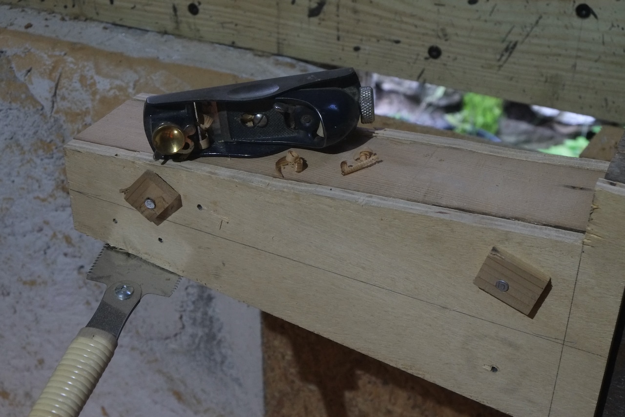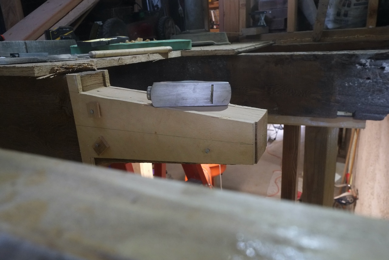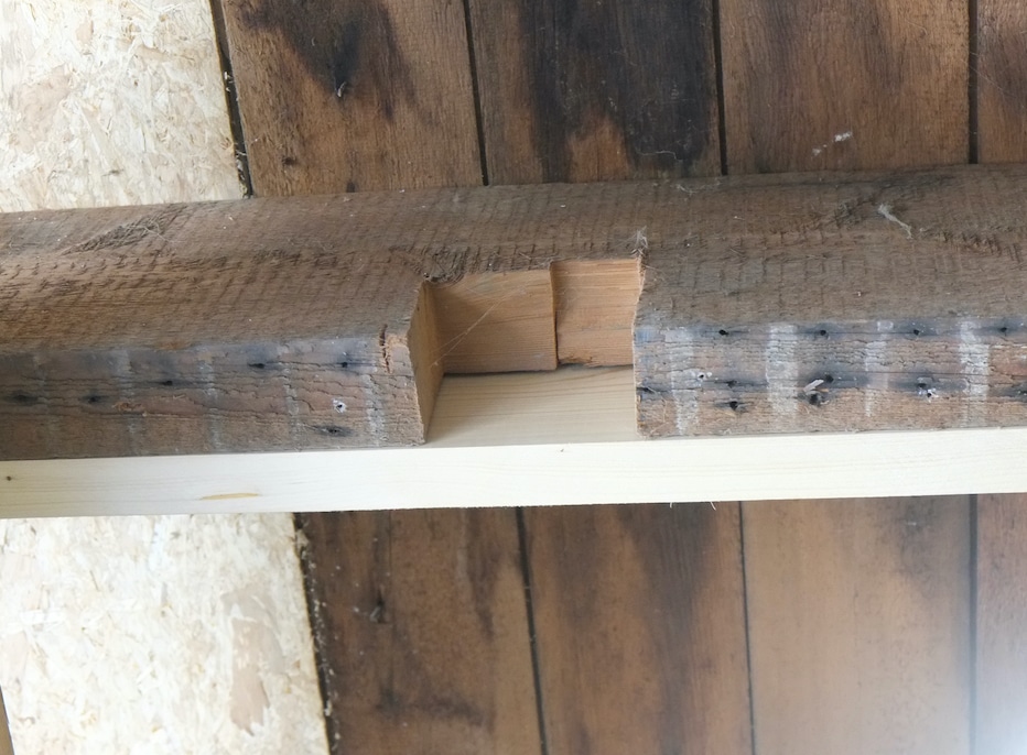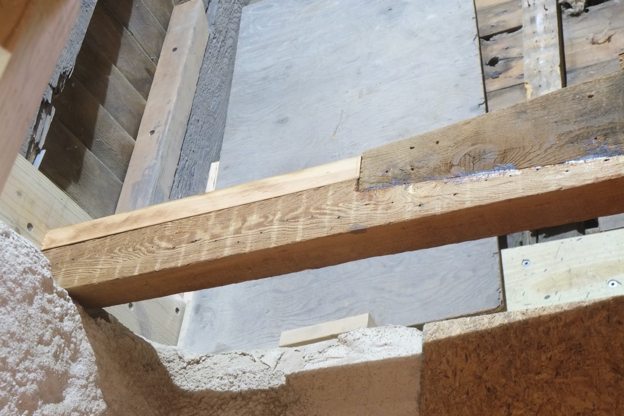 As I didn’t have any wood with similar dimensions to the joist, I laminated three pieces of old growth lumber together. I used West System epoxy so this will be a stronger than wood bond, plus I’m running 3/8″ bolts vertically through the joint as an extra safe guard. The reason the center piece is lighter is because I planed it down.