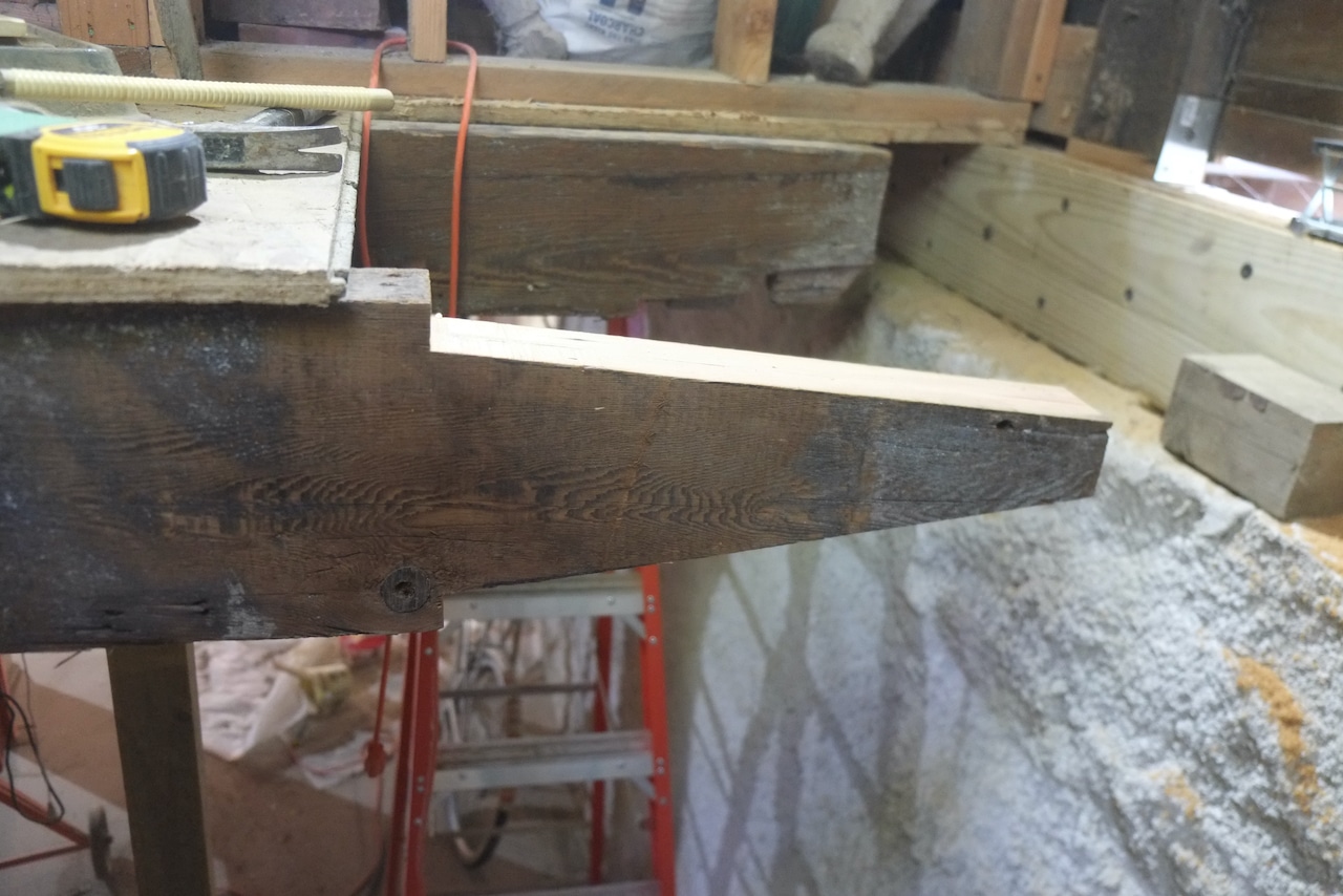 Having finished the rim joist it was time to replace the floor joists. About four of them were badly rotten and not even connected to anything, just hanging in the air. Rather than do a butt joint and sister them I decided to try some joint work to add a little more strength. I’ll still sister, but liked the aesthetics of a nice joint. Royal pain in the butt to make them, but I think they all turned out pretty good. For the wood I used some old growth timber left over from a previous wall demo.