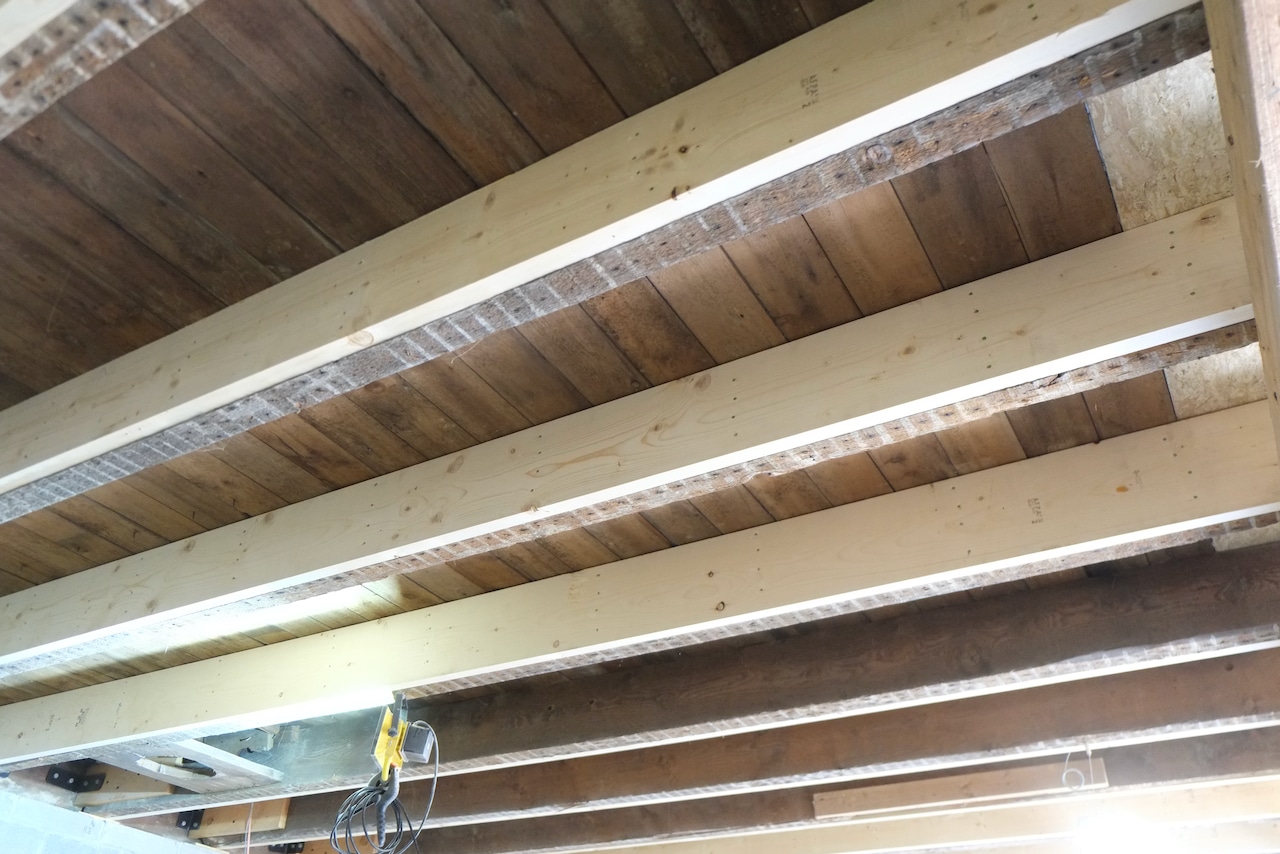 A while back we were discussing some joist repairs I was doing with our carpenter, Andre, and he thought the original floor joists over the main span of the ground floor probably wouldn’t be up to modern building code, especially as in places the joist had been badly butchered with 3-4″ notches cut out of them.