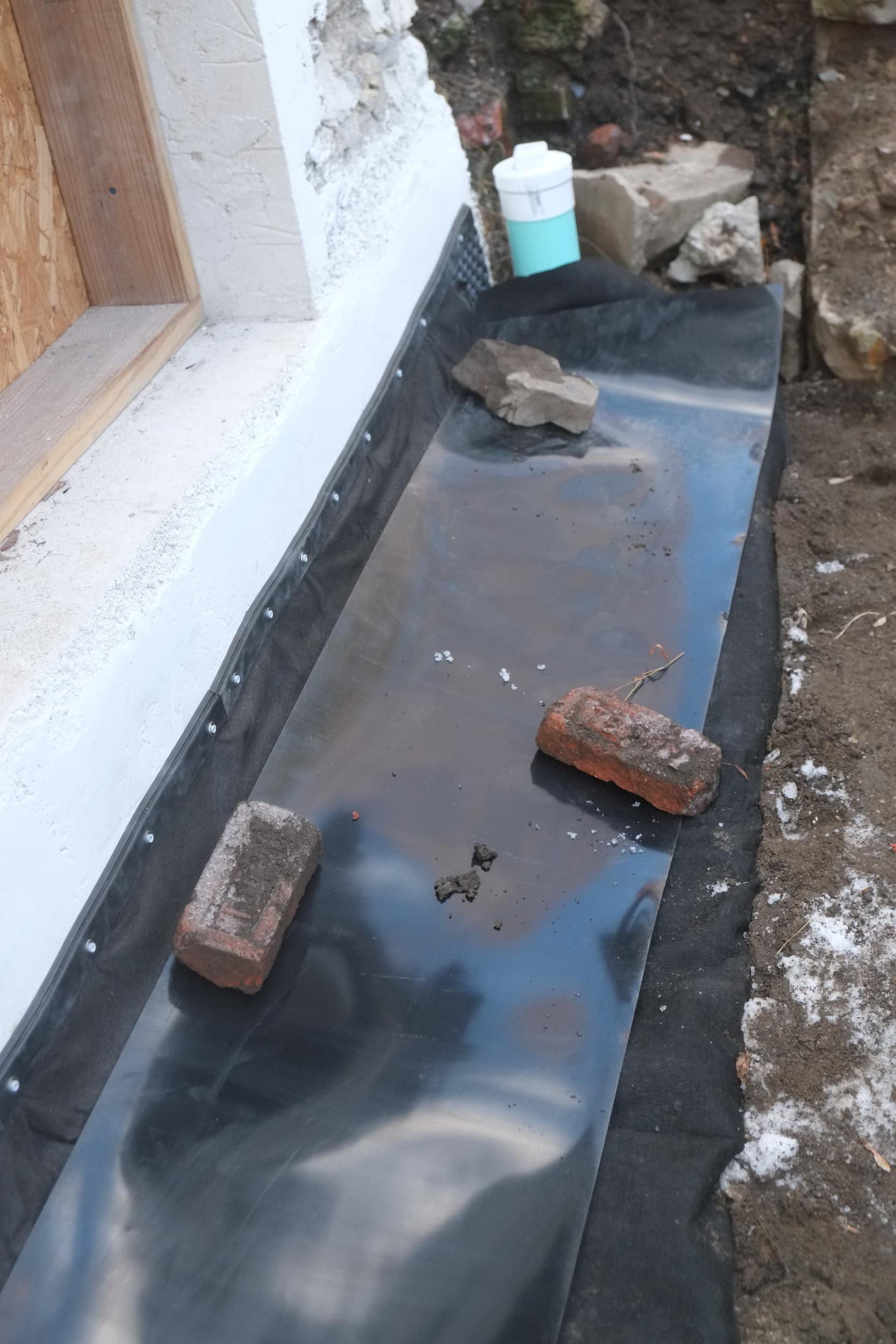 After smoothing down the fabric and apron I added the plastic membrane, for this I used an 18″ wide roll of rhizome barrier which is used to prevent bamboo rhizomes from spreading. This is tough stuff and I got it in 40 mil (a little over 1mm) and it would be hard to puncture this stuff with a shovel. As I had previously sloped the gravel away from the house the membrane is similarly sloped to help divert ground water away from the house. Once this was down, it was time to cover up everything.