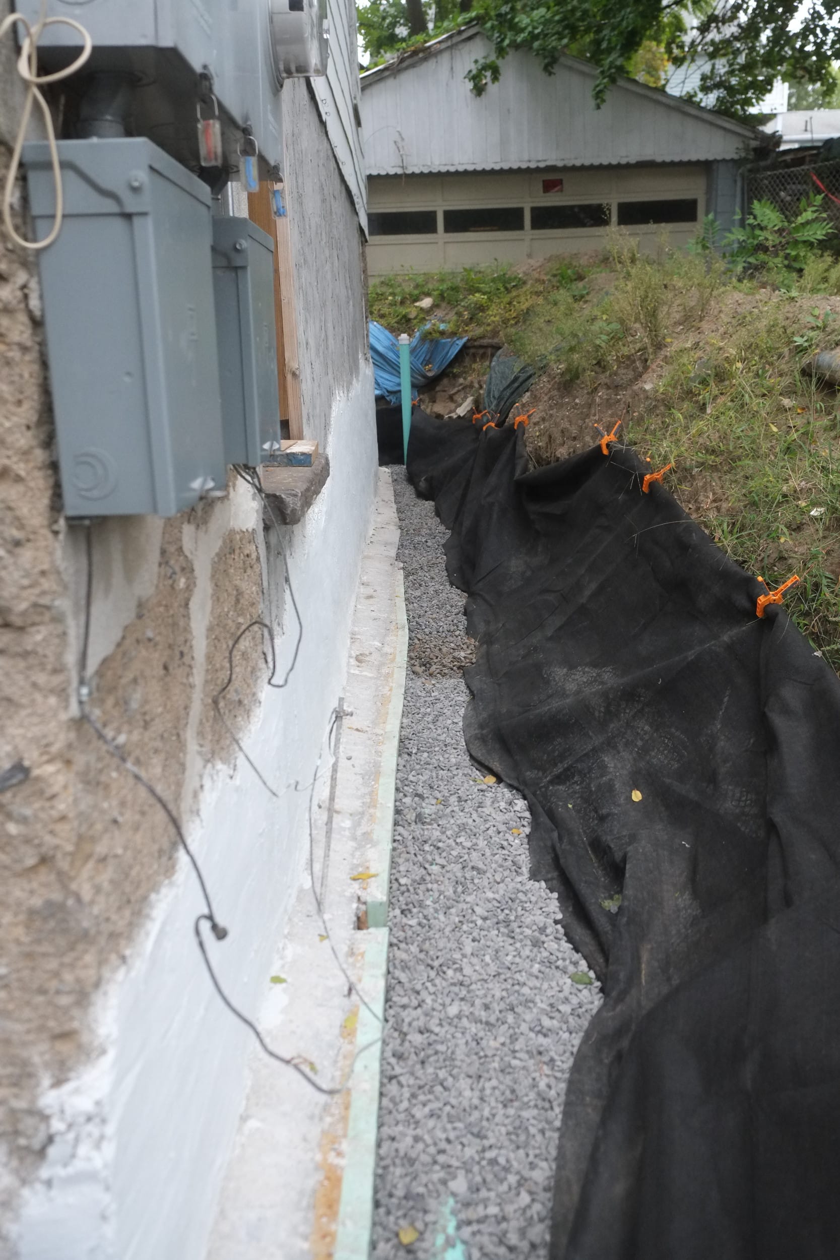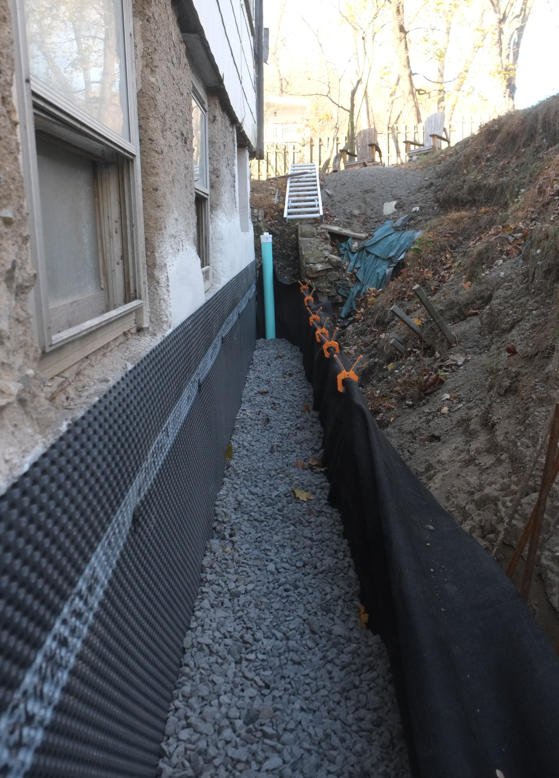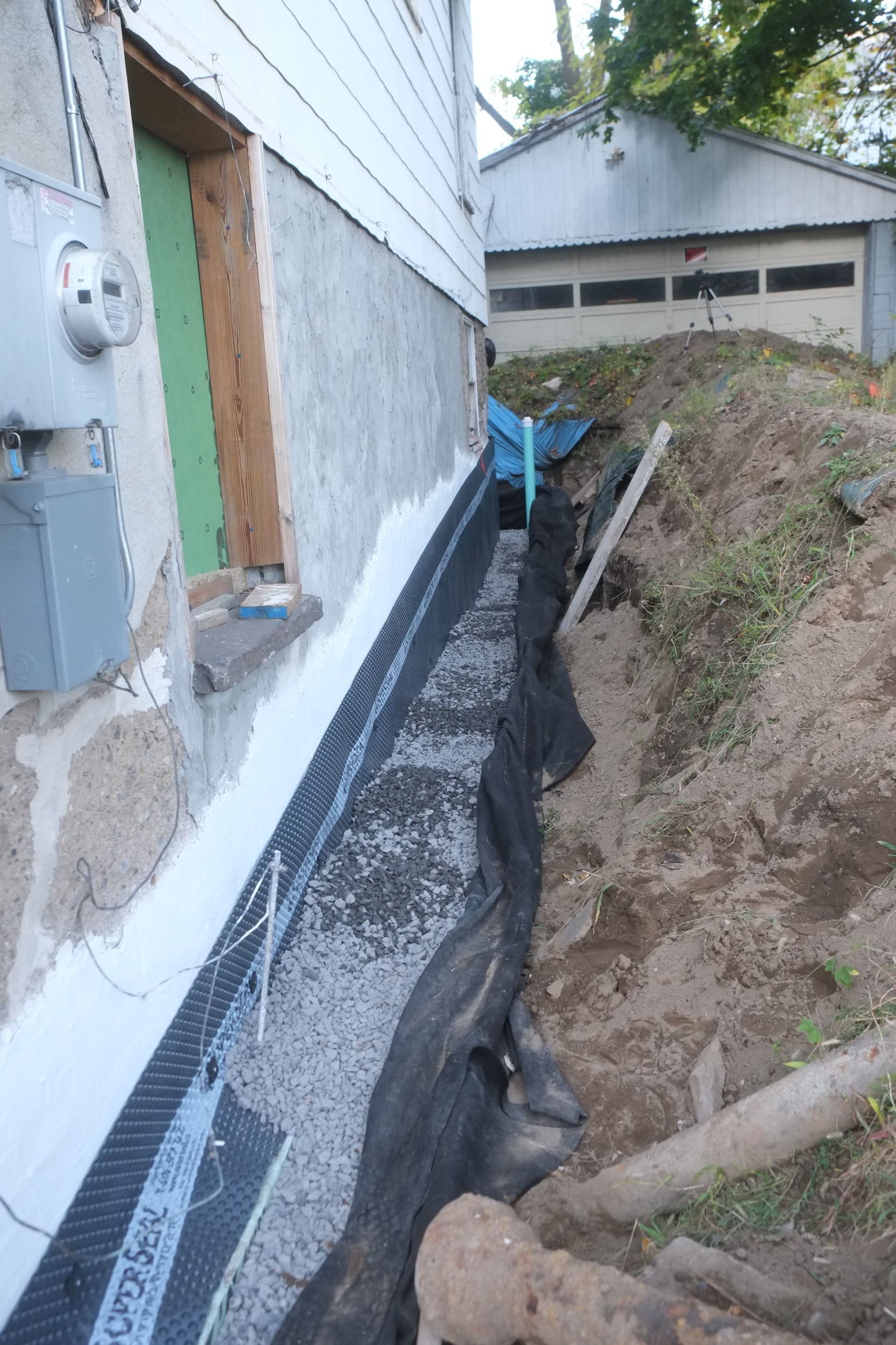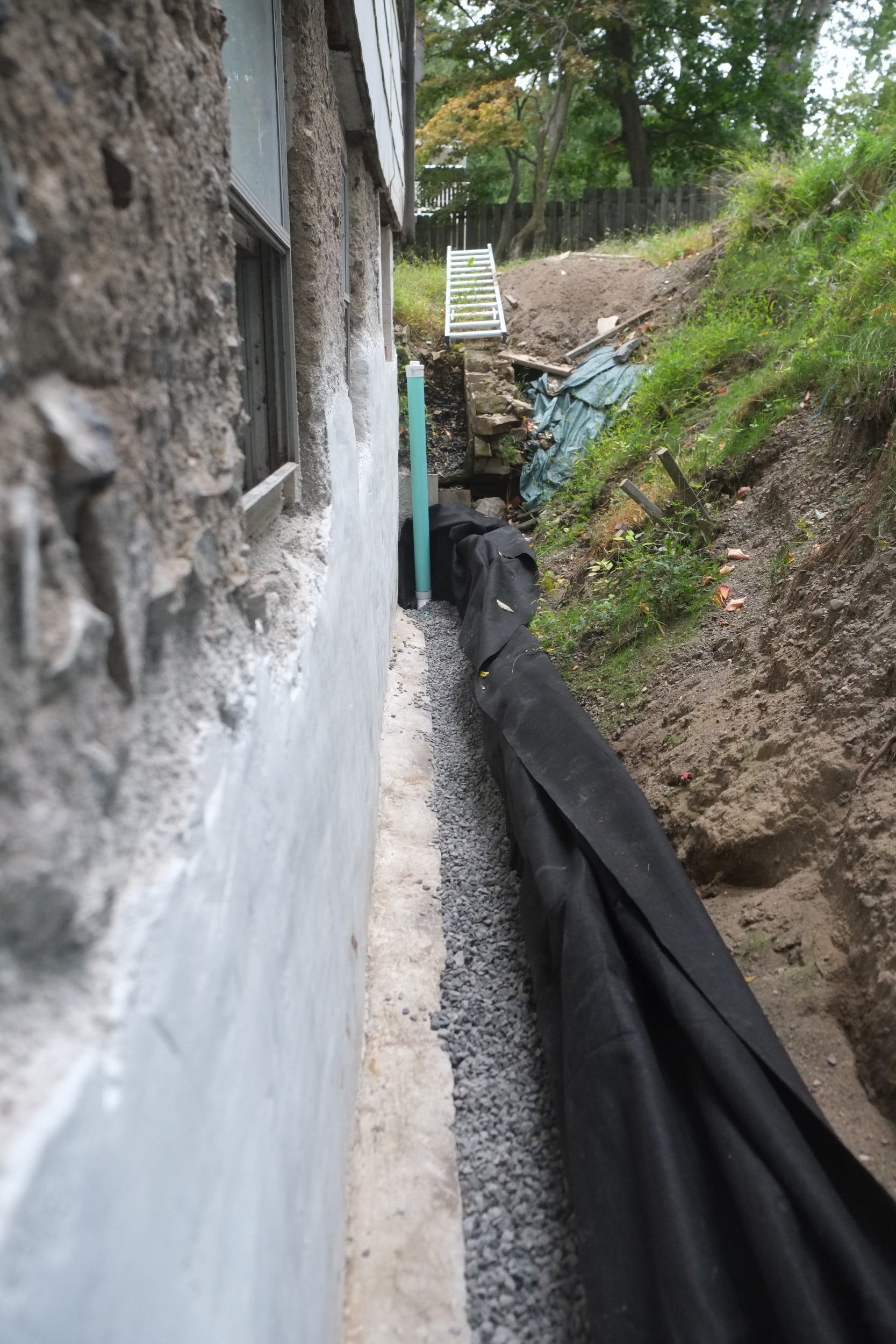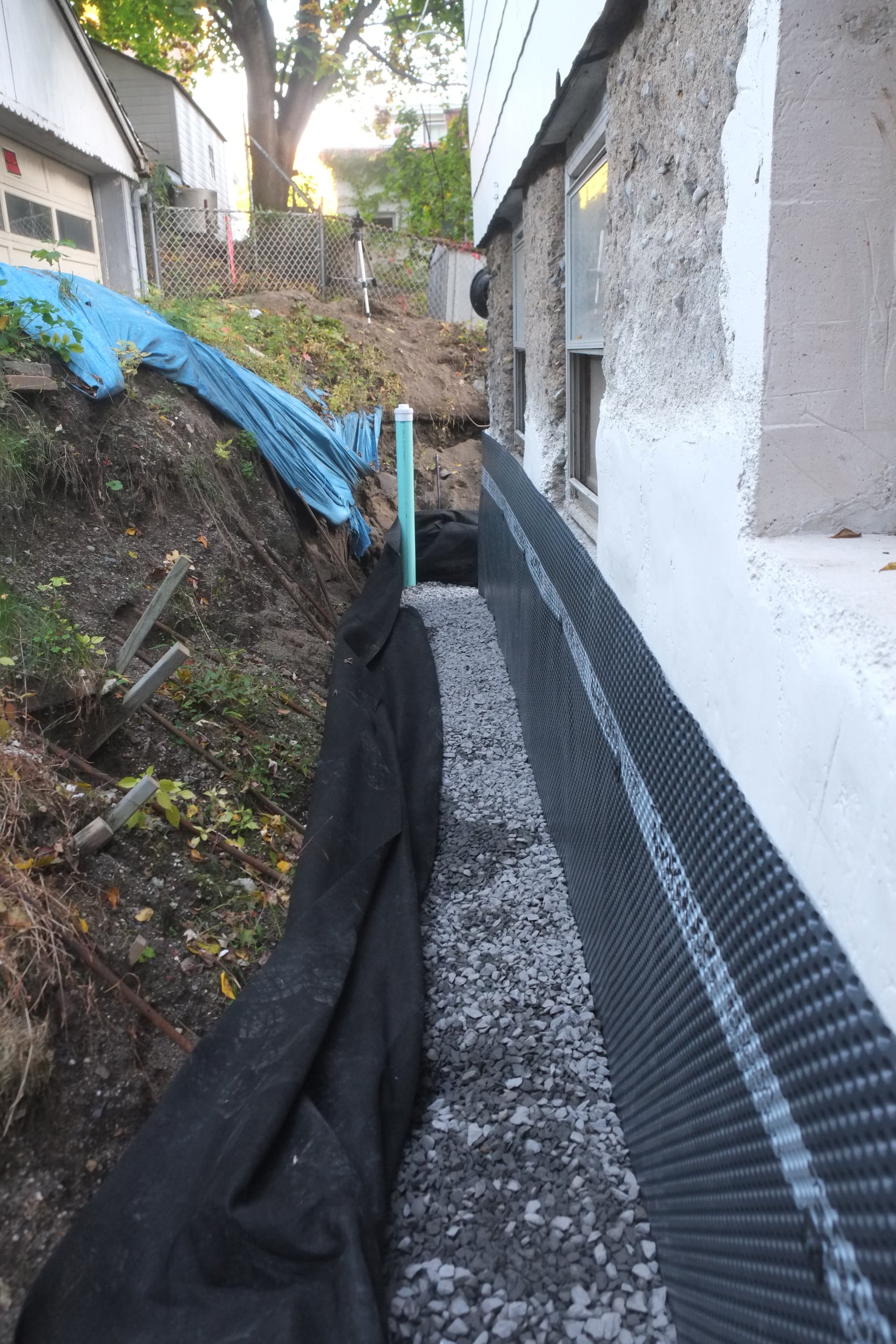 Part 2. Fixing more trench collapses, installing dimple board, geo-textile cloth, piping, gravel, caping strips and finally soil.