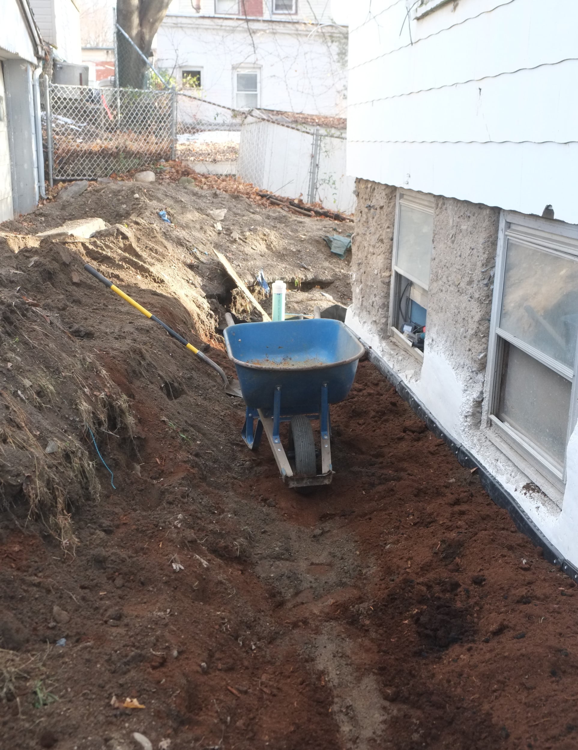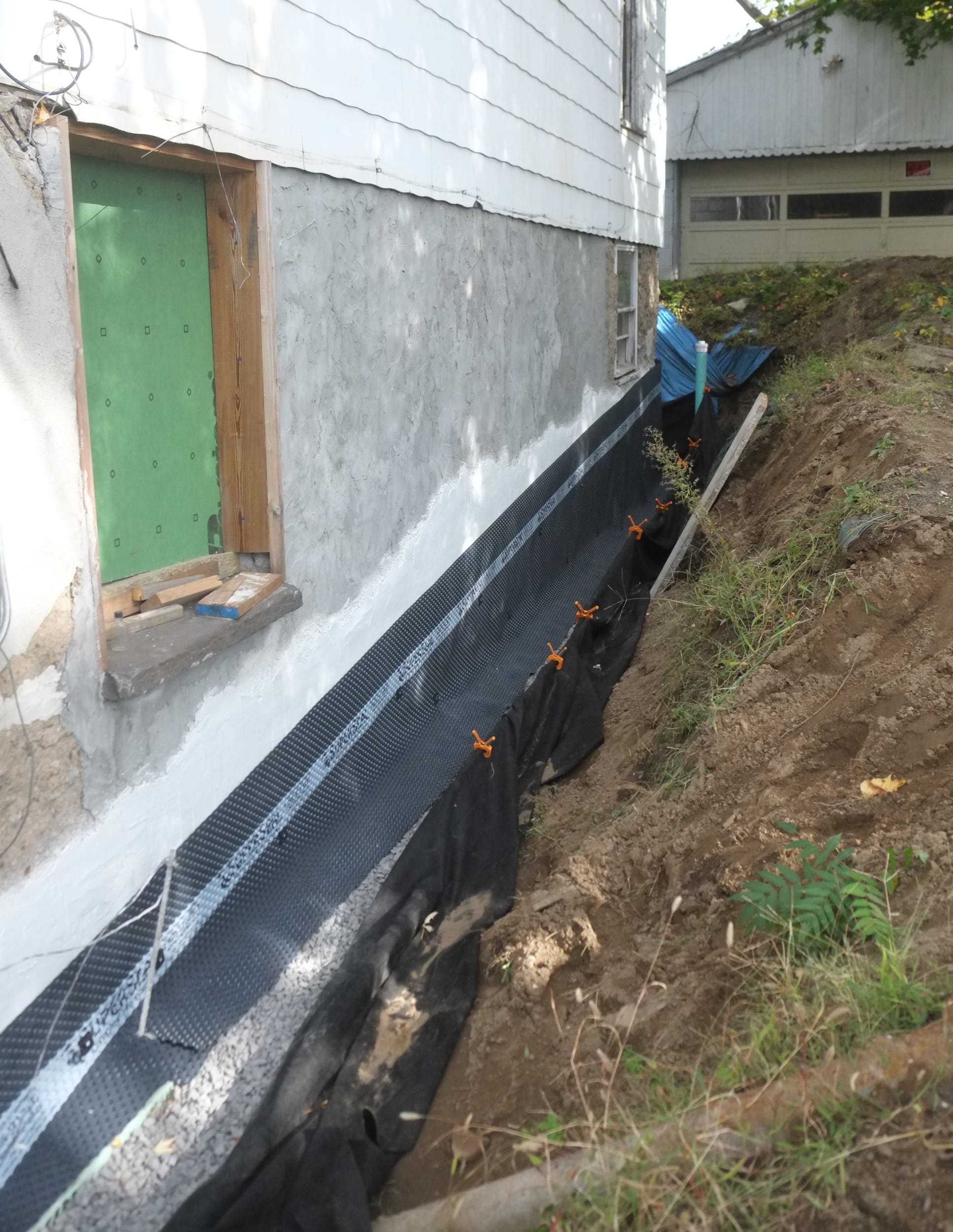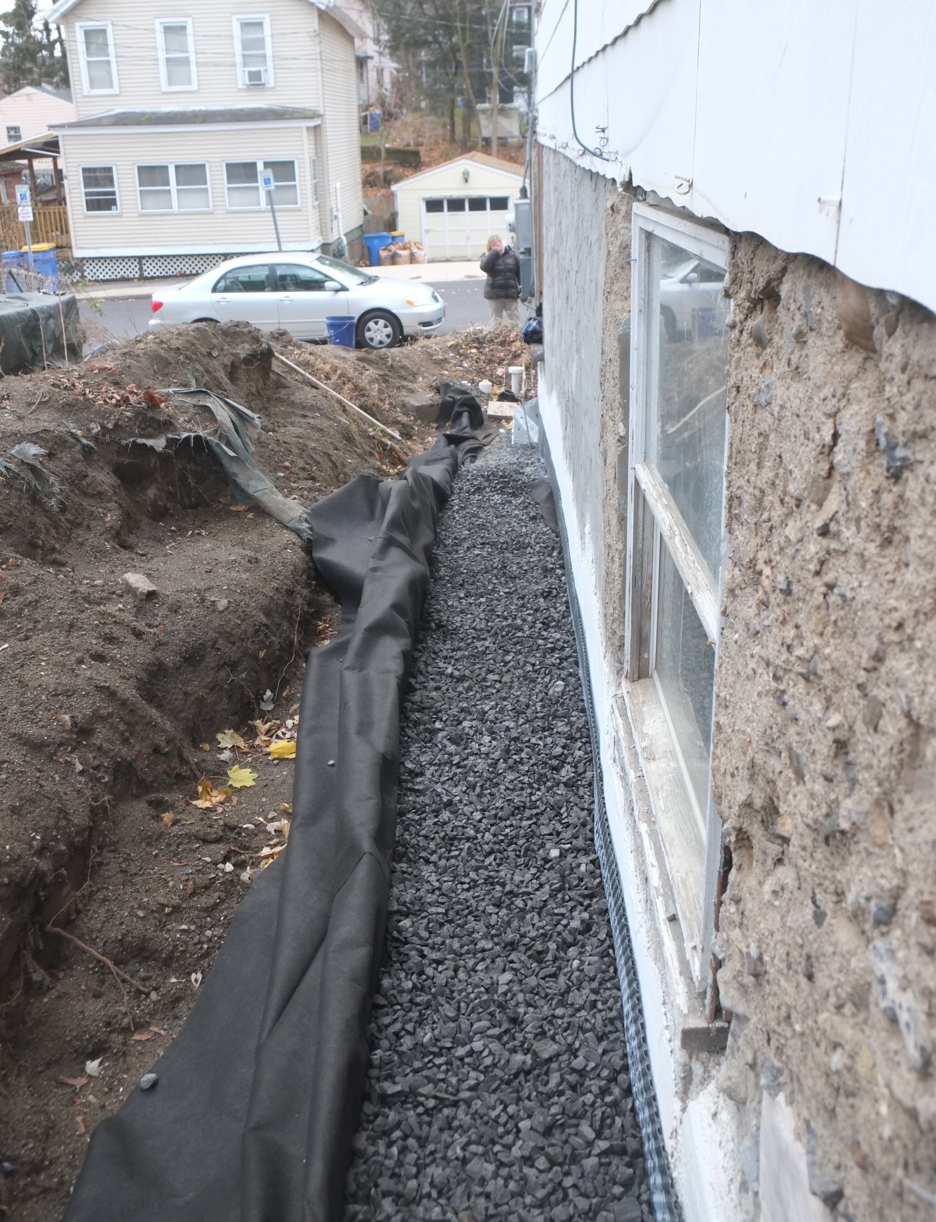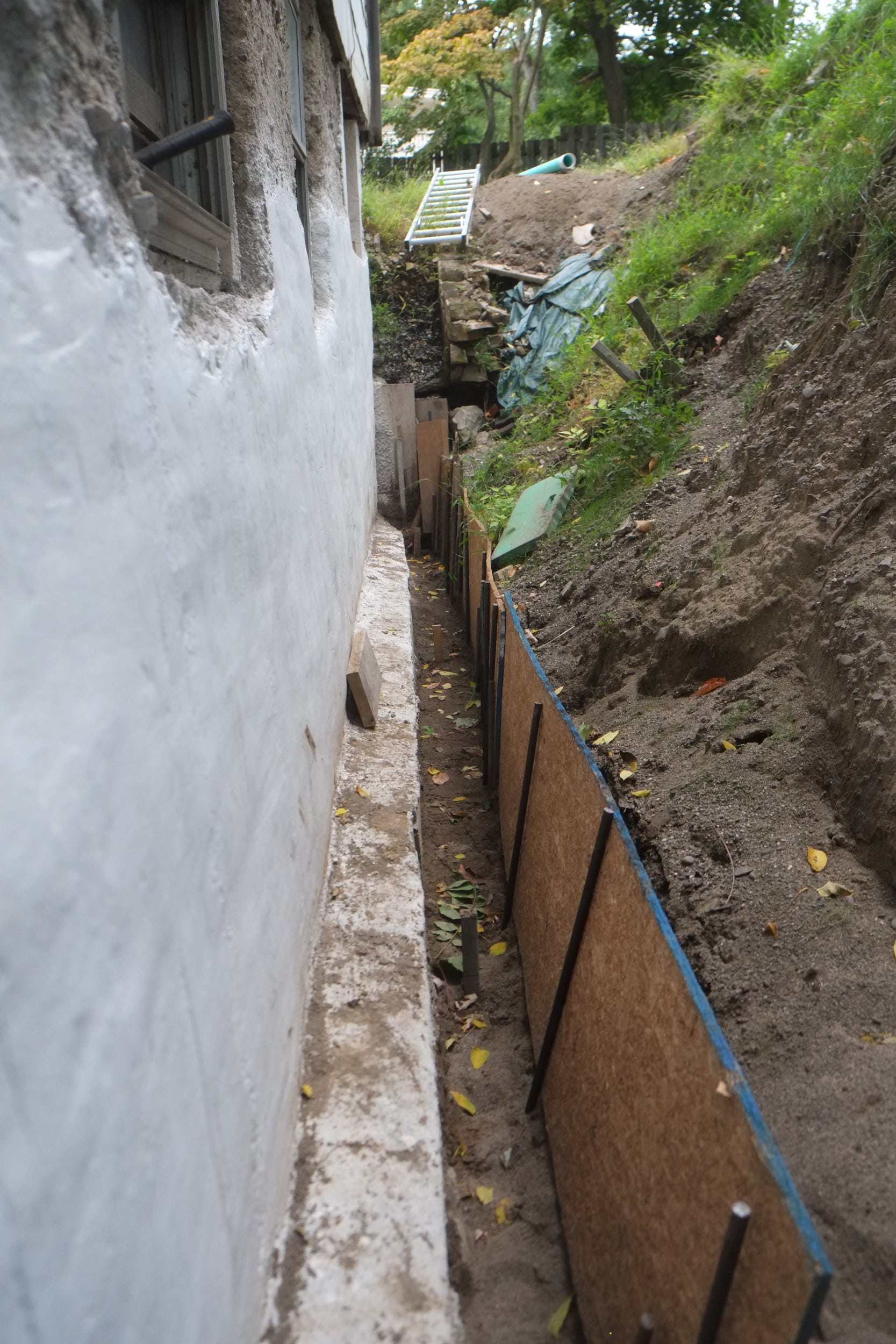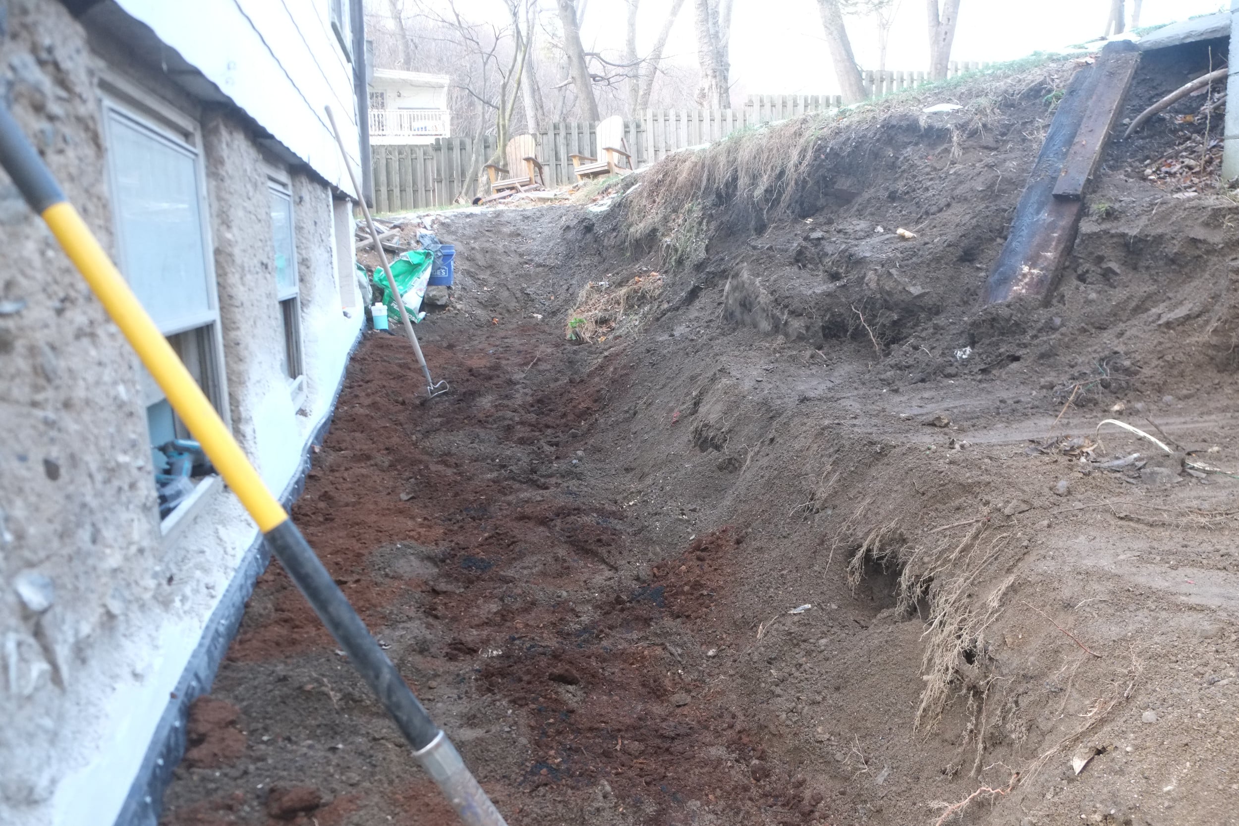Part 2. Fixing more trench collapses, installing dimple board, geo-textile cloth, piping, gravel, caping strips and finally soil.