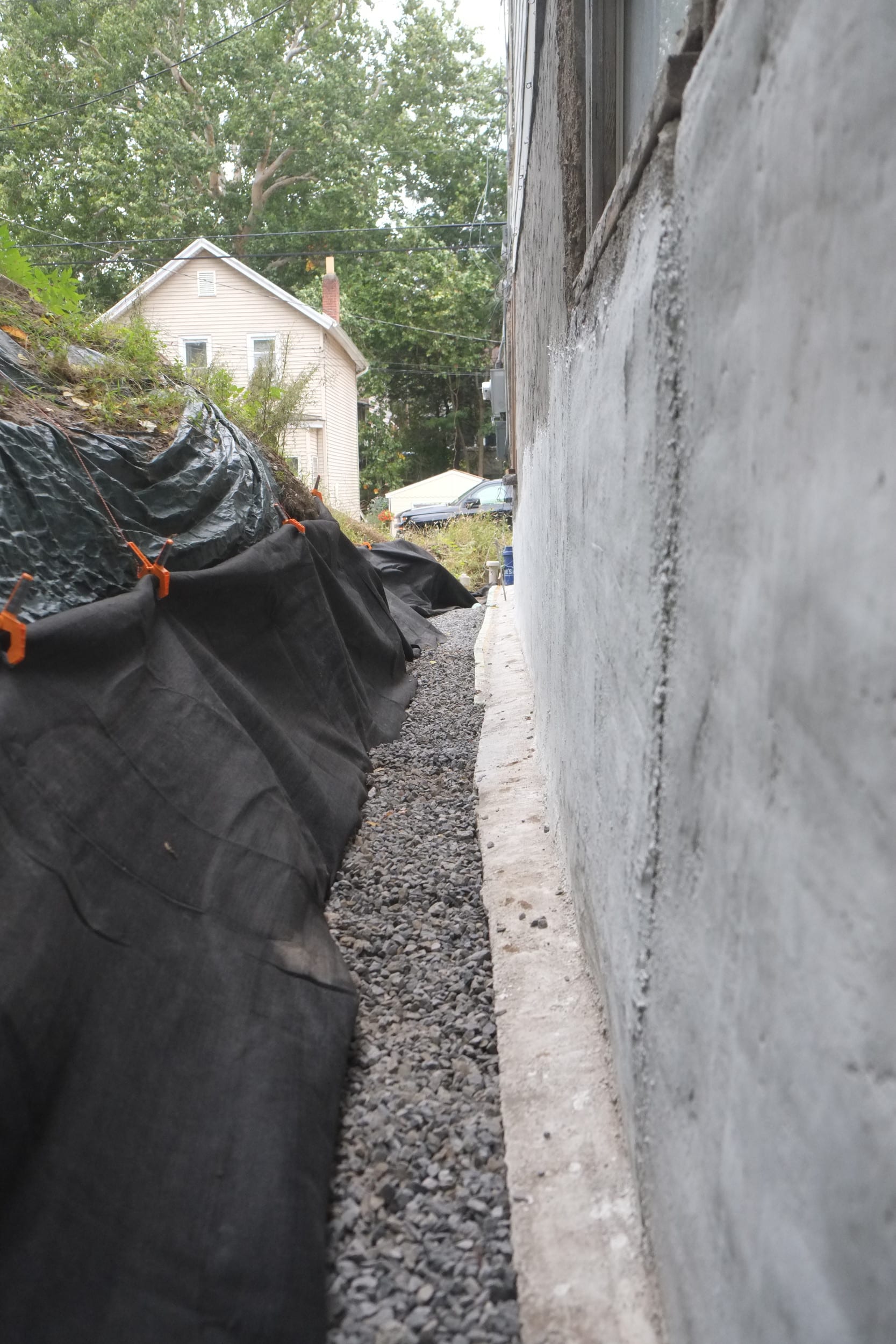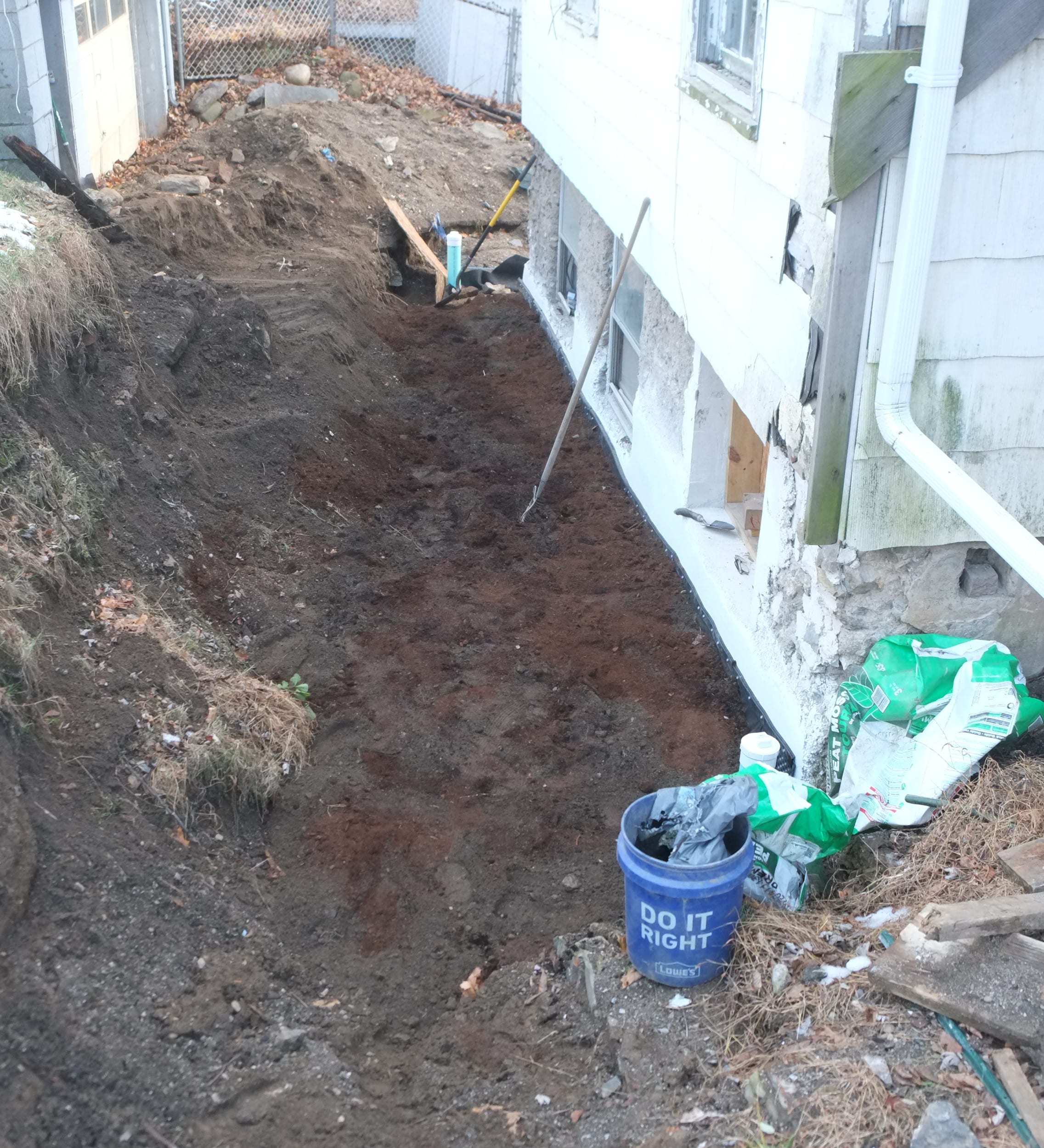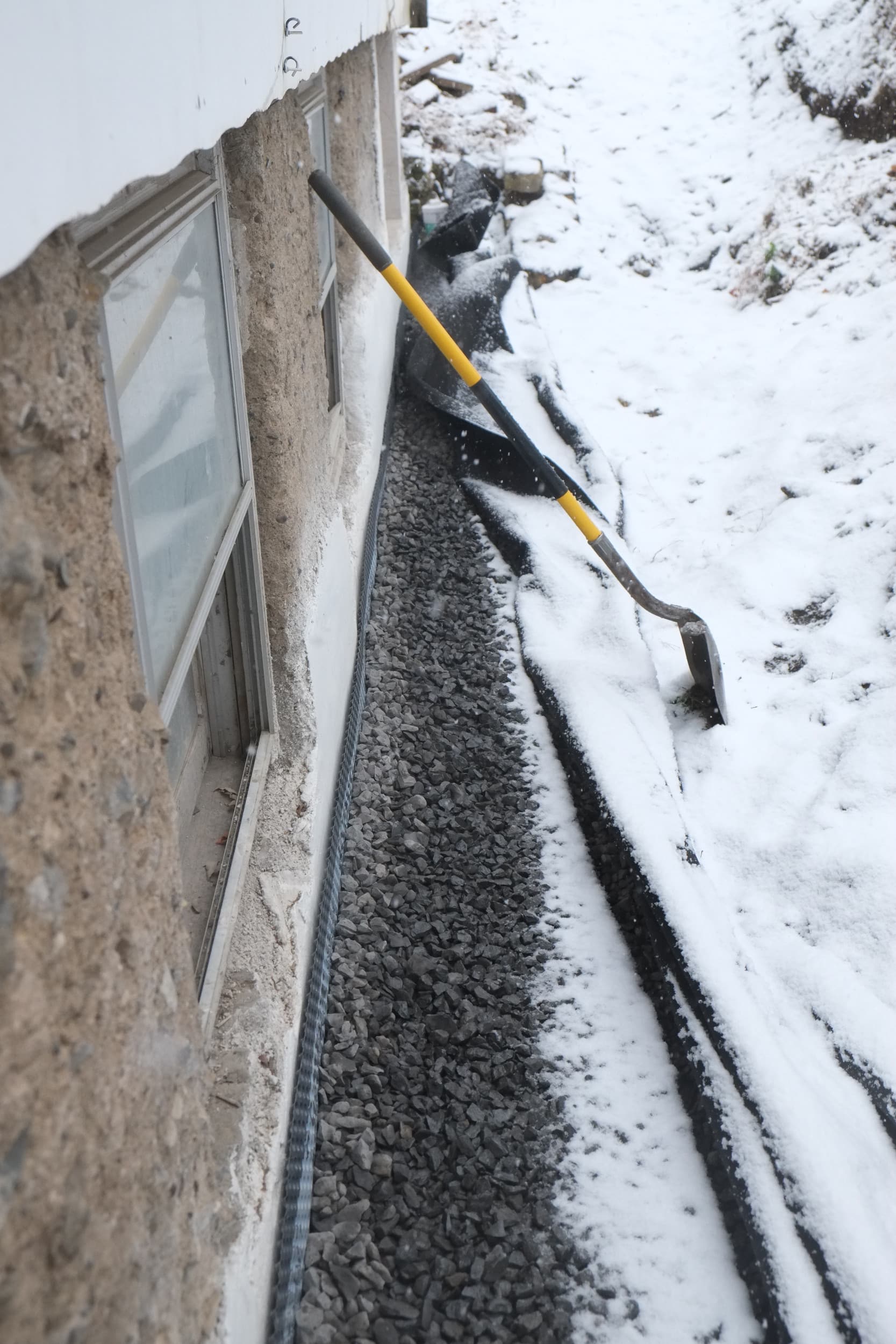 - Sloped top layer of gravel and added on top a thick plastic top layer to again divert water away from house