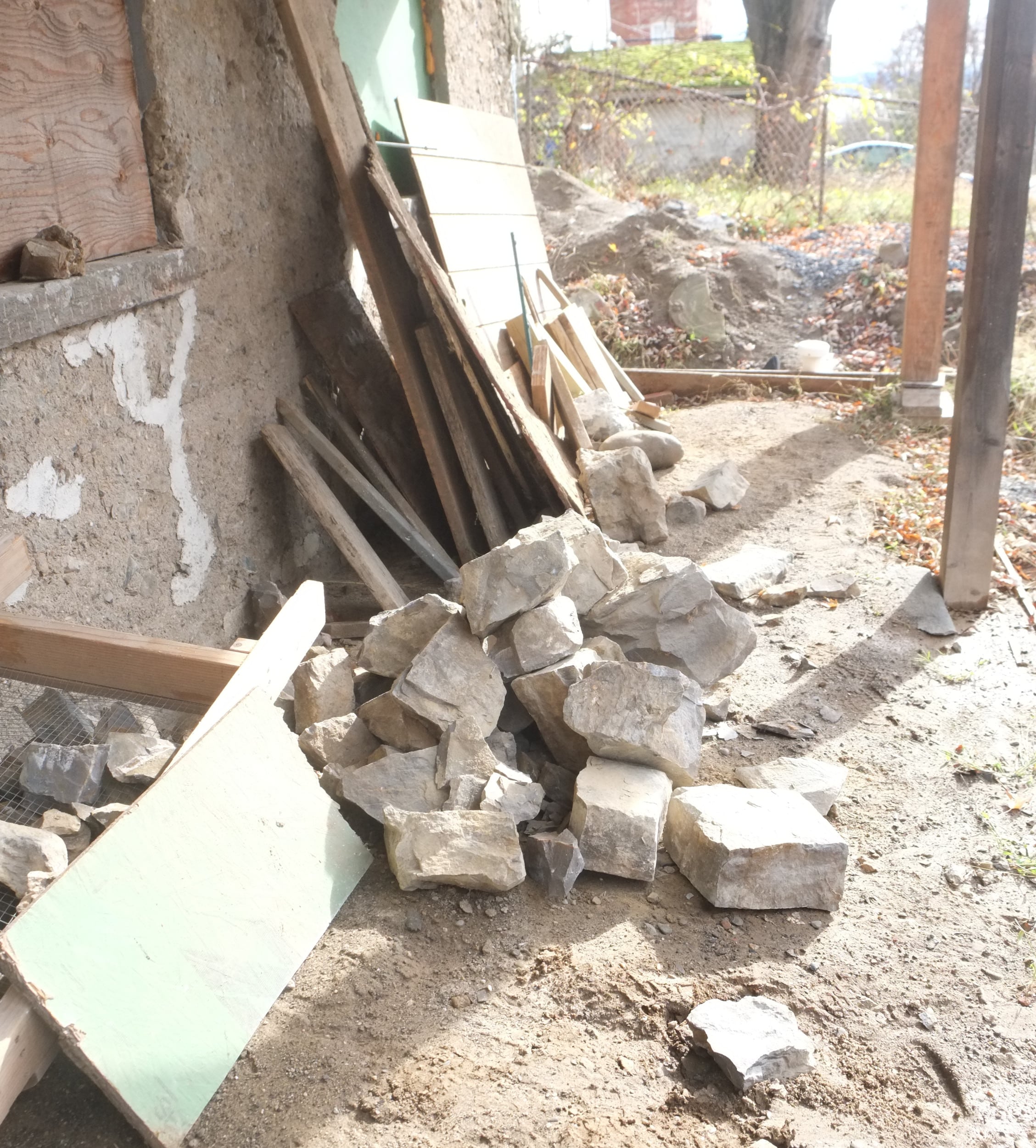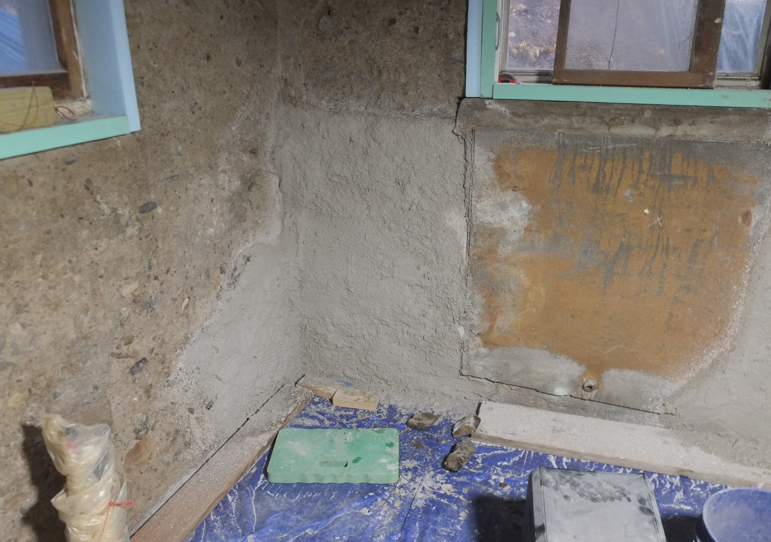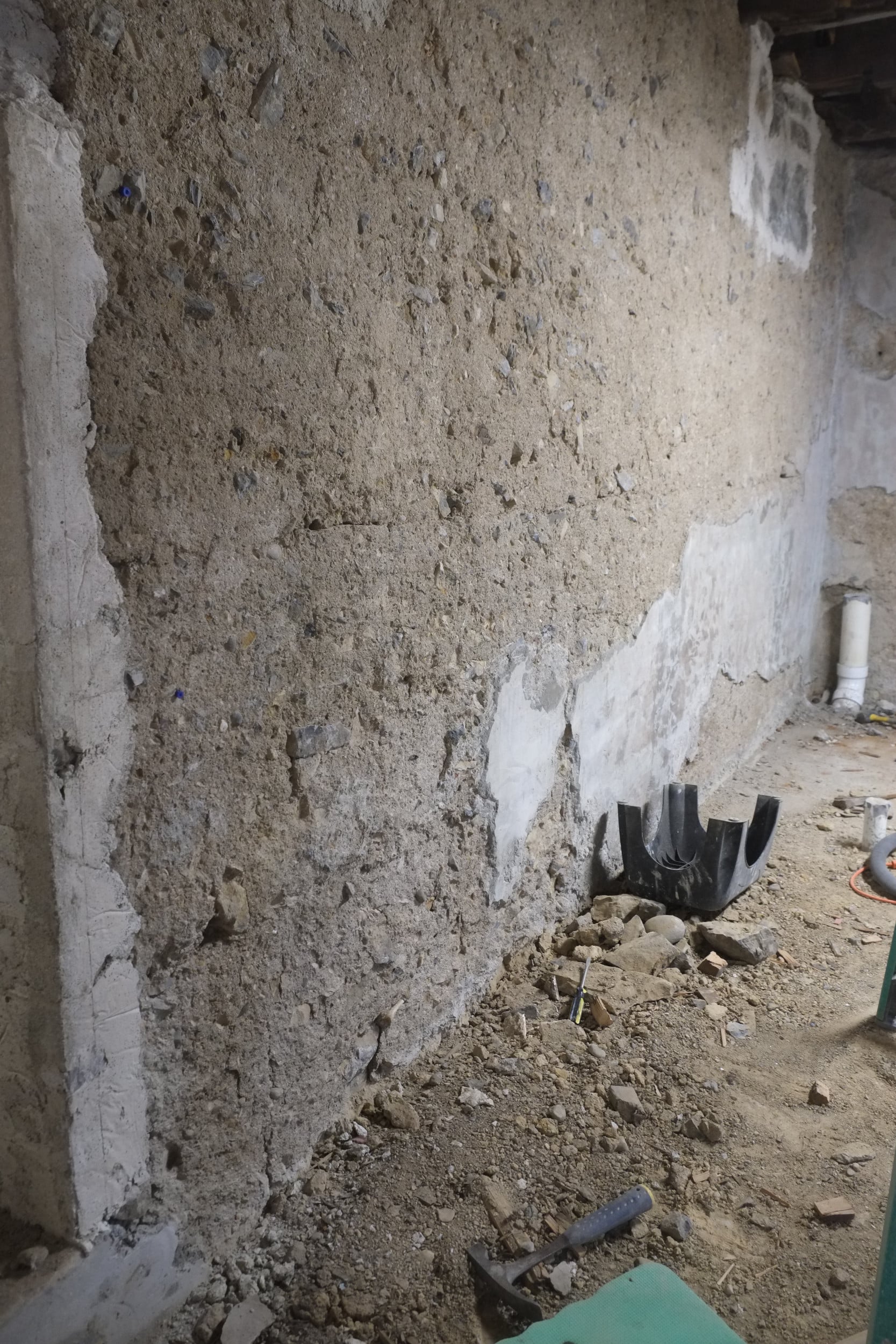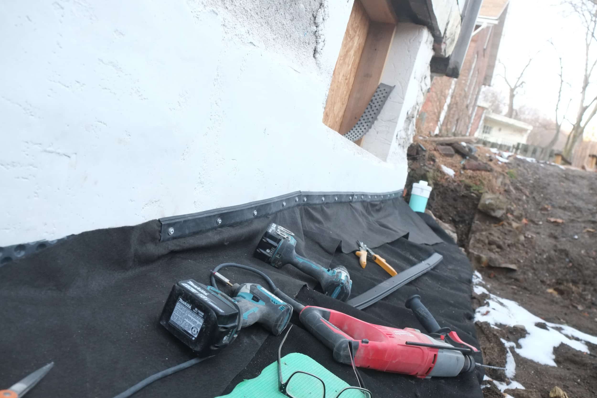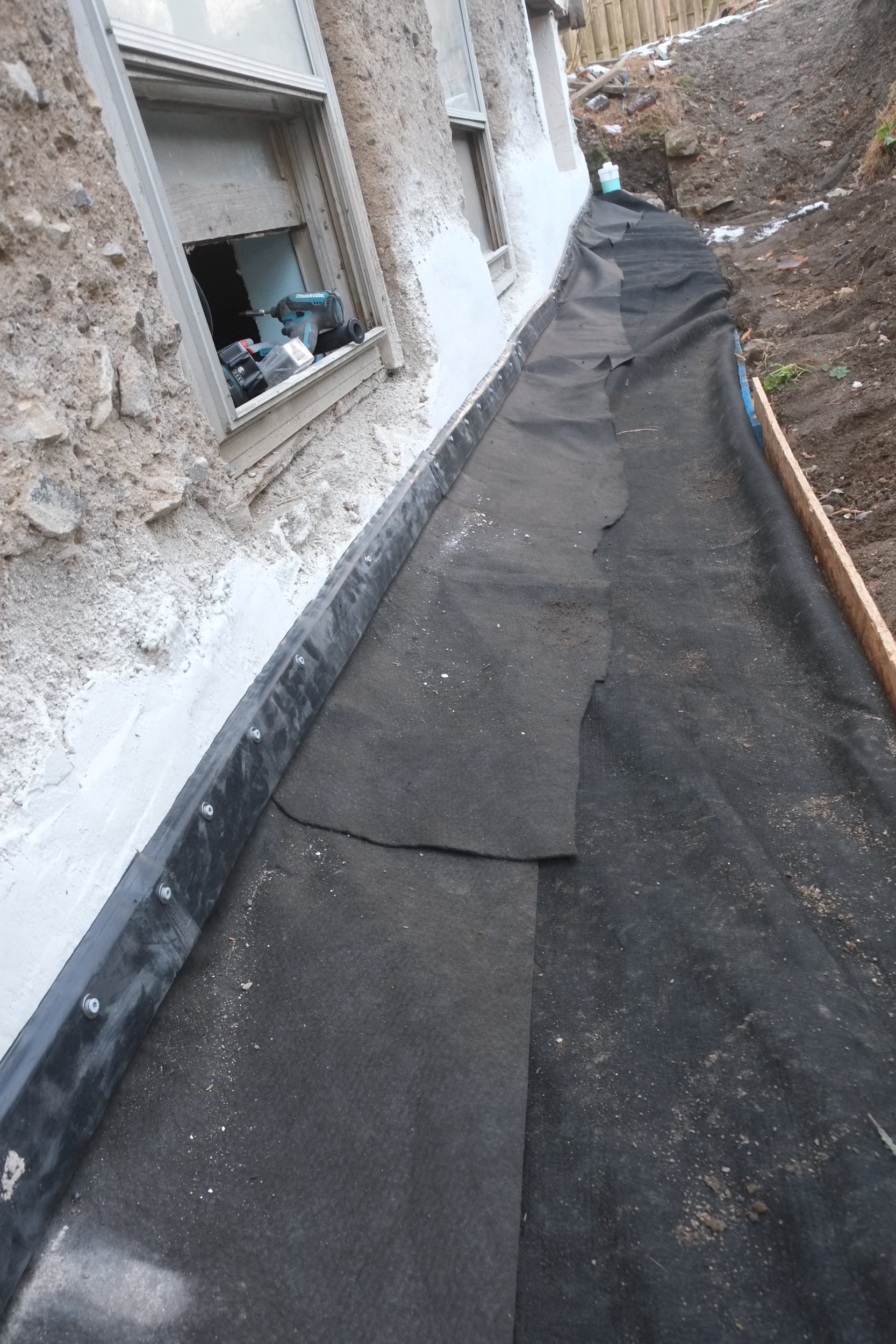 This weekend I added the capping strips to the dimple board, thanks again Andy from DIY Basement Solutions for your kind donation. These strips help seal the top of the dimple board to the wall. I used the white Tapcon screws with stainless steel washers to attach the caps. I will have to tweak some of these as in places more lime plaster needs to be added, including the corner, but that can wait to spring. We also have some Stego mastic left over, so I may add a bead along the top. You’ll notice in the pictures that the capping strips hold in place an apron of the geo-textile fabric, this covers the edge of the wrapped around fabric to fully encapsulate the gravel.