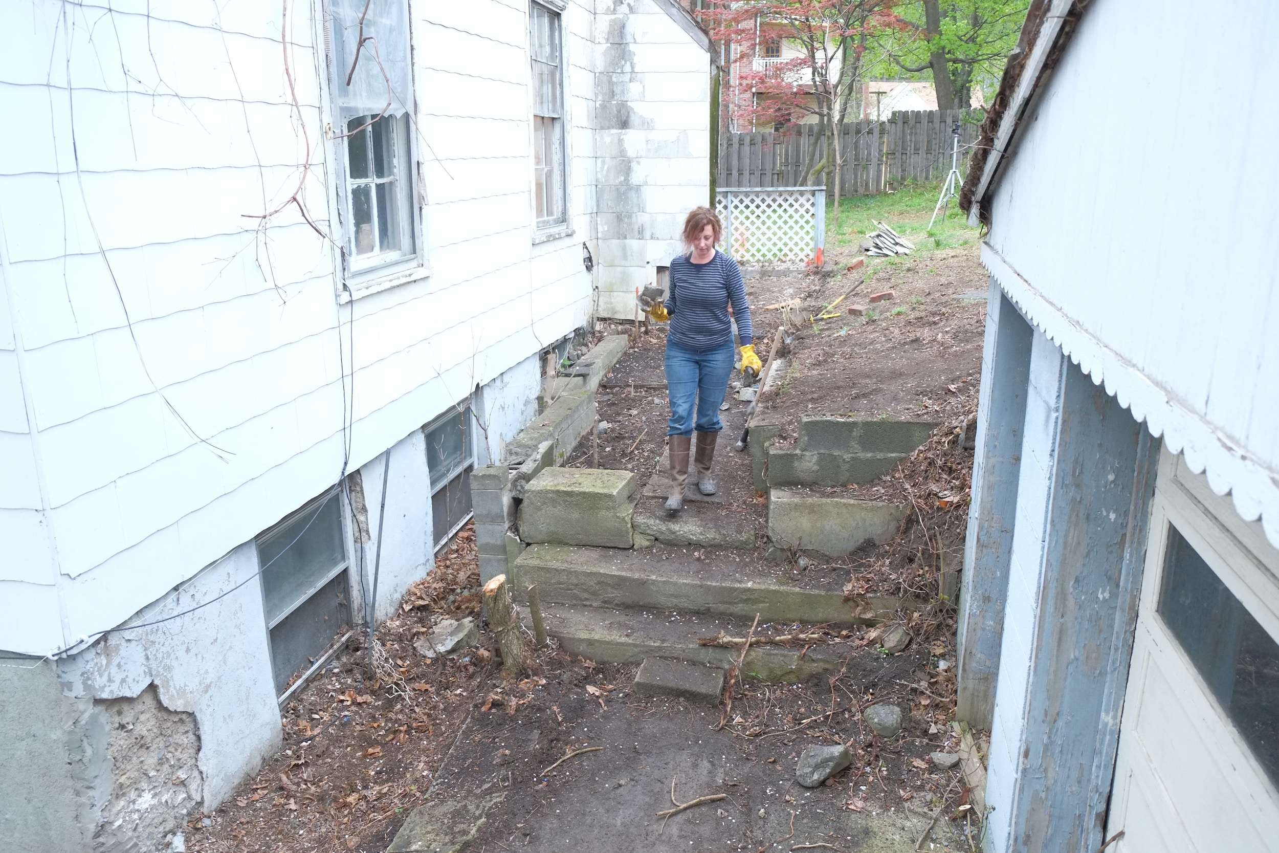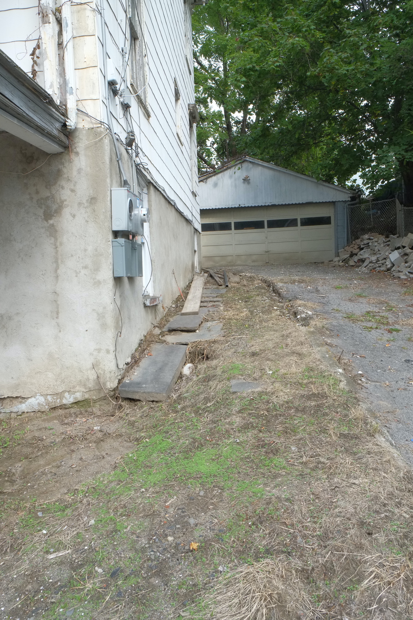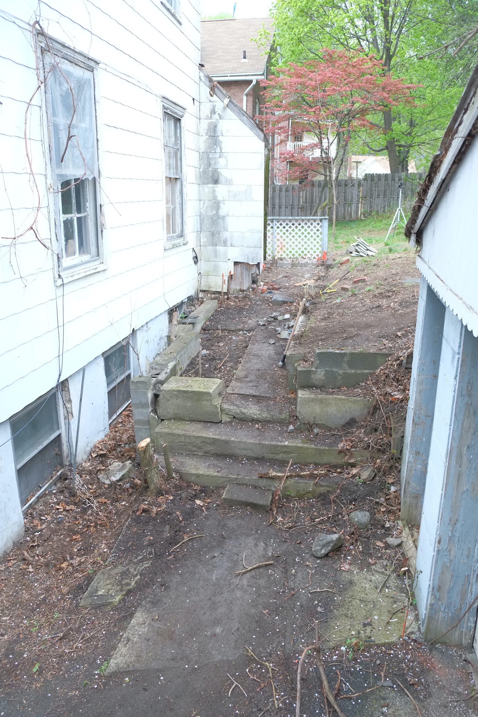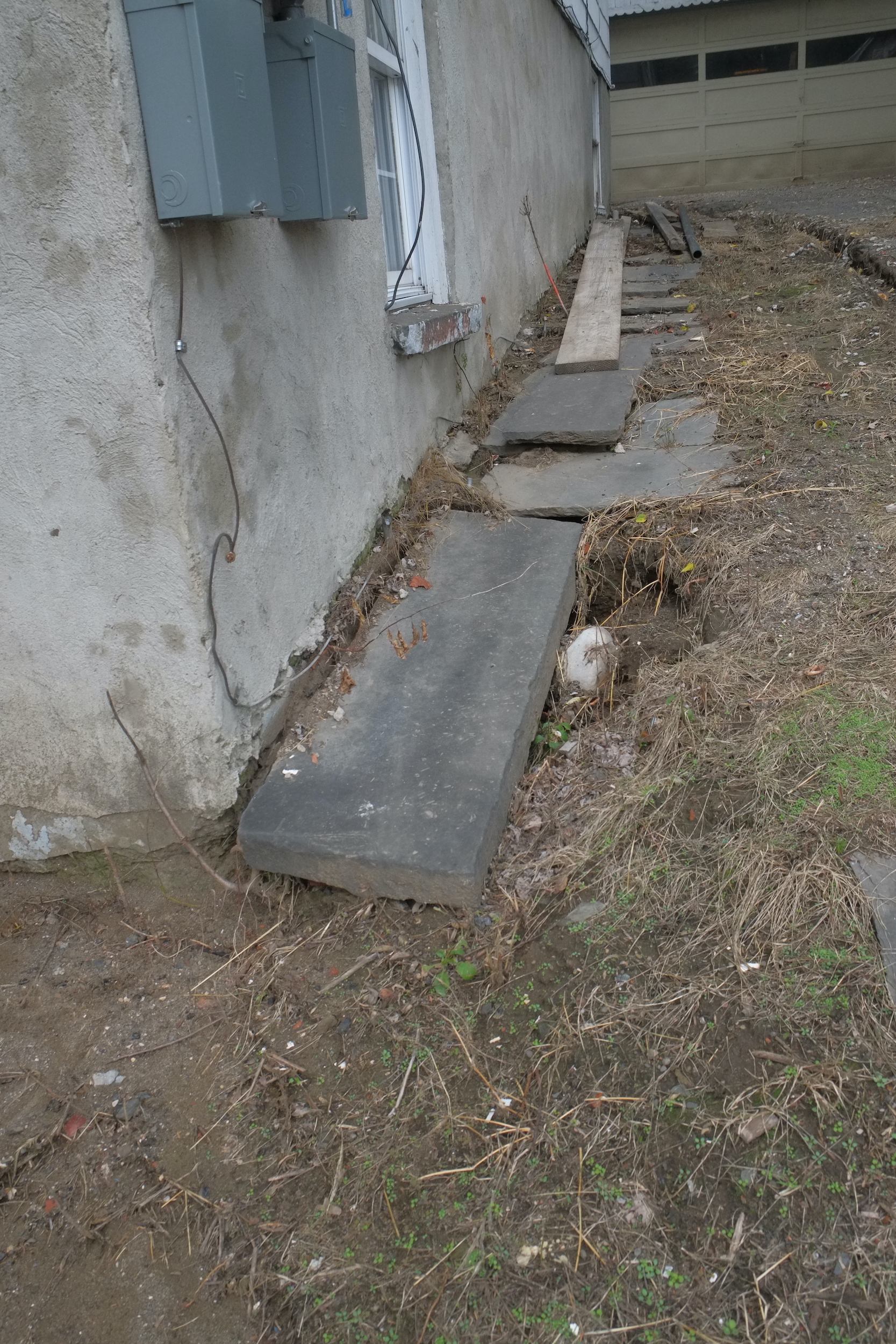 We want one access route to the house that is step free and this route will be up the drive and around the back of the house. In the last photo the flat area to the right will be the start of our path. It will be about a foot higher than the ground outside our rear windows which we plan to plant plants that do well in the shade like ferns. The transition from this lower level to the path (12″ higher but increasing) will be via a rock garden as we have many huge stones laying around in the garden. This will be a fun project to work on and we’re both looking forward to.
