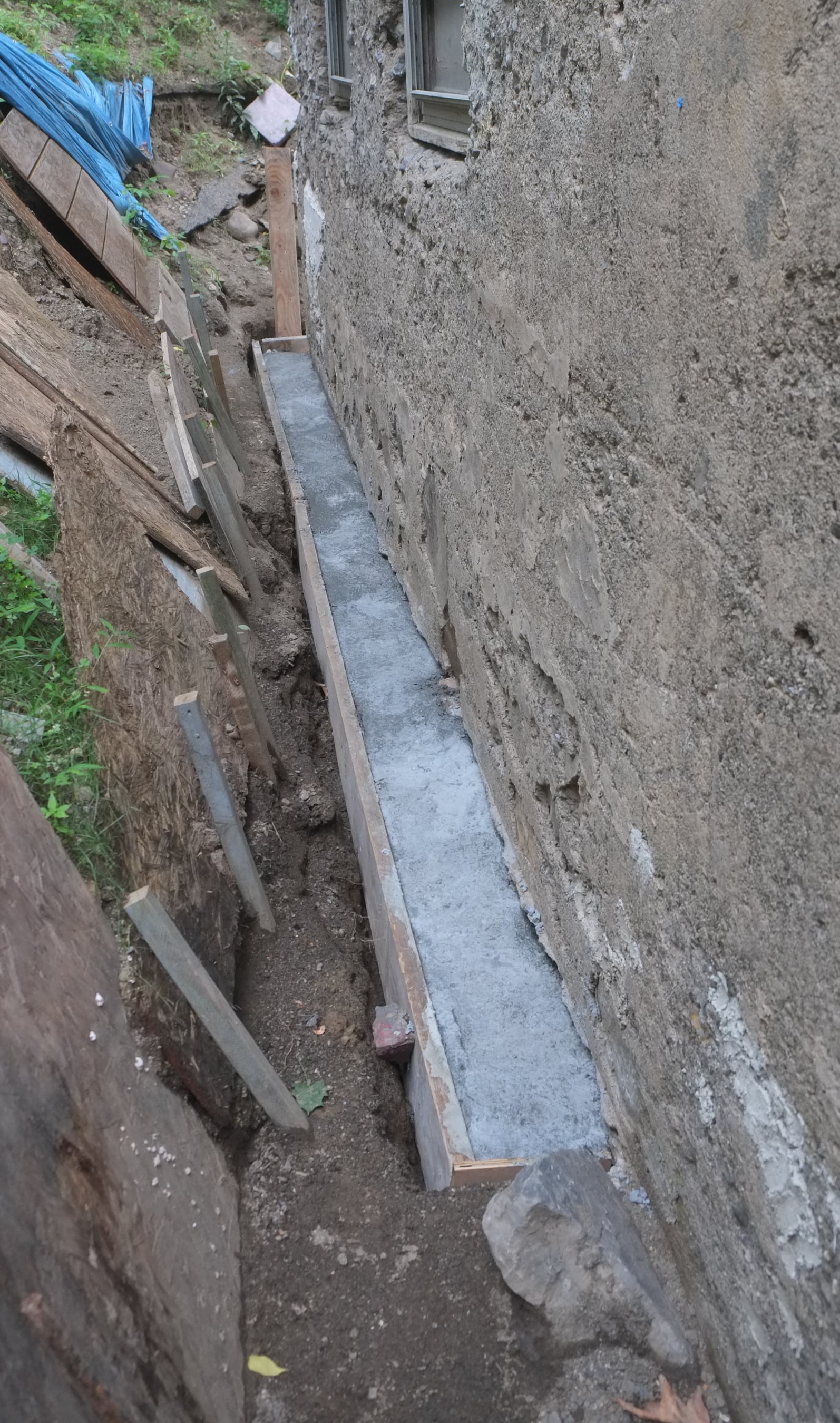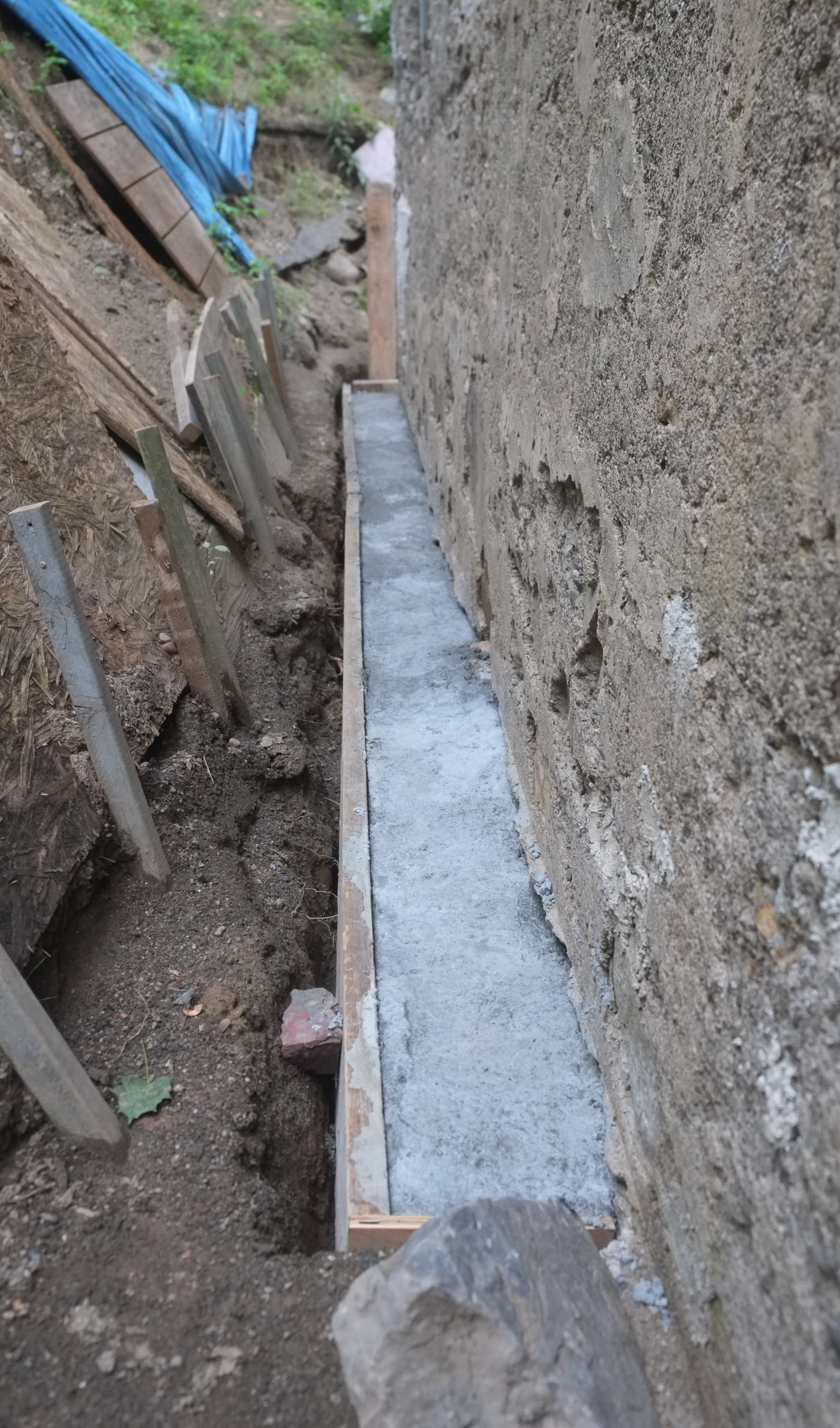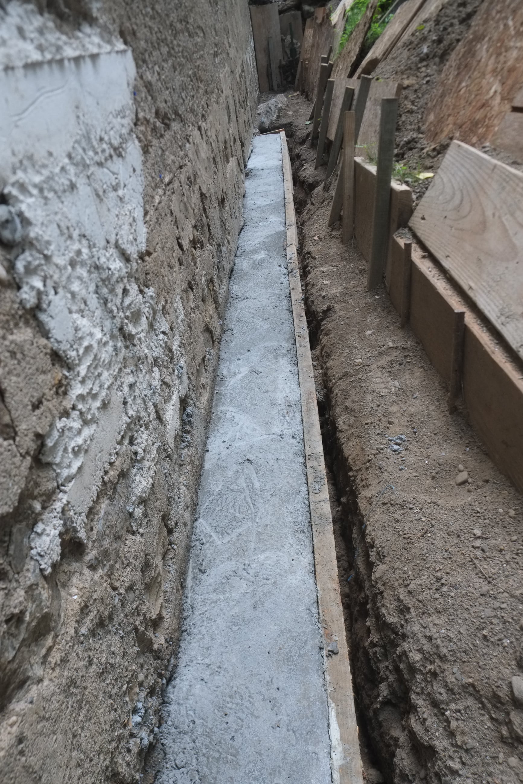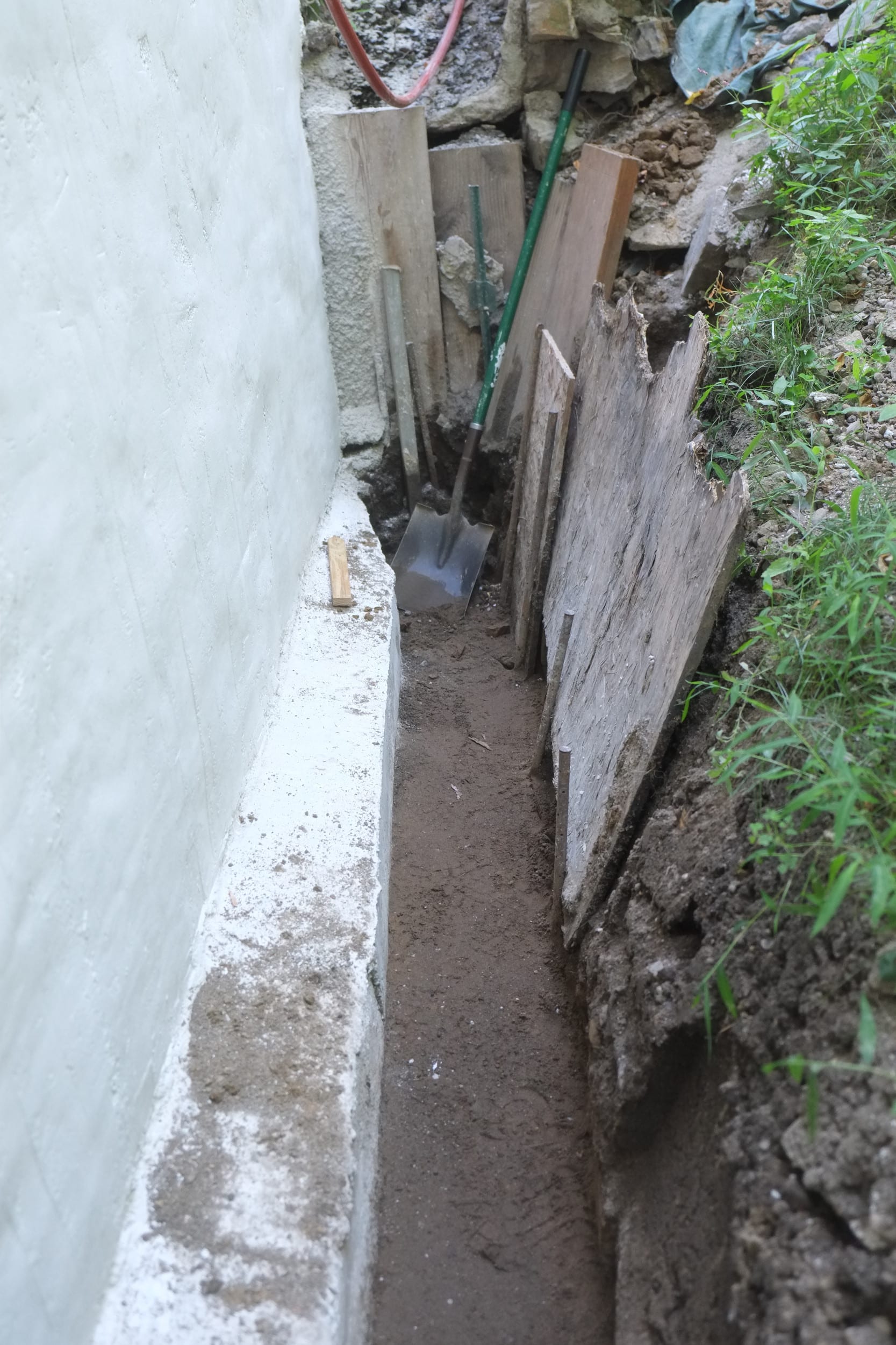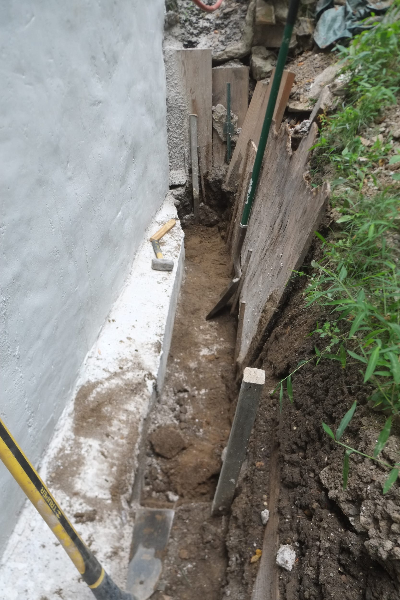 We’ve almost finished excavating the rear for our foundation drain. It did collapse in parts so I cleared that up and spent some money on some semi-decent shuttering to hold back the soil. We’re away at the moment but we couldn’t have started to fill the trench in anyway as the lime paster needs to cure for about a month.