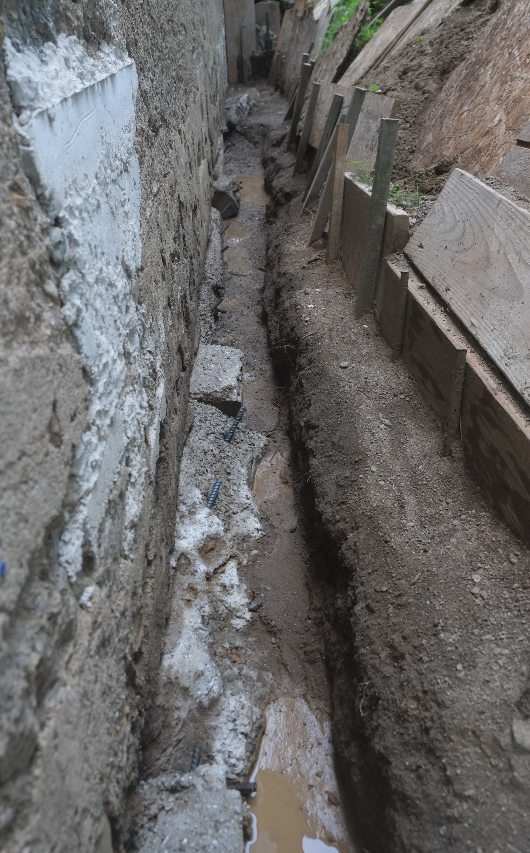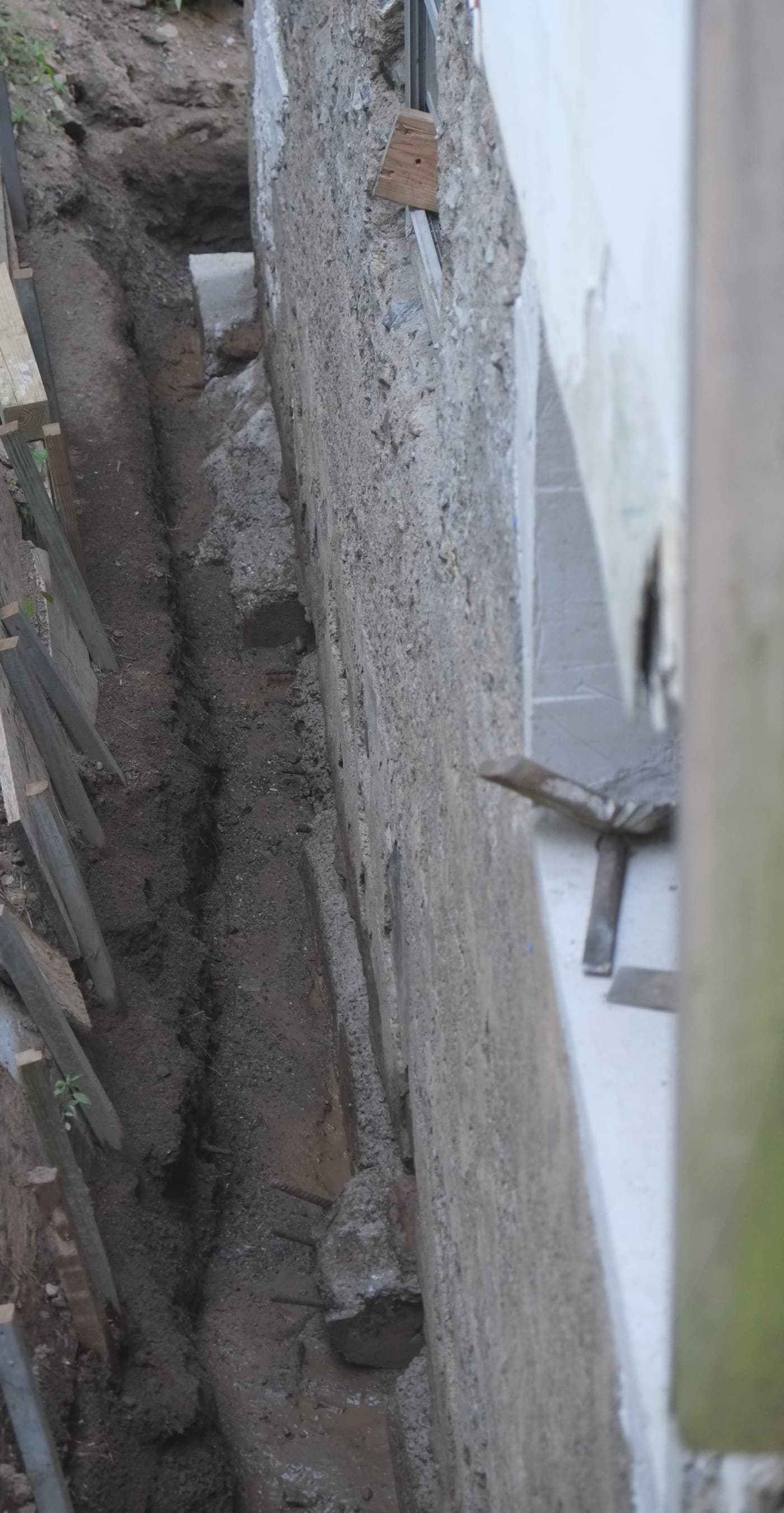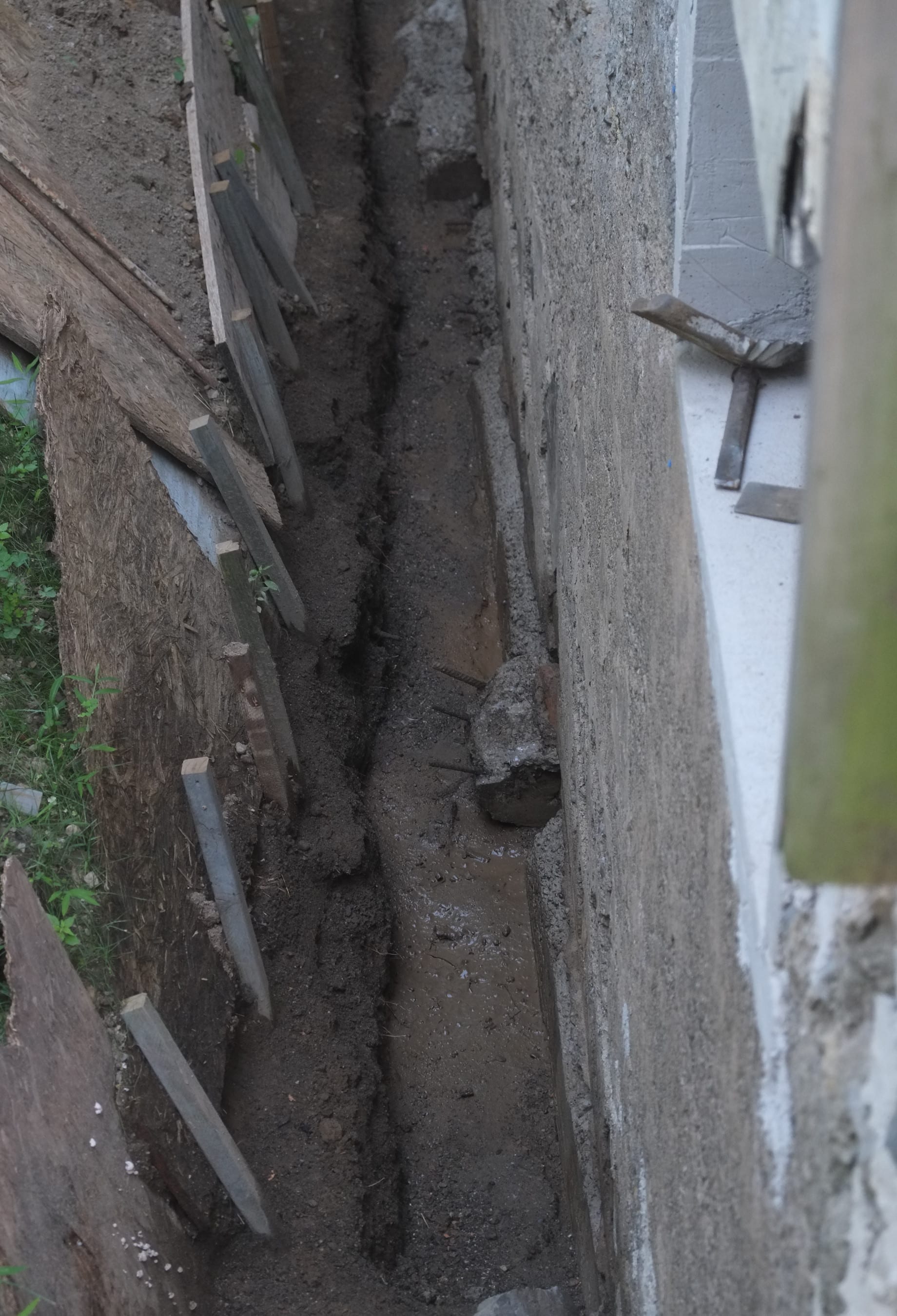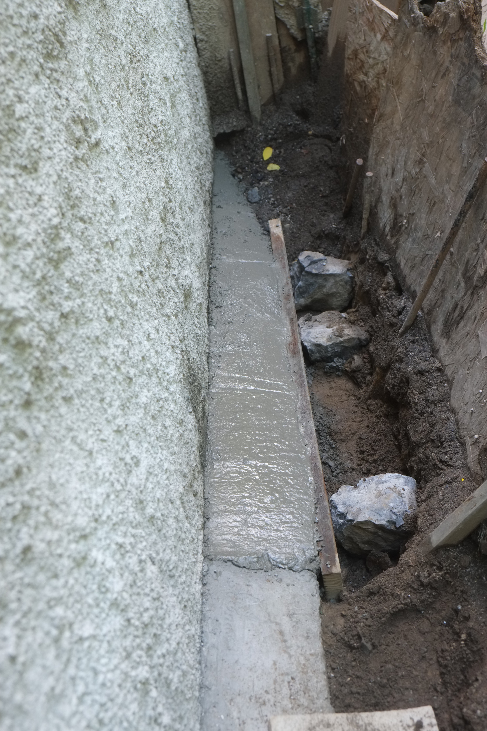We’ve almost finished excavating the rear for our foundation drain. It did collapse in parts so I cleared that up and spent some money on some semi-decent shuttering to hold back the soil. We’re away at the moment but we couldn’t have started to fill the trench in anyway as the lime paster needs to cure for about a month.