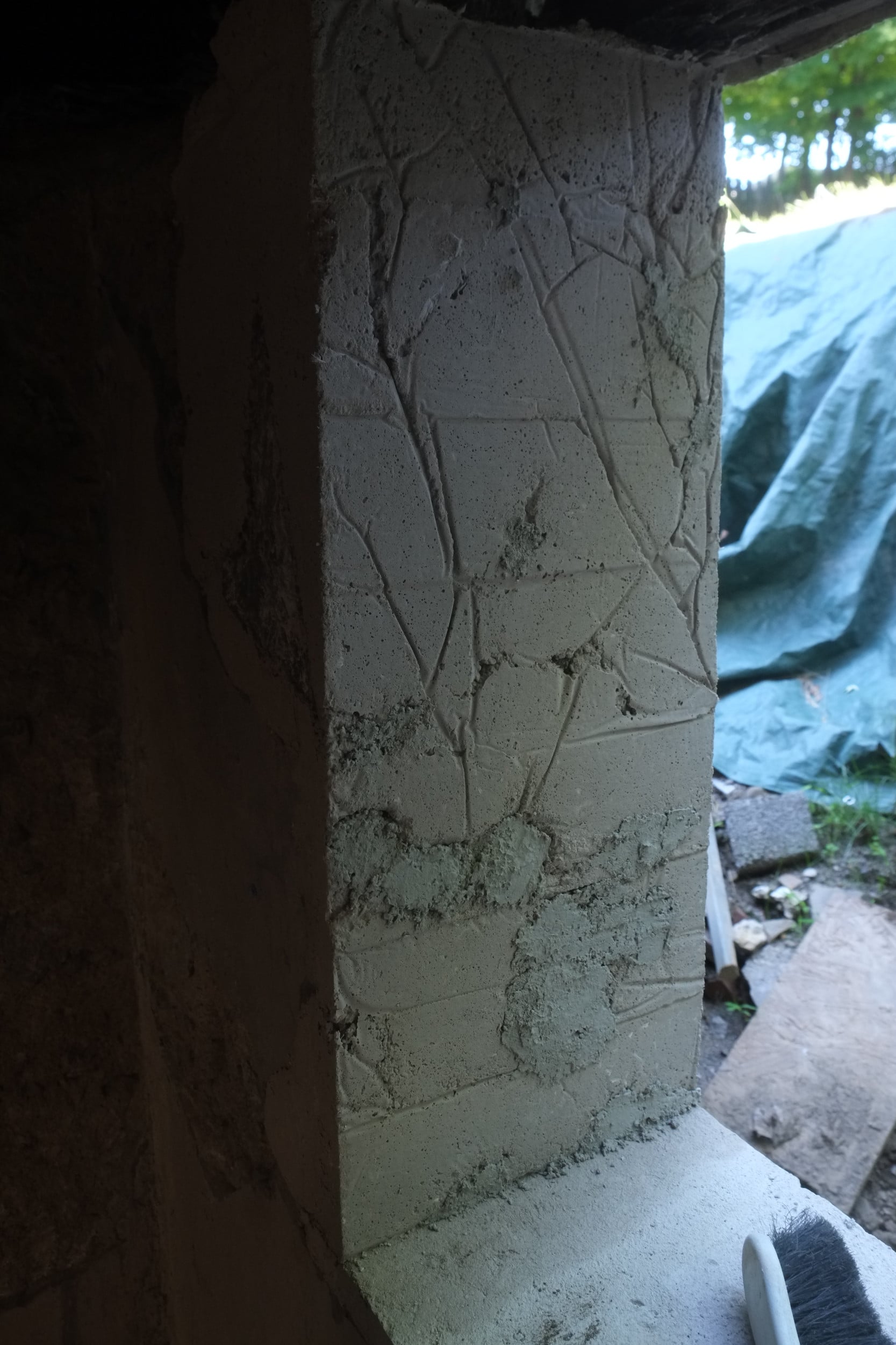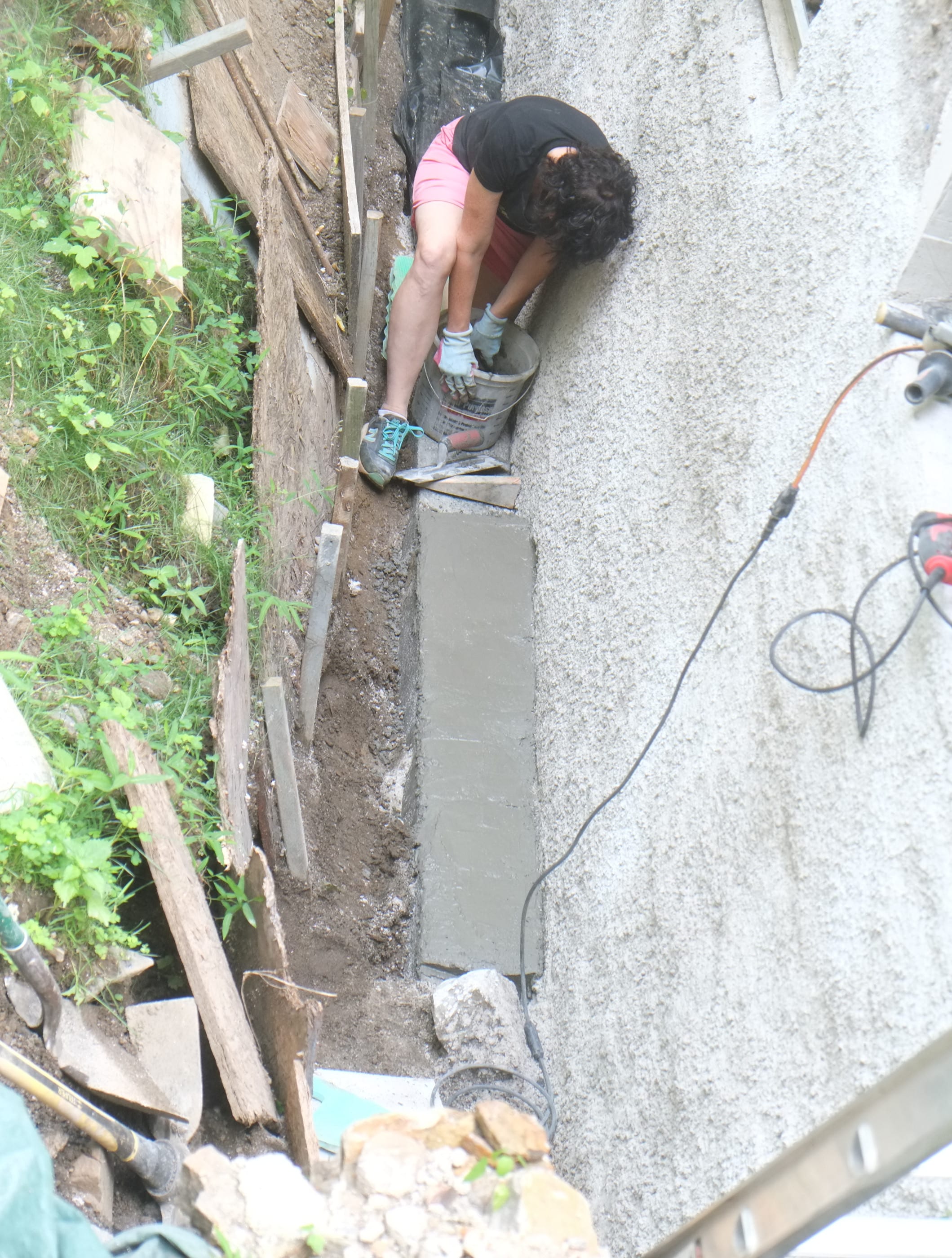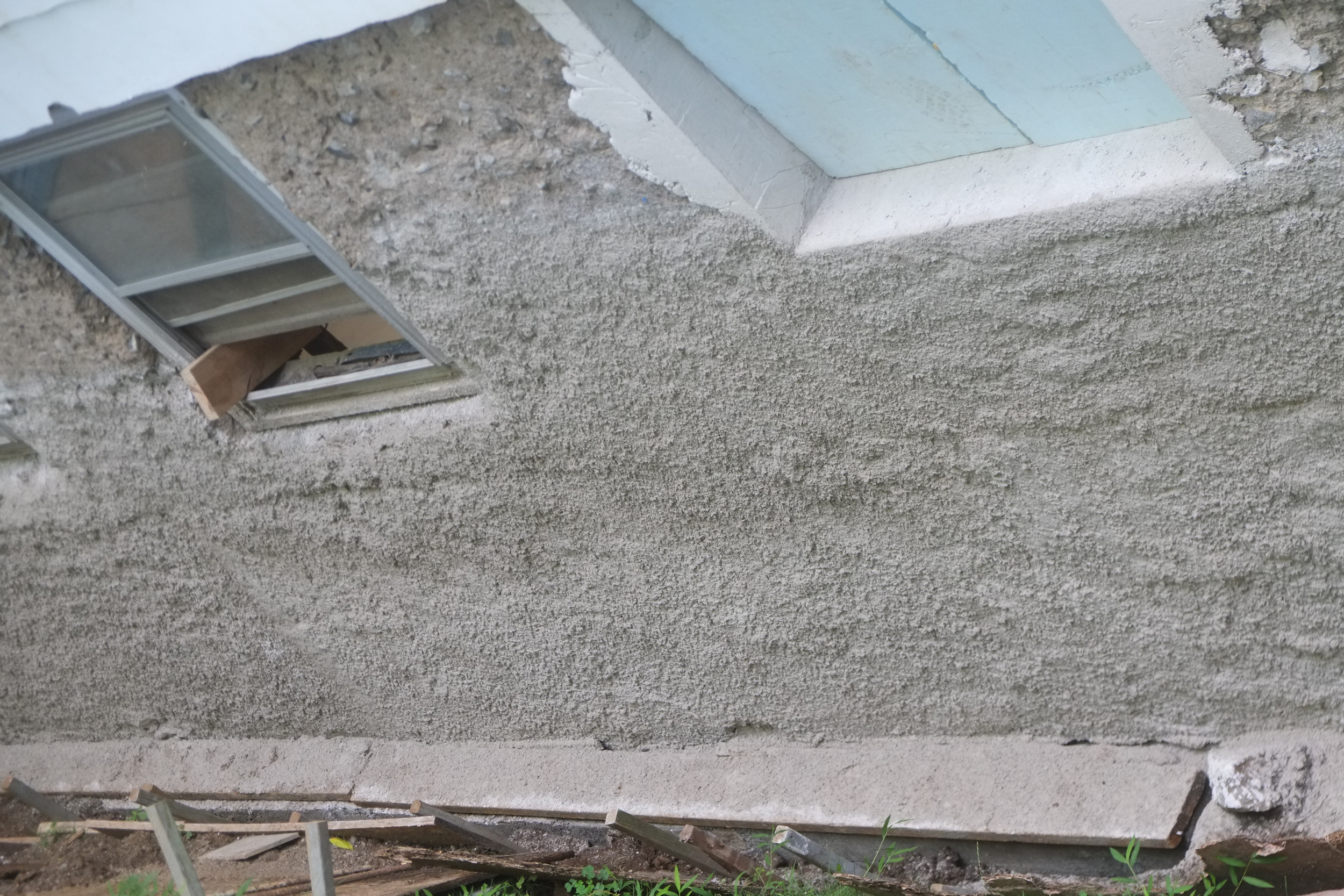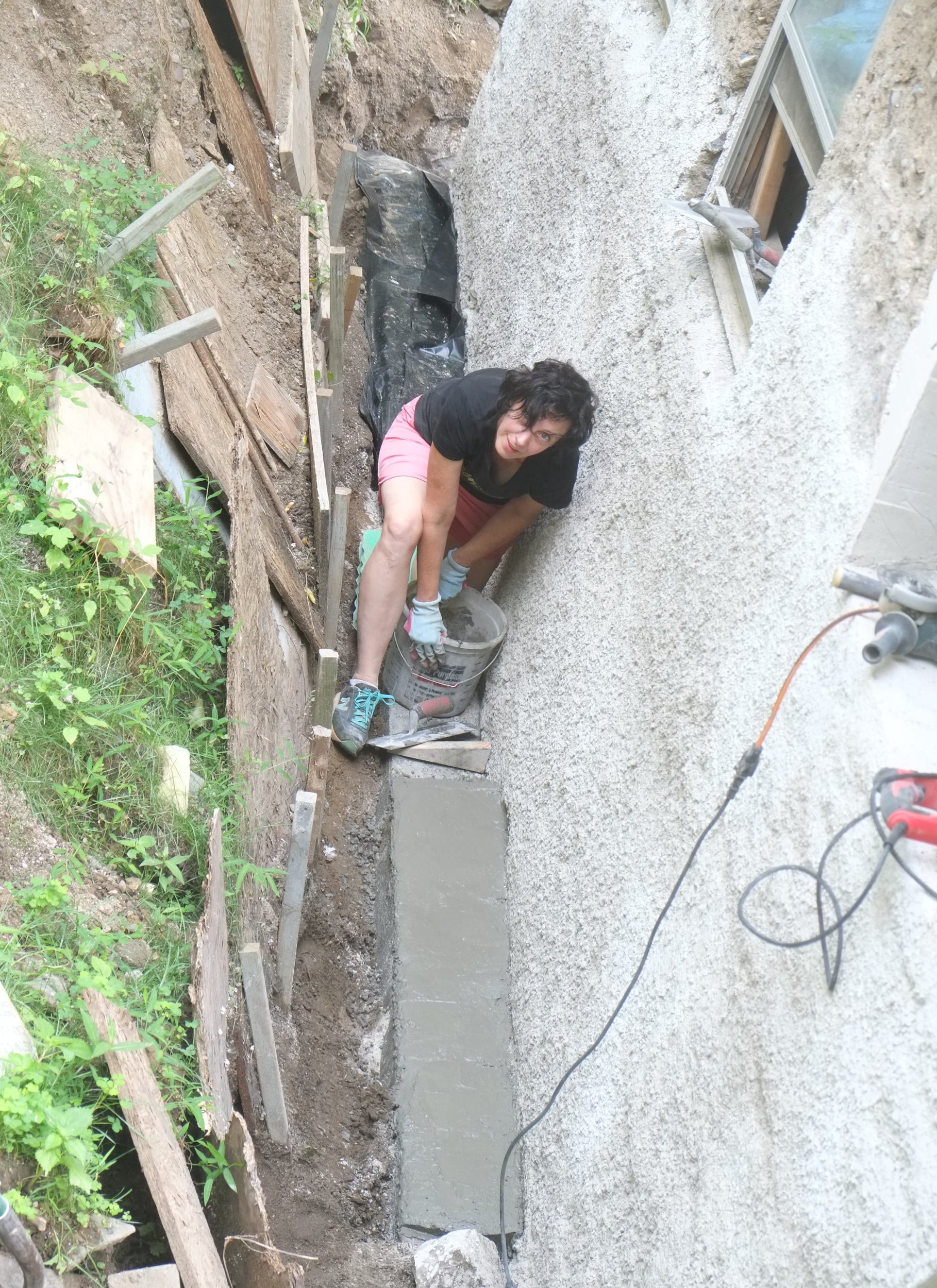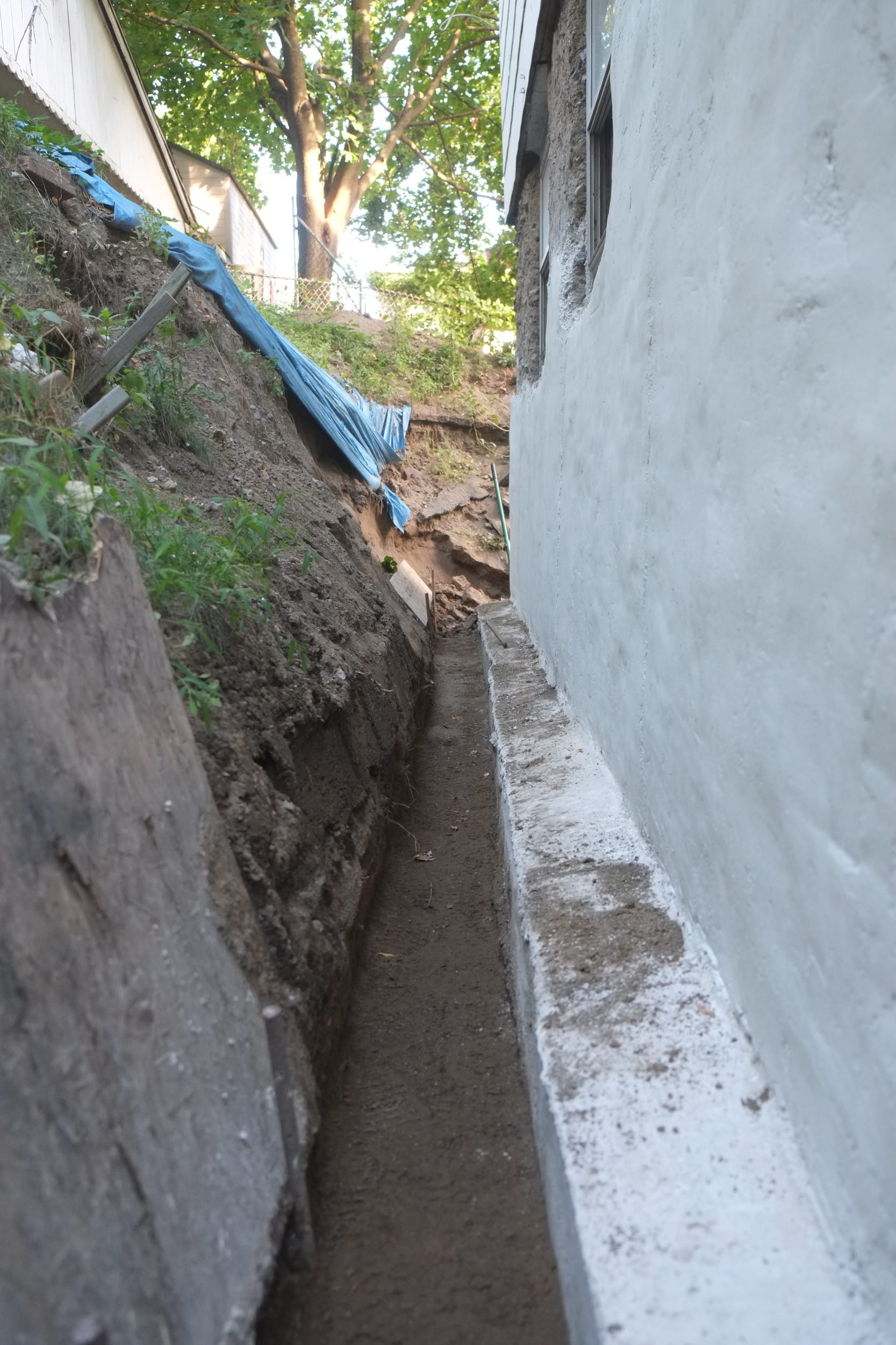 We’ve almost finished excavating the rear for our foundation drain. It did collapse in parts so I cleared that up and spent some money on some semi-decent shuttering to hold back the soil. We’re away at the moment but we couldn’t have started to fill the trench in anyway as the lime paster needs to cure for about a month.