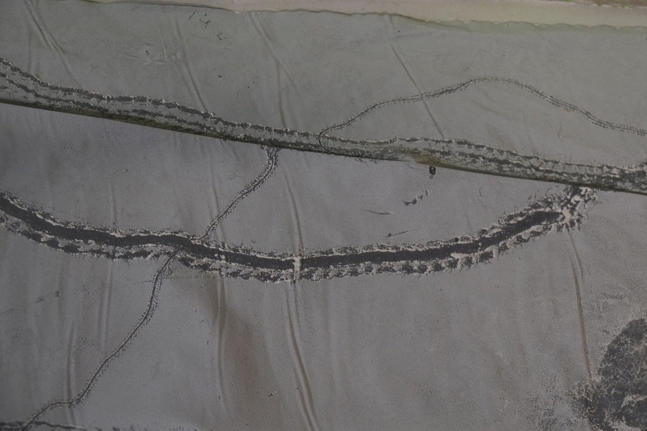 The dimple board seemed to be the perfect solution and the reason it’s called dimple board is because it has 5/16″ dimples which provide an important service. The dimples protrude towards the wall and leave an air gap for any moisture against the wall to trickle down by gravity. These dimples can withstand the pressure of the soil so remain intact when the trench has been filled. If we had gone with a flat plastic membrane, that would have been pressed flat against the wall and any water behind it would have been held there due to surface tensioning things and wouldn’t have drained.