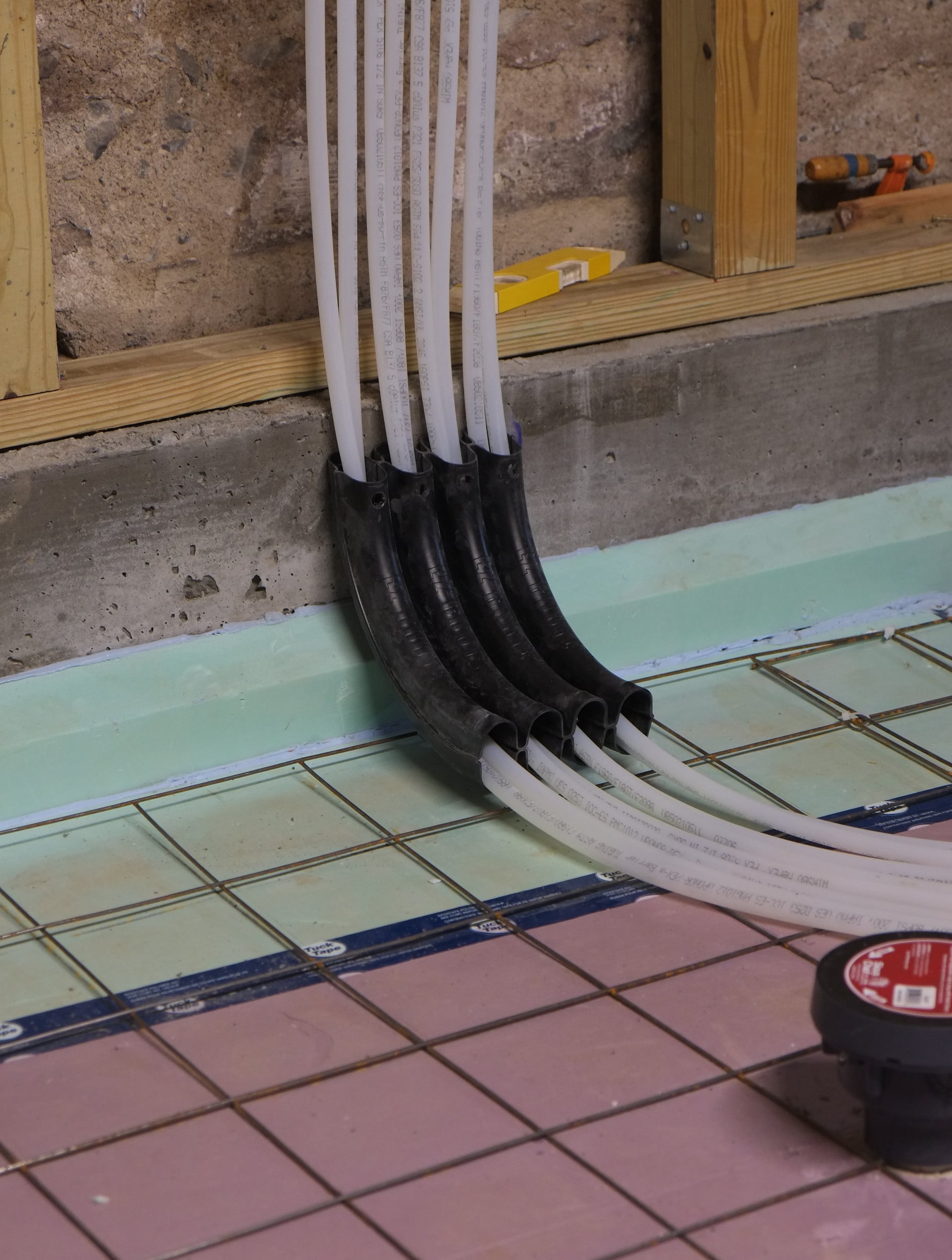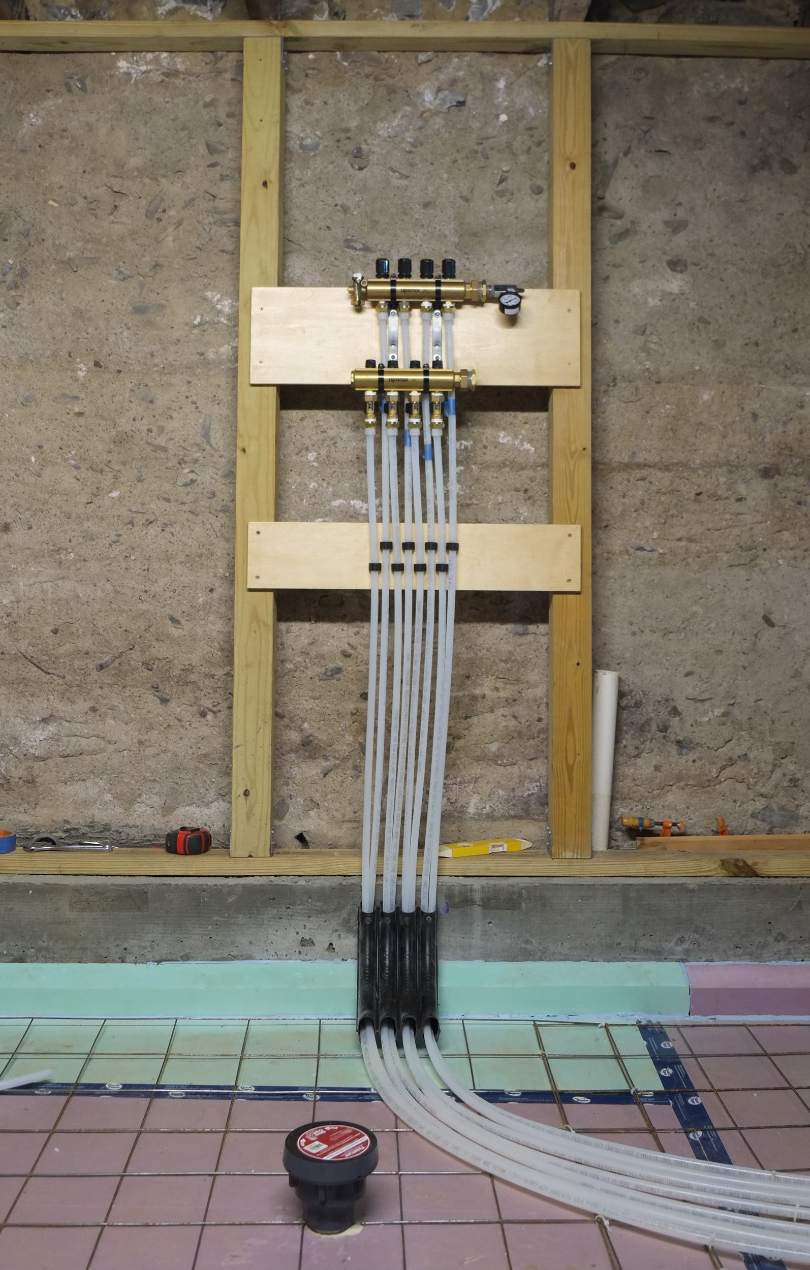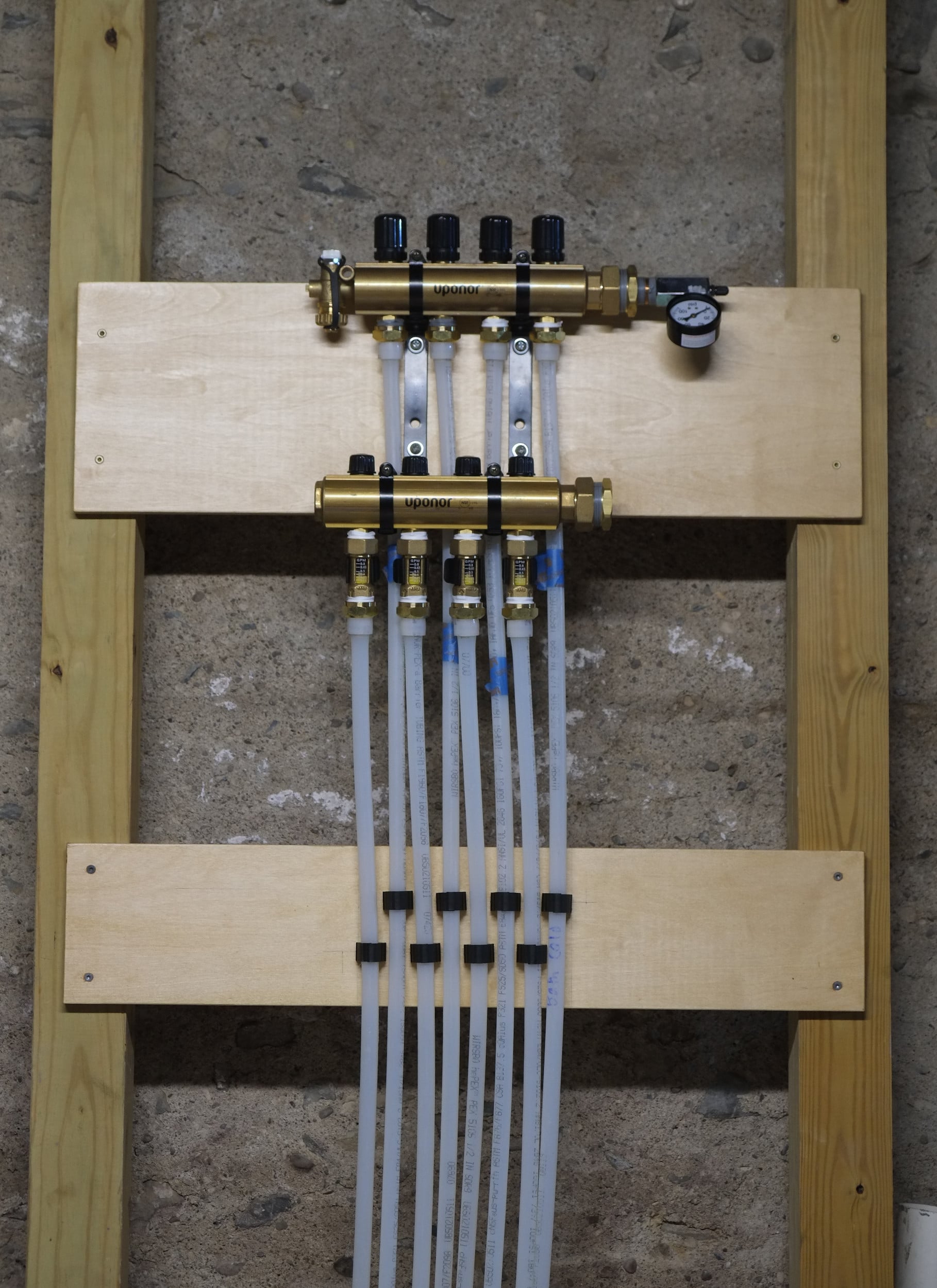 Glad to say that the radiant heating pex has finally been completed and connected to the manifold. I was hoping to pressure test the system this evening but our inflator only has a cigarette style power input.
