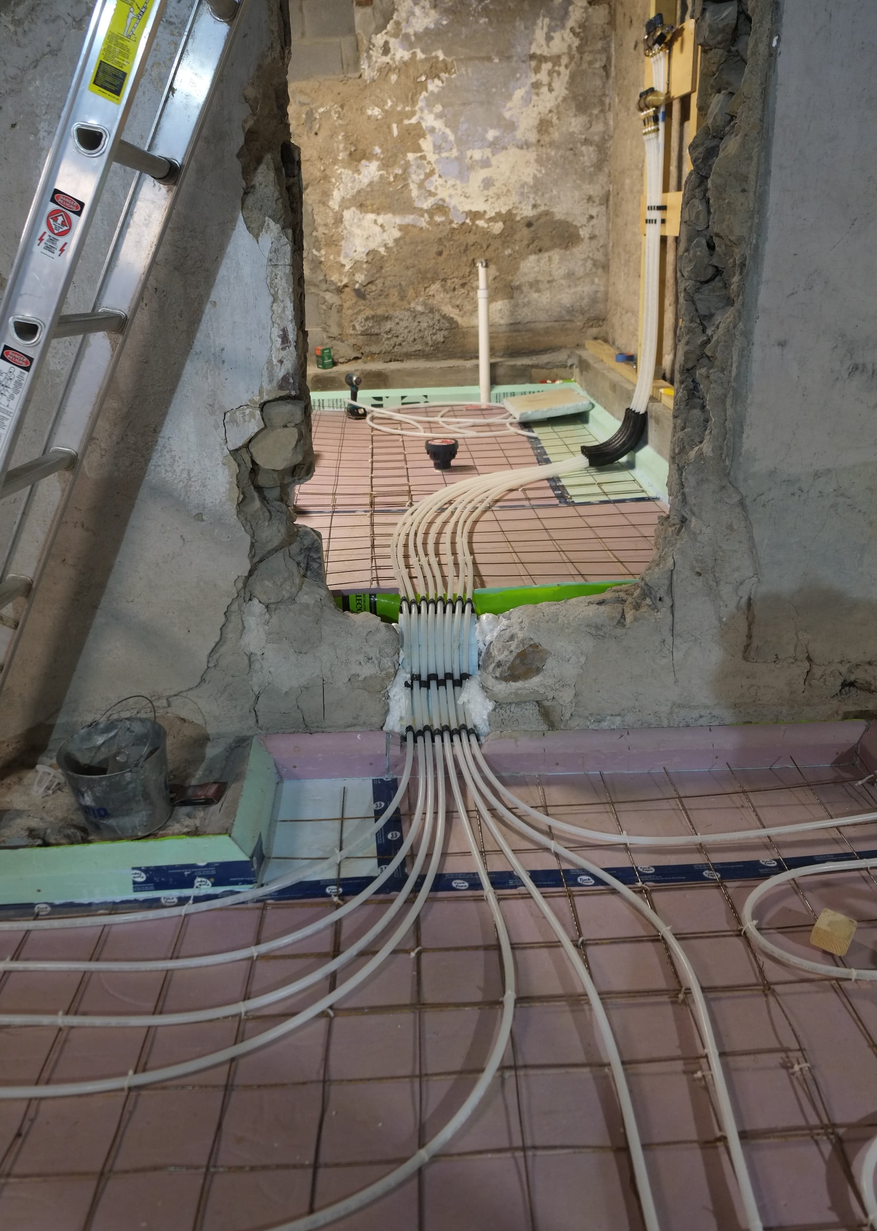 Final thickness of the concrete was about 4 & 1/2 – 5″ which is a decent thickness and we also added rebar mesh supports to lift the rebar and radiant tubing to the top third of the slab, this will make the radiant heating system more efficient and responsive. We also managed to drop this new floor by about 5″ giving us a little more headroom.