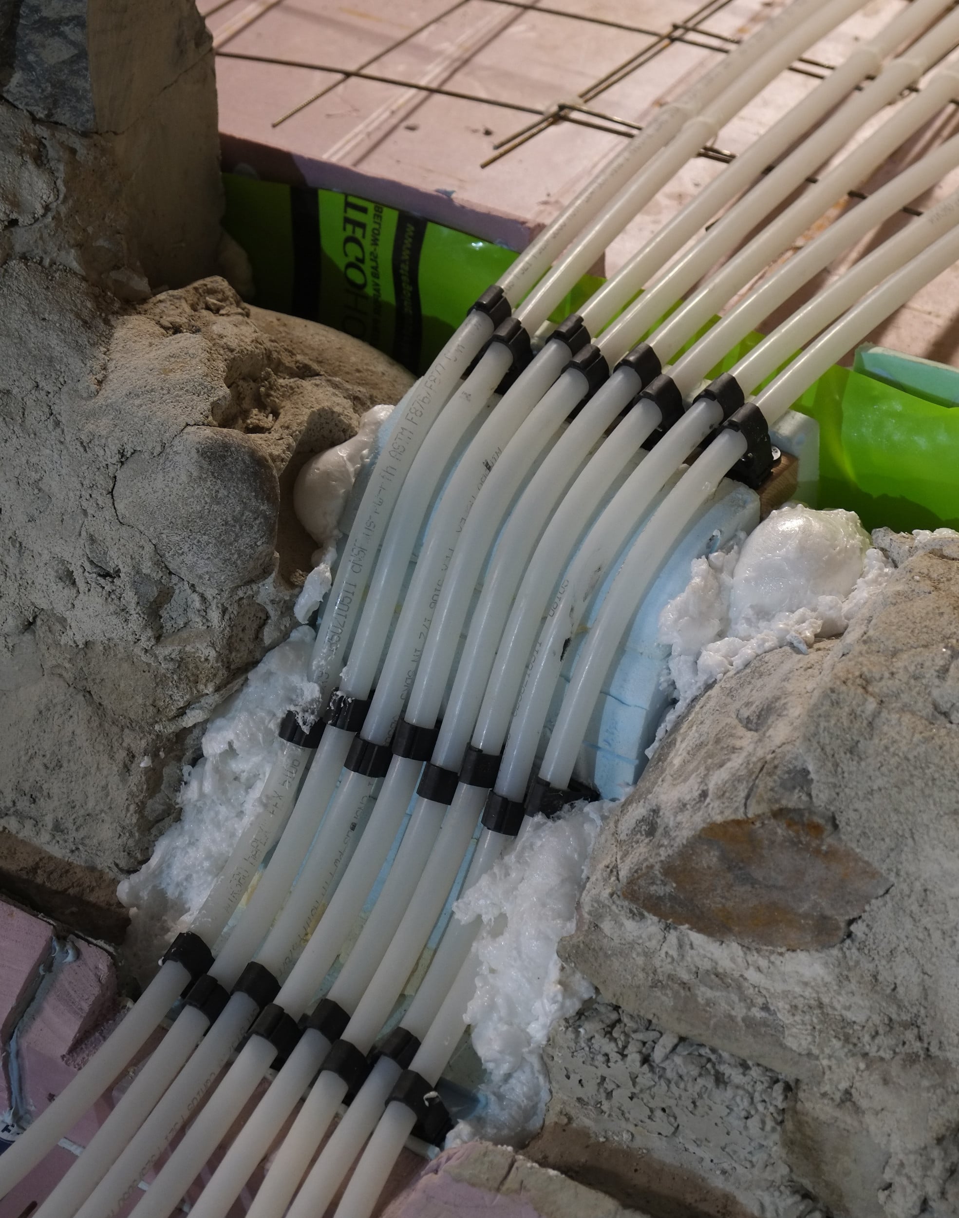 The last few shots were just before the pour and shows how we used small supports (known as chairs in the trade) to lift up the rebar mesh and Pex tubing. Concrete guys don’t really like these but Dave from the building department wanted them and I think that was a good call.