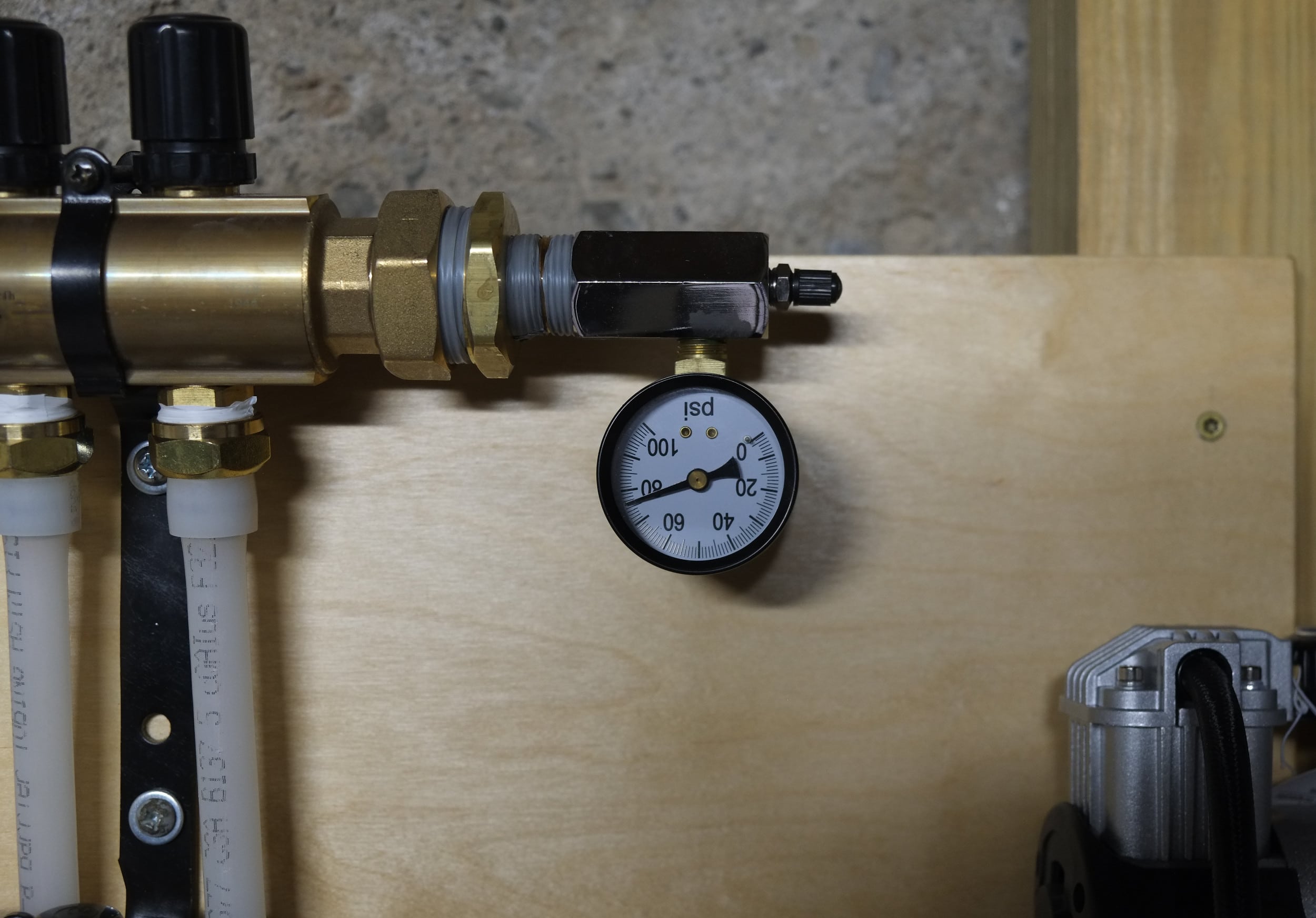 Bought an air inflator today and started pressure testing the pex system. There were a few obvious leaks and they were fixed by tightening some fitting. Pressurised the system to 75 psi which is a lot more than the operating pressure but is what’s recommended. I’ll check back tomorrow and fingers crossed it will be at the same pressure give or take a few psi to account for changes in ambient temperature and pipe expansion.