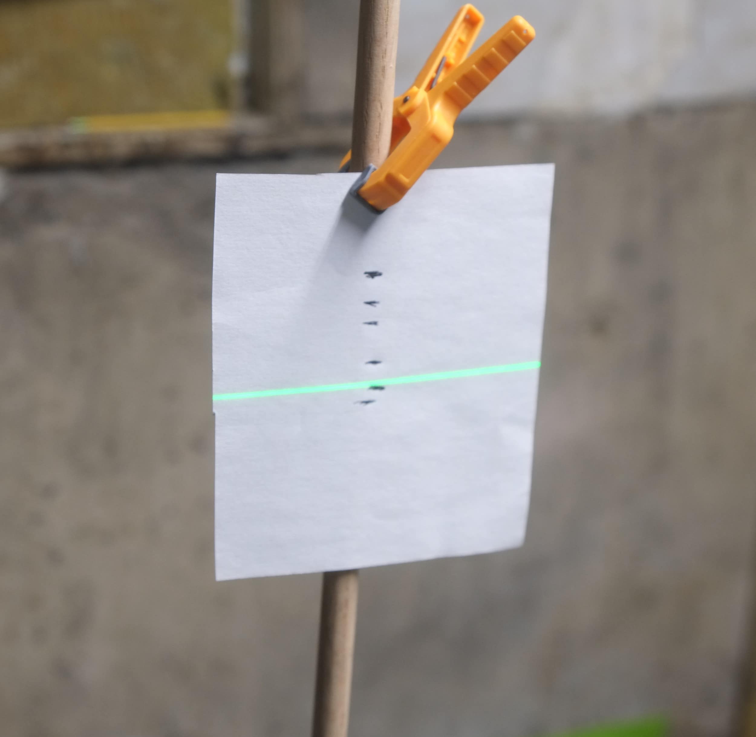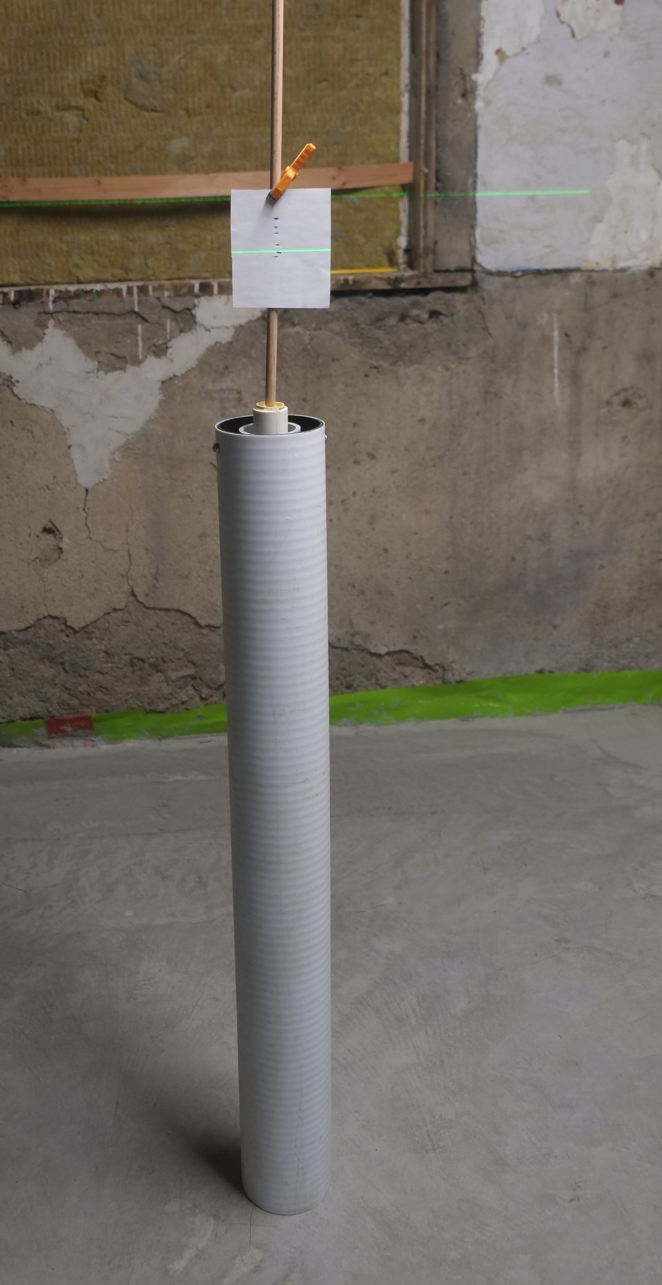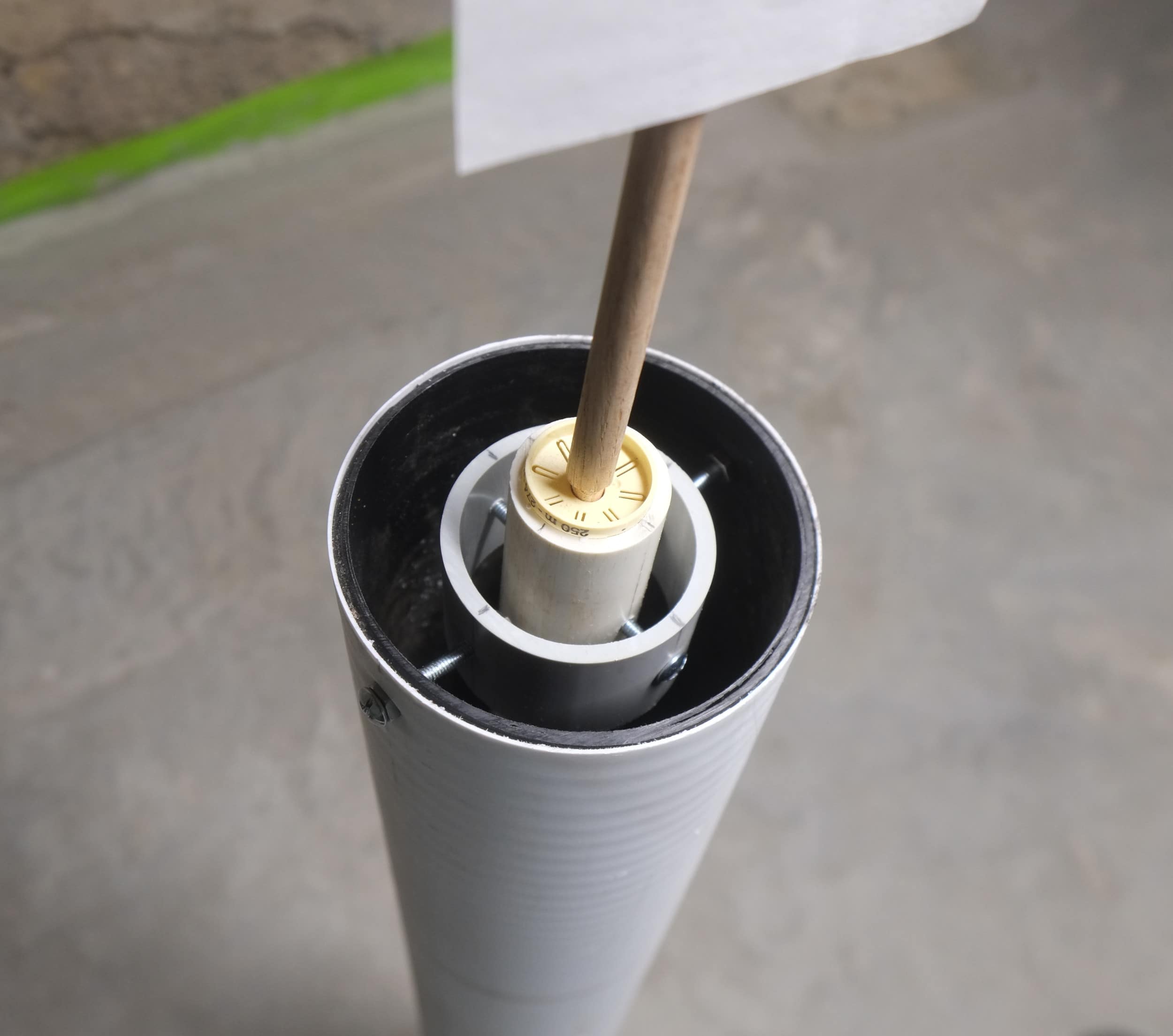 So I didn’t didn’t have to keep checking that my measuring stick was completely vertical I made a 2-axis gimbal out of pvc pipes, some machines screws, part of a sewing reel and a dowel rod. Using this I can just place it and the dowel rod is always vertical.
